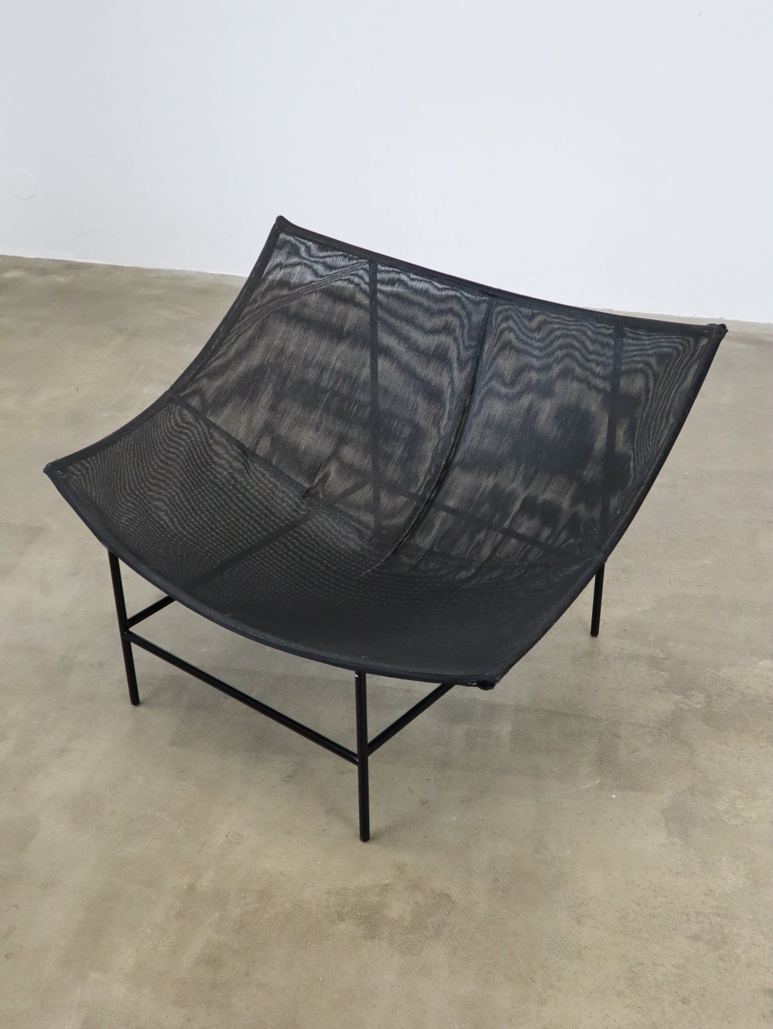 The 'Butterfly' lounge chair, a Dutch Design favorite, was designed by Gerard van den Berg for Montis and was first produced in the 1980s. The chair includes a black leather seat hanging from a black aluminum frame.