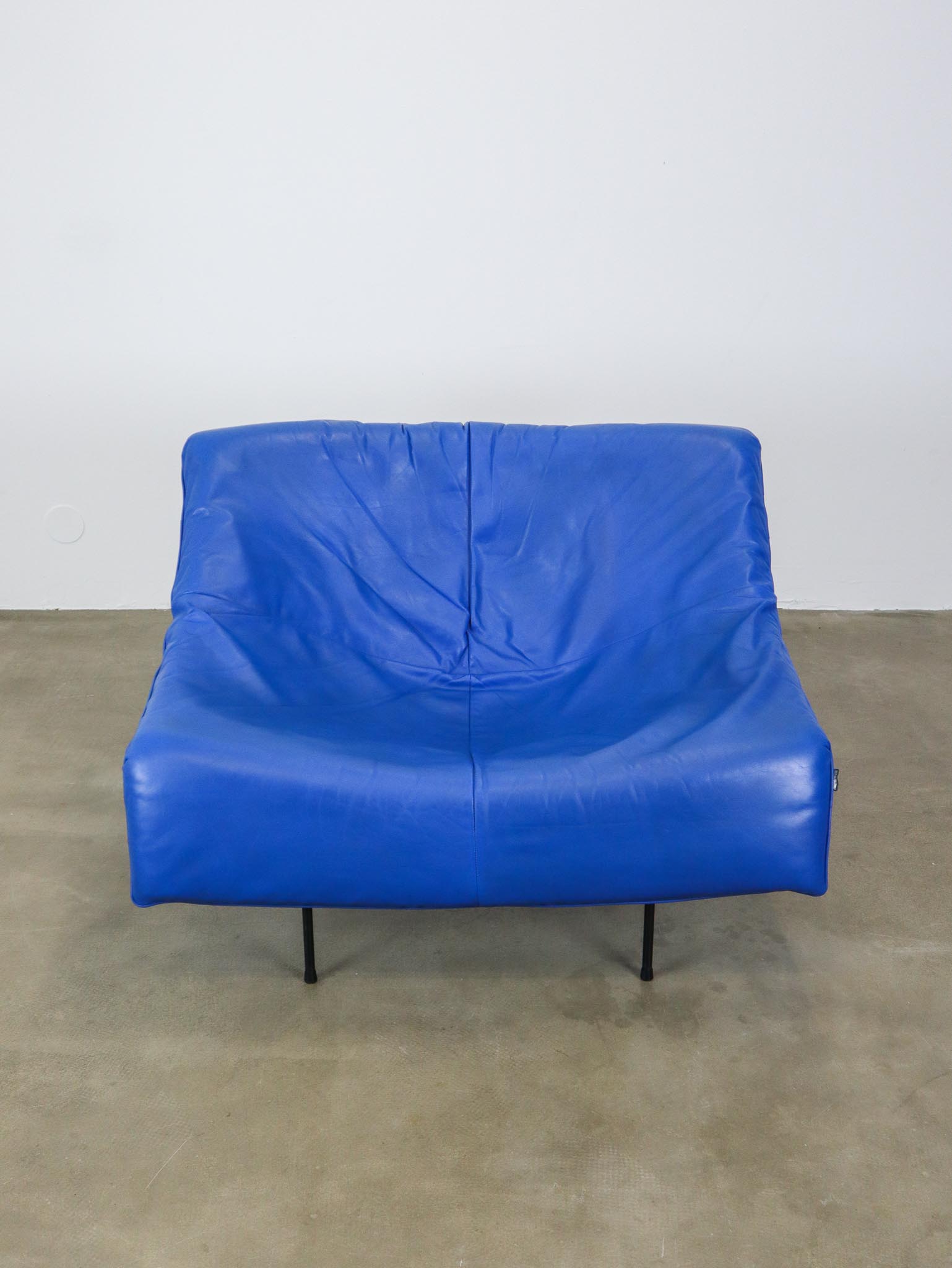 This particular color combination is hard to find, and usually when we find it, the color of the leather is extremely faded. That's why we offer this color made-to-order. We will hand paint the leather seat of an original vintage piece, in this exact color blue. The lead time is 2 - 3 weeks.