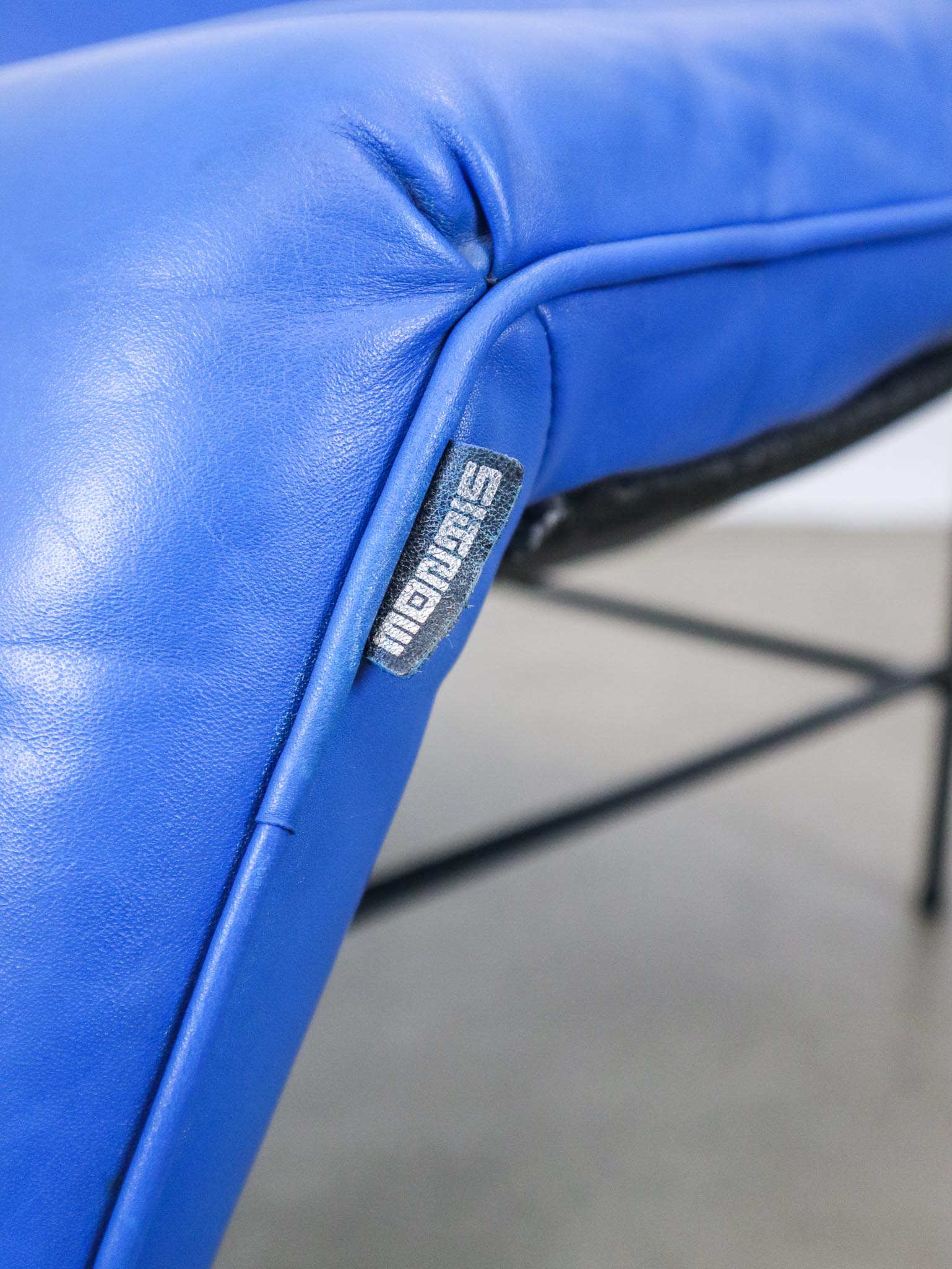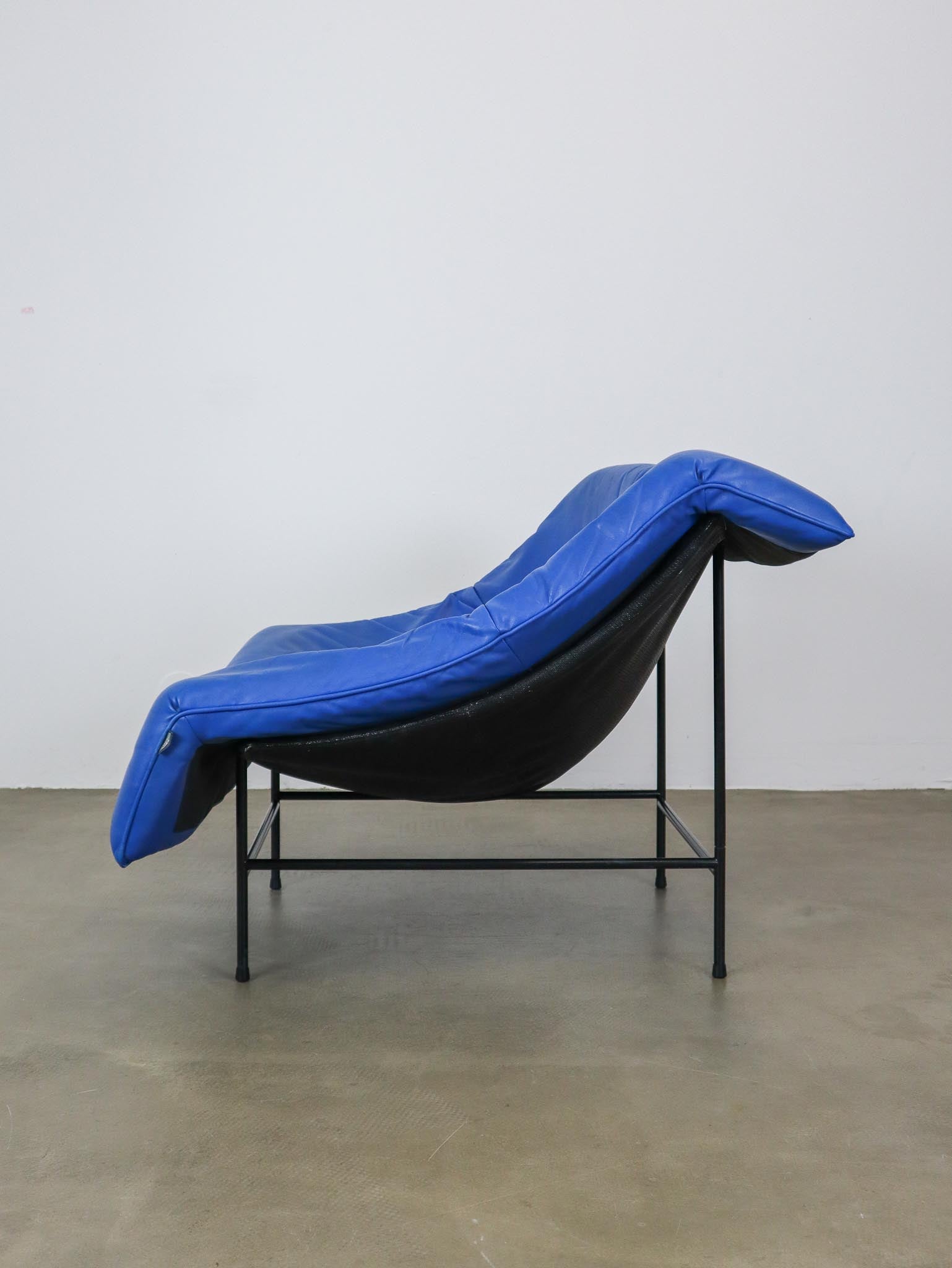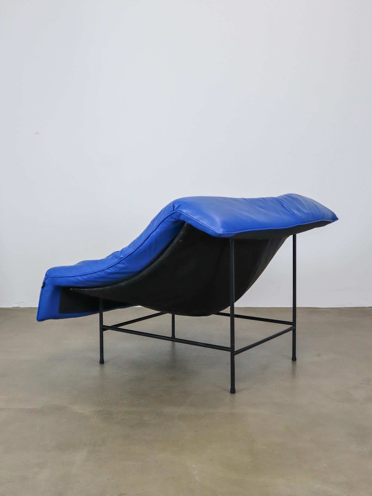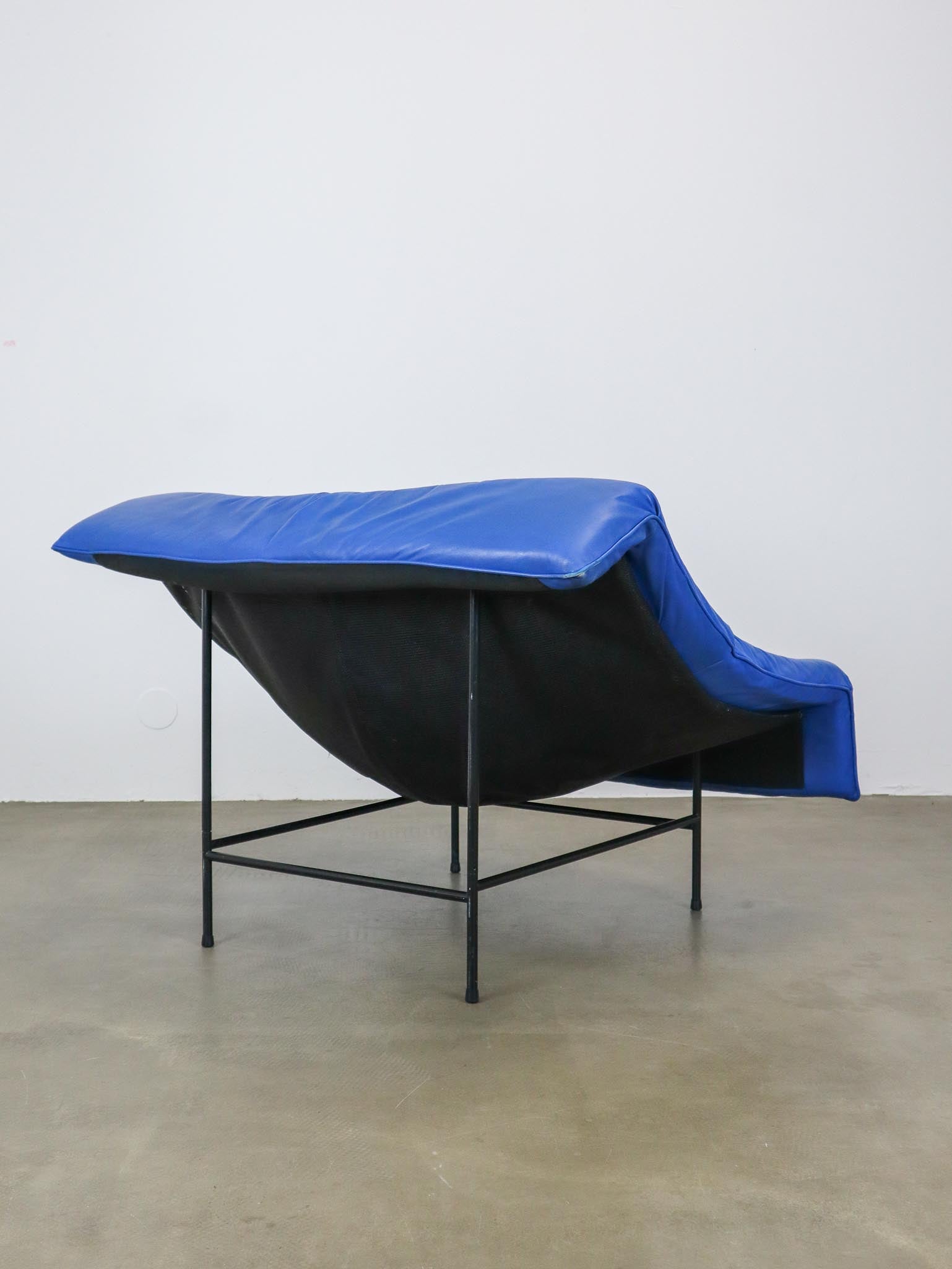The 'Butterfly' lounge chair, a Dutch Design favorite, was designed by Gerard van den Berg for Montis and was first produced in the 1980s. The chair includes a blue leather seat hanging from an black aluminum frame.