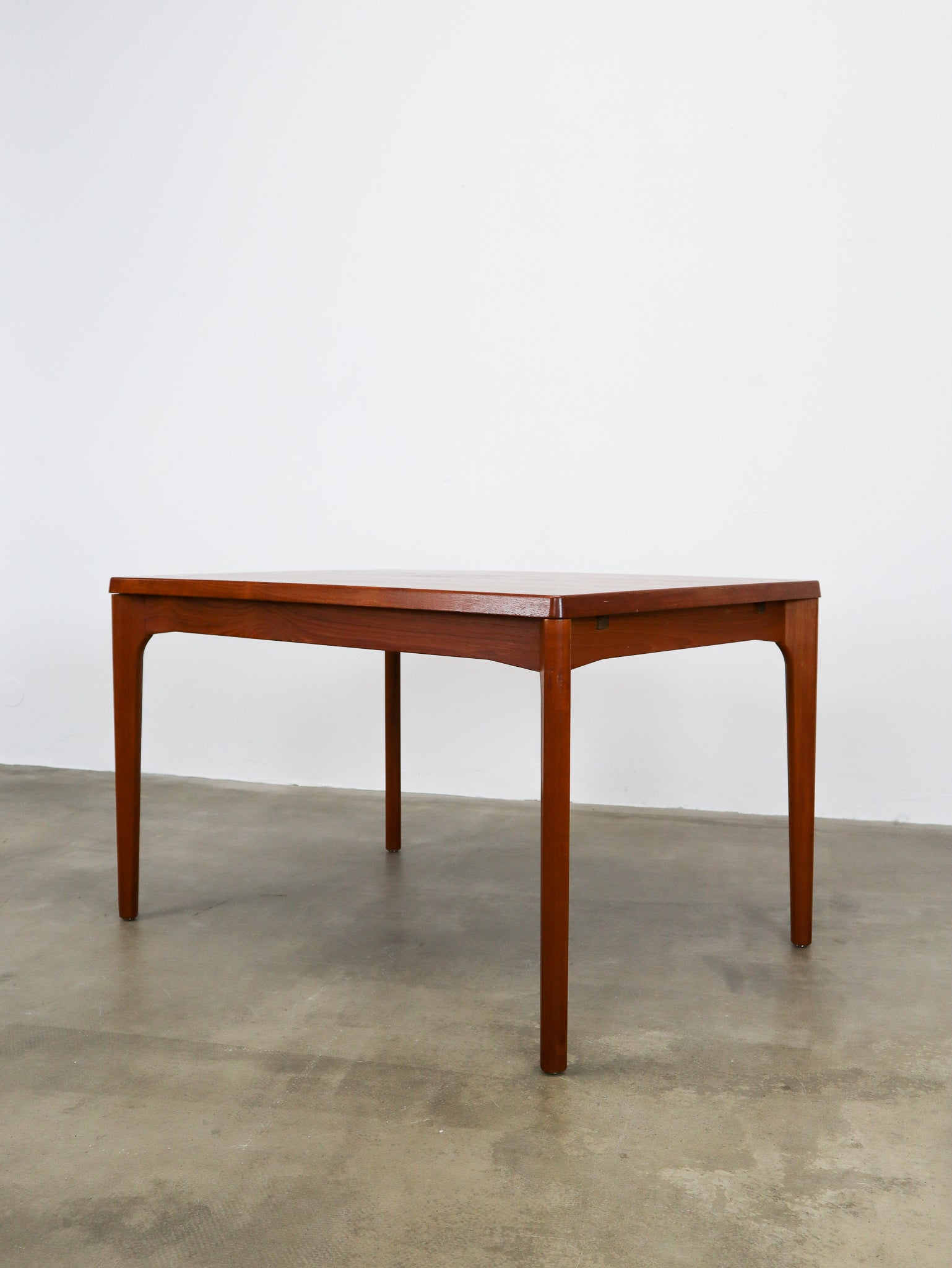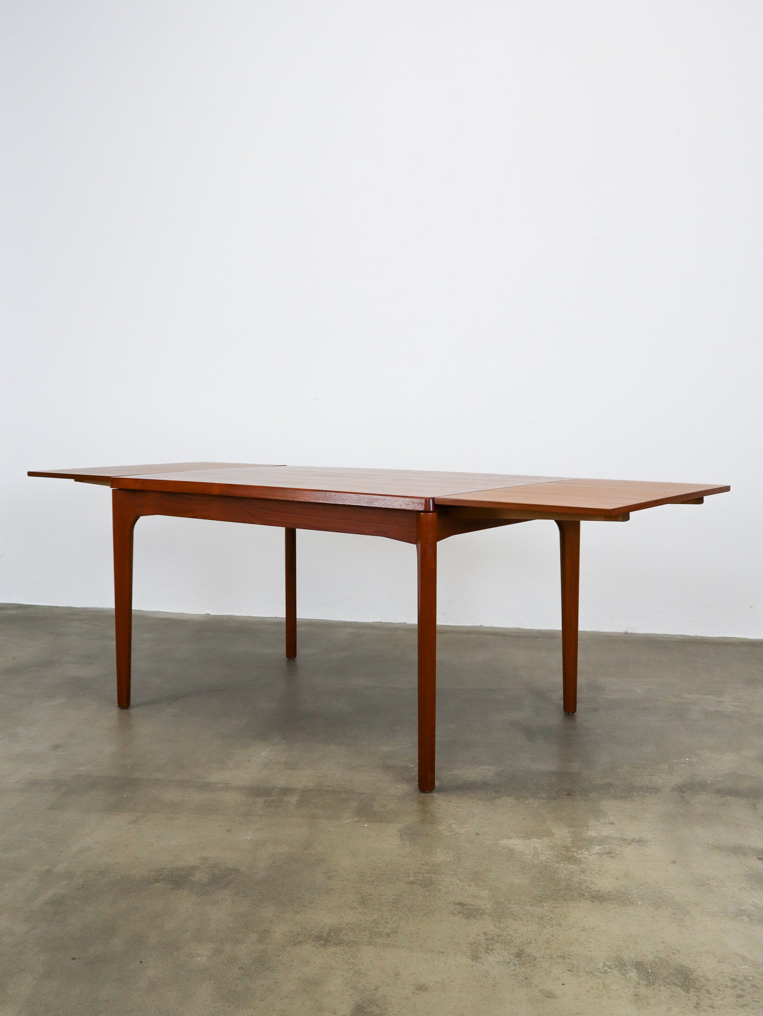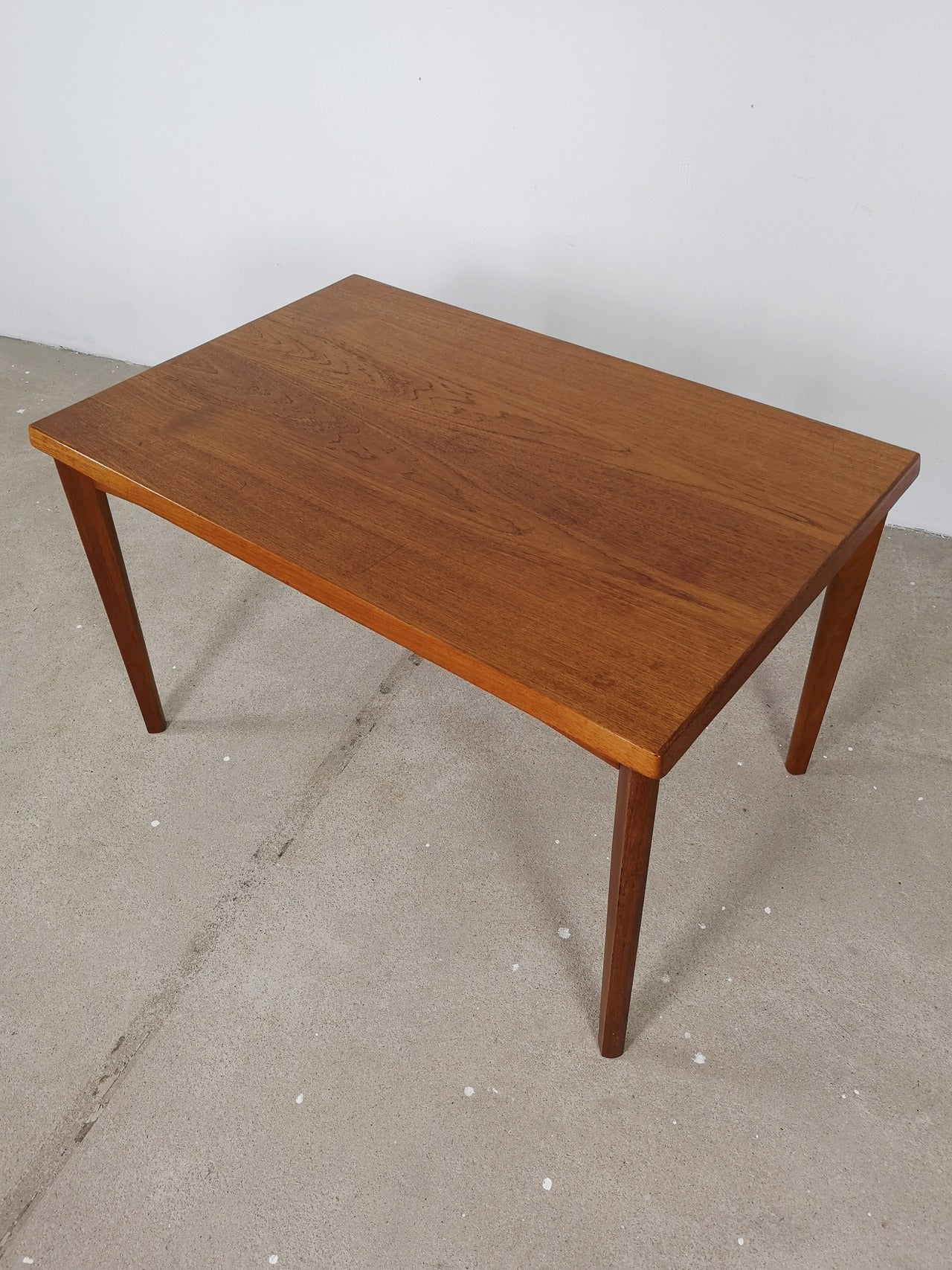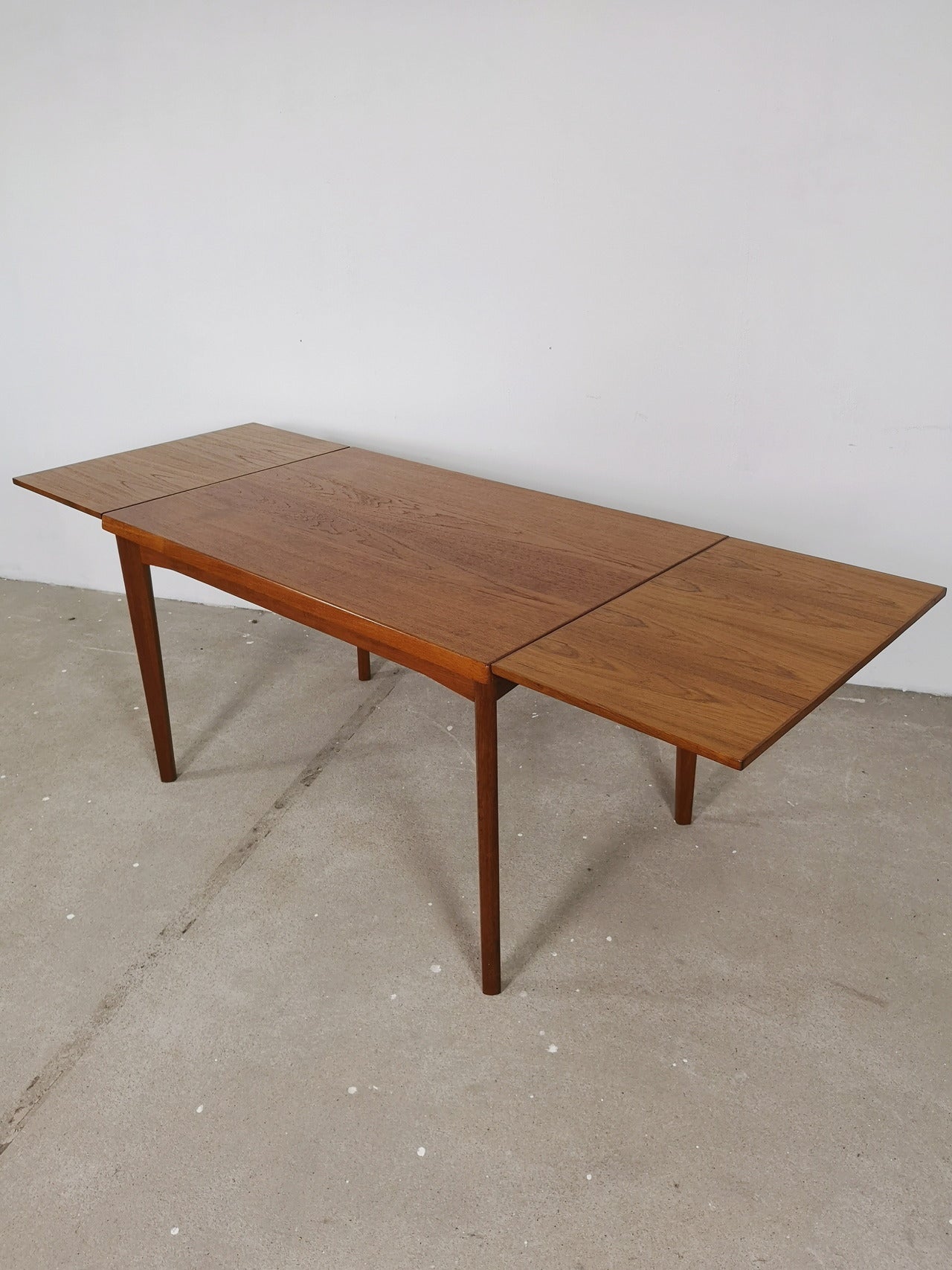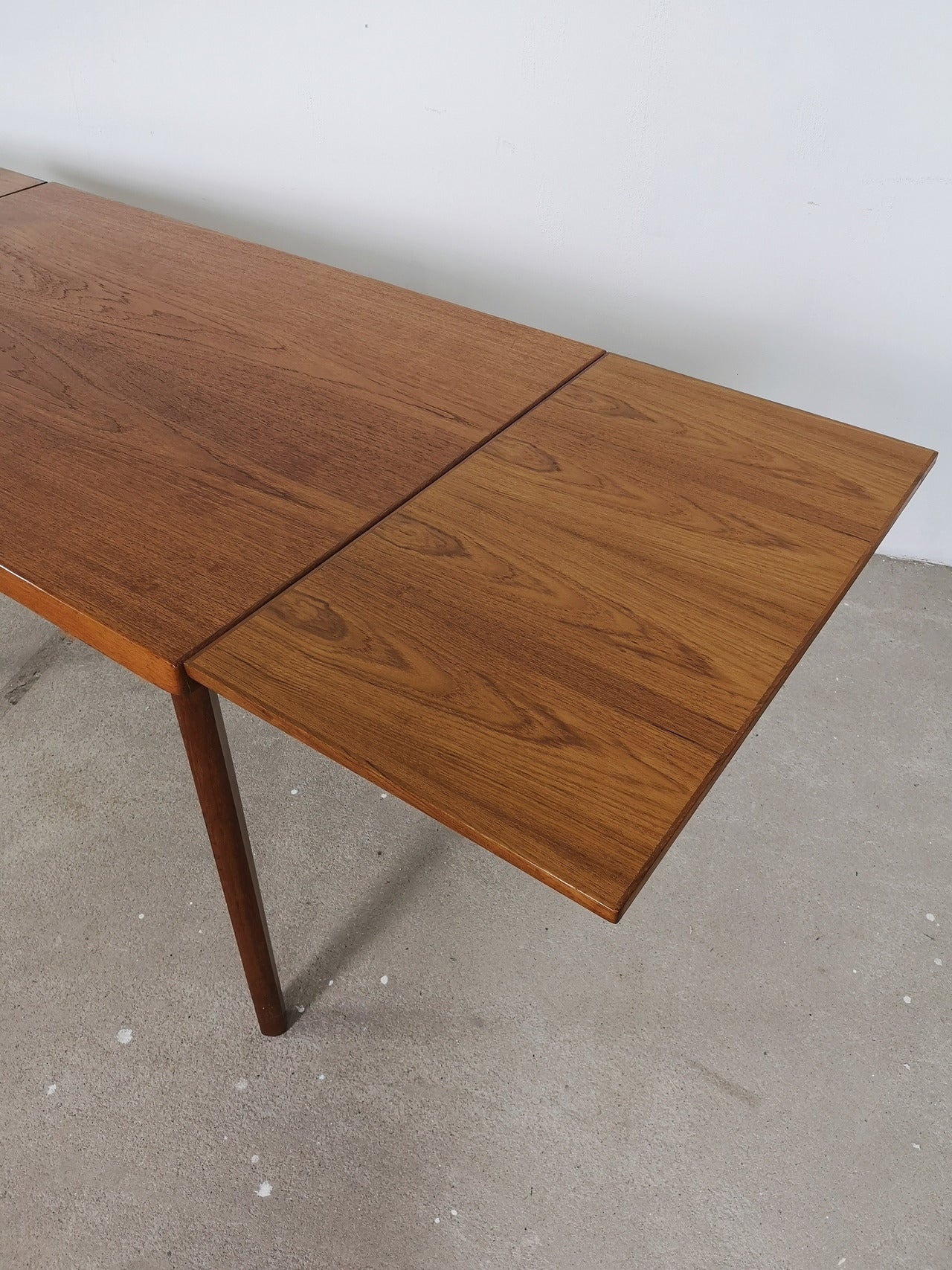Beautifully finished mid-century Danish dining table made of teak, with two expendable leafs under the top on each side (45cm per leaf). The table has space for four to six people.
