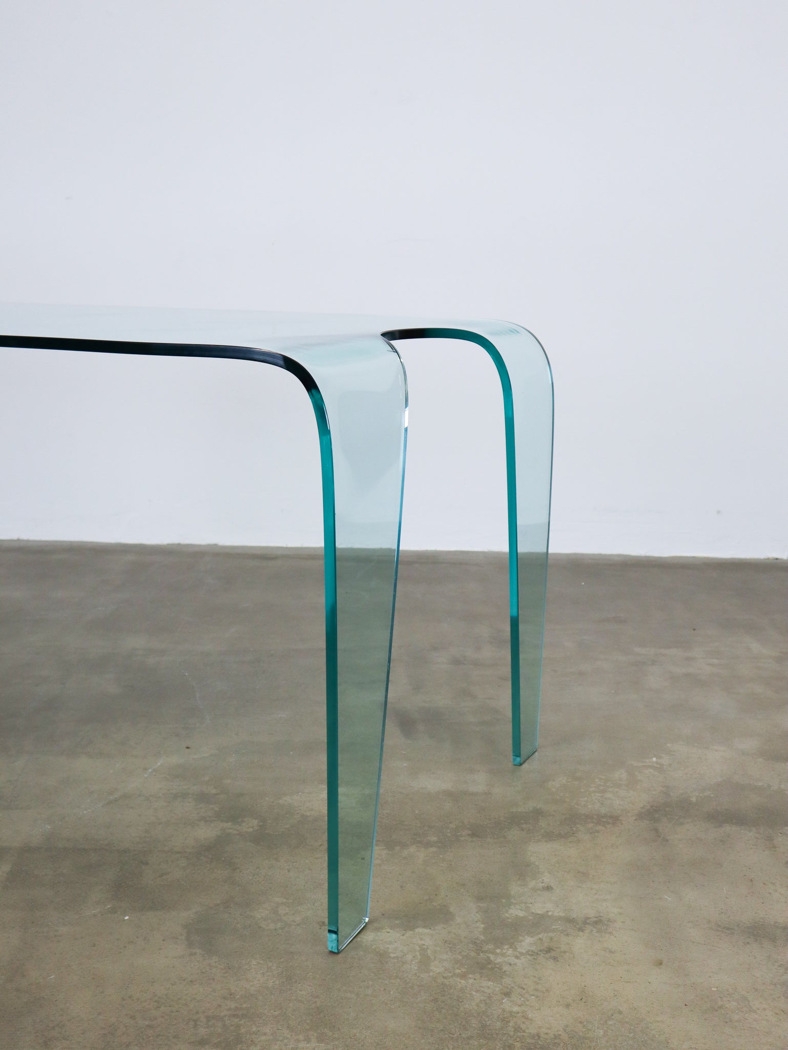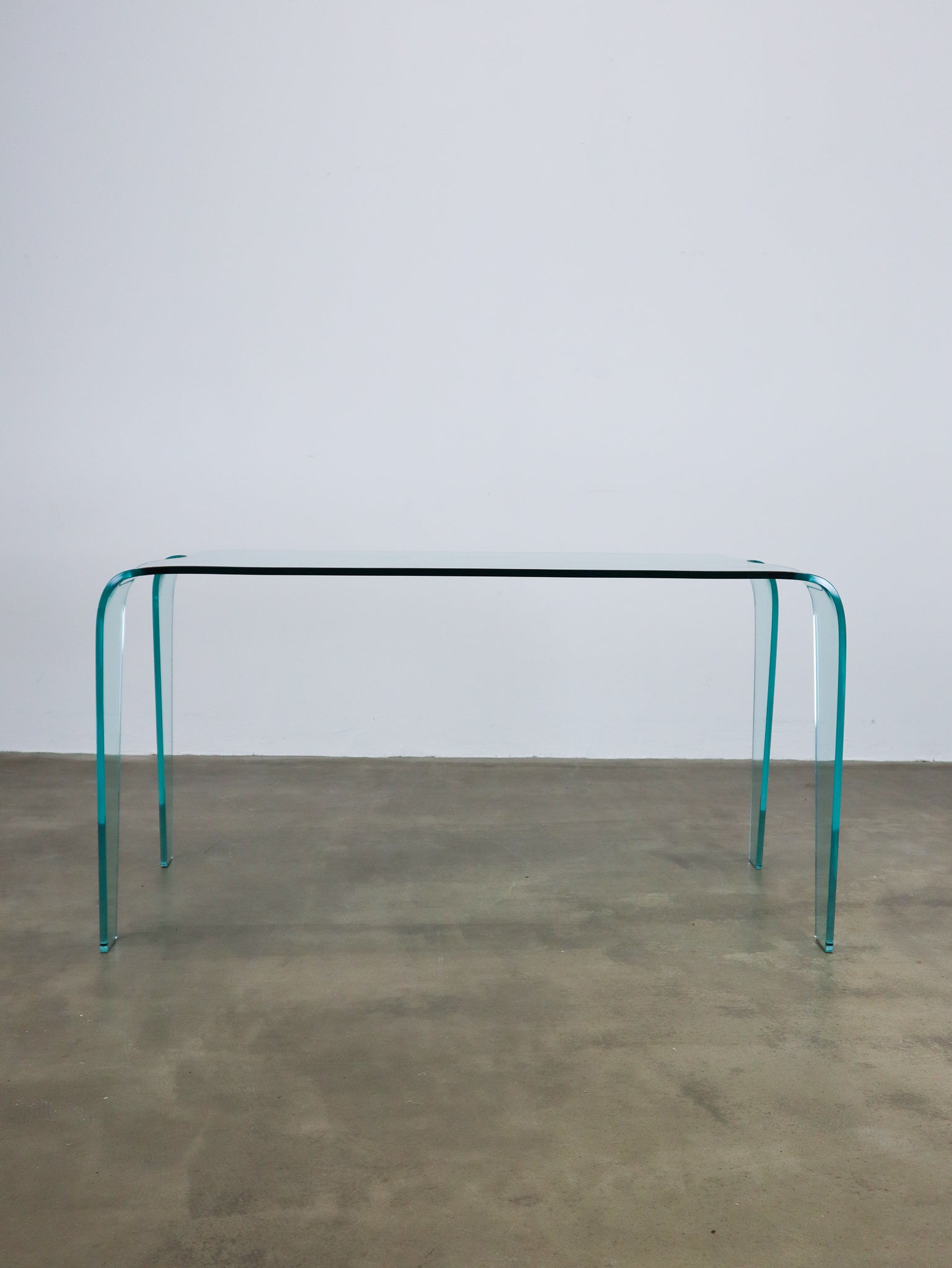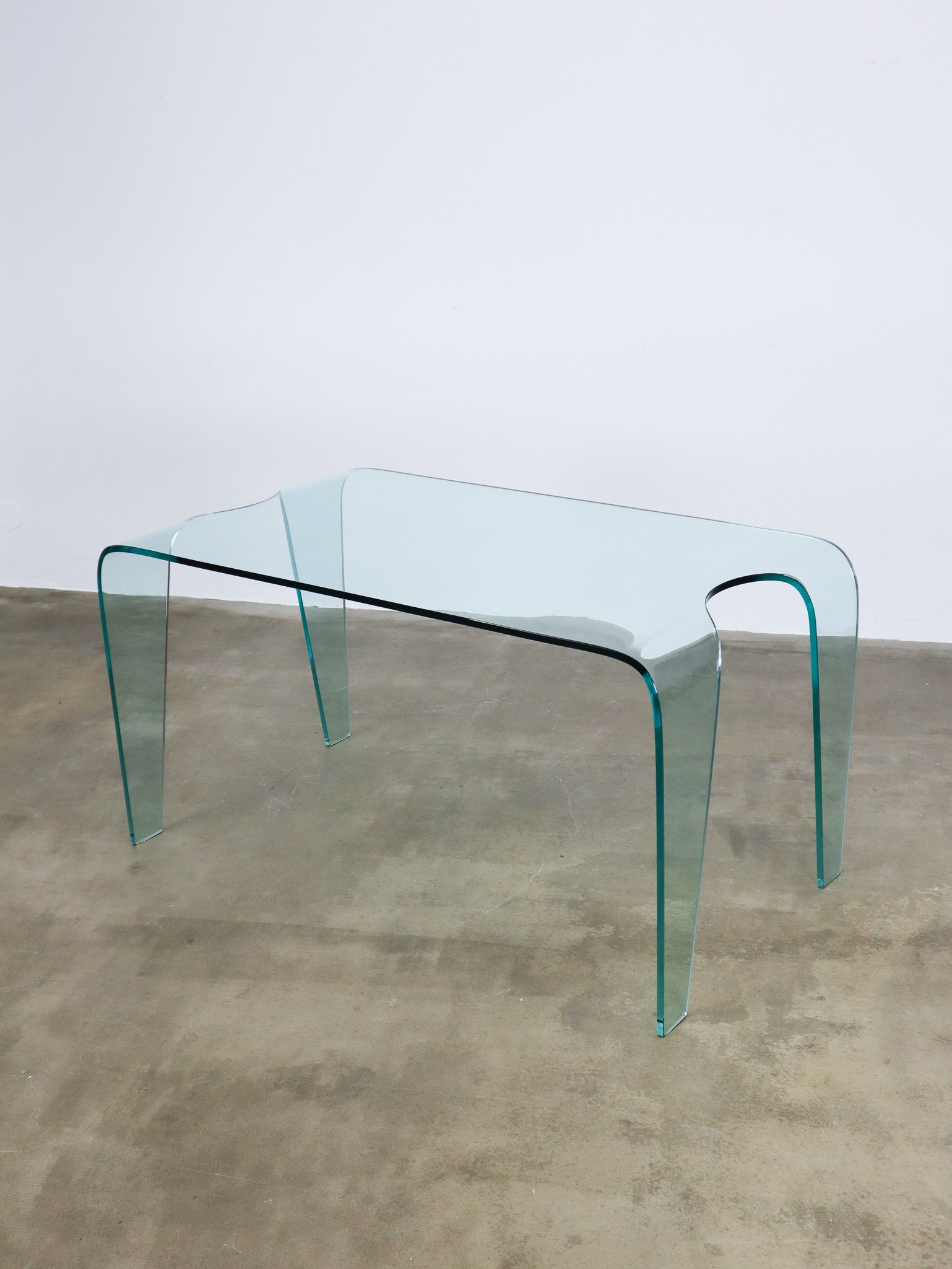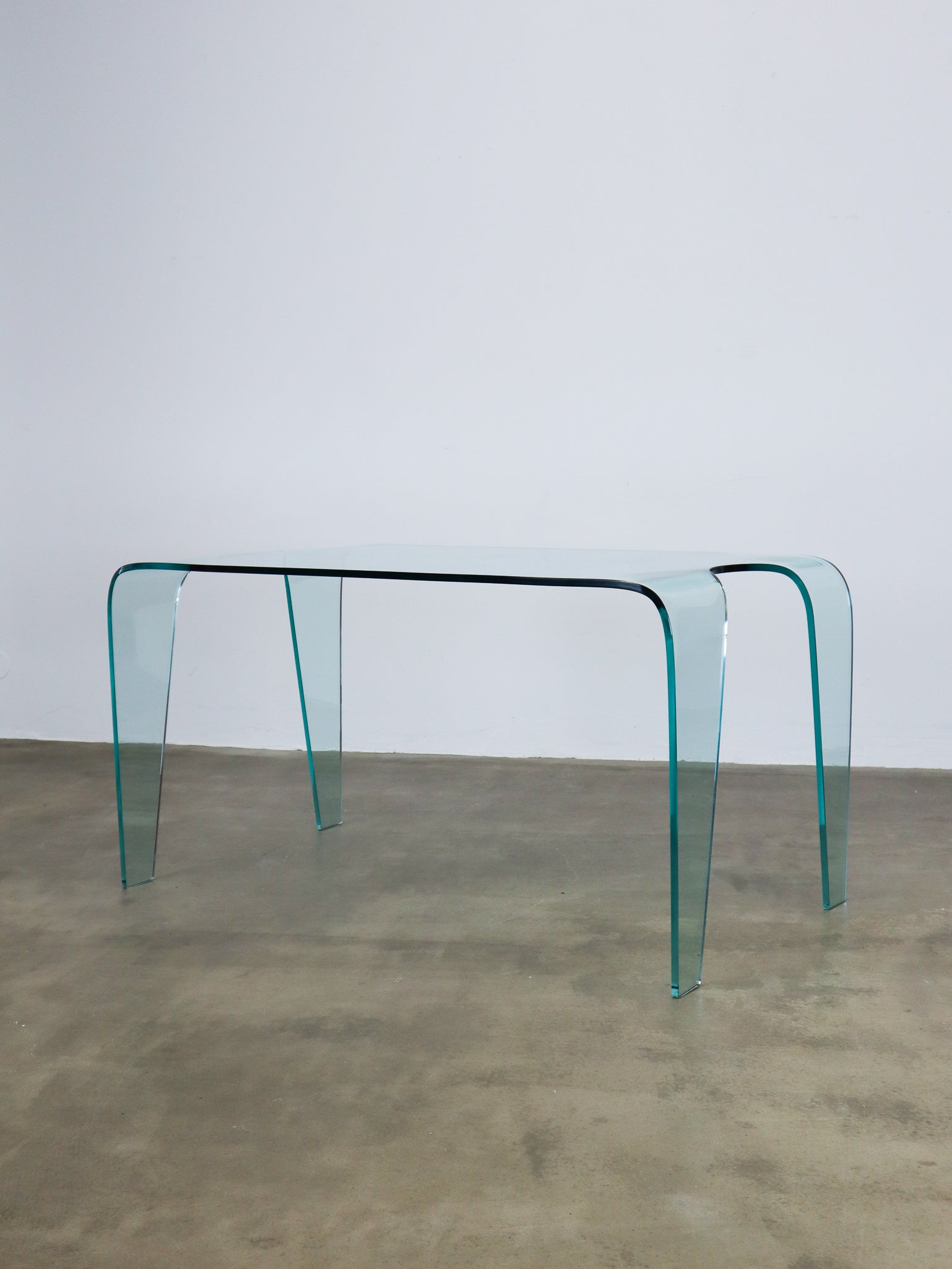 Amazing glass table made out of one piece of heavy glass, with legs that bend down from the table top in a curved shape. This table has the perfect measurements to be used as a dining table for four or as a spacious desk.