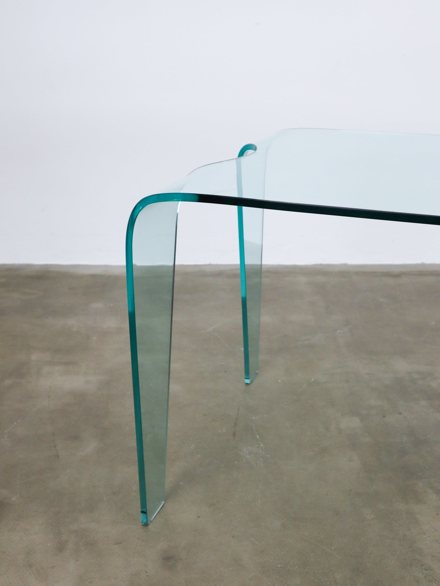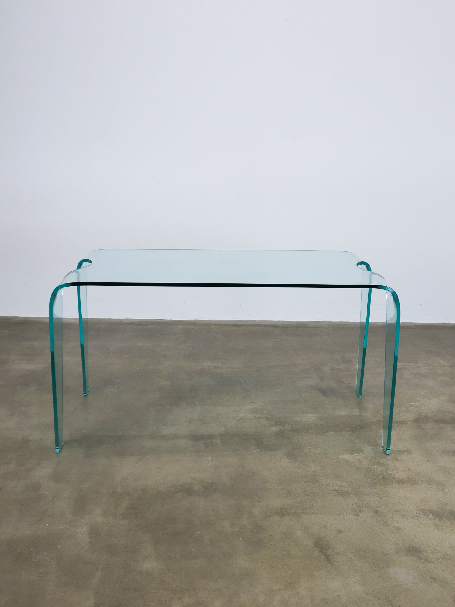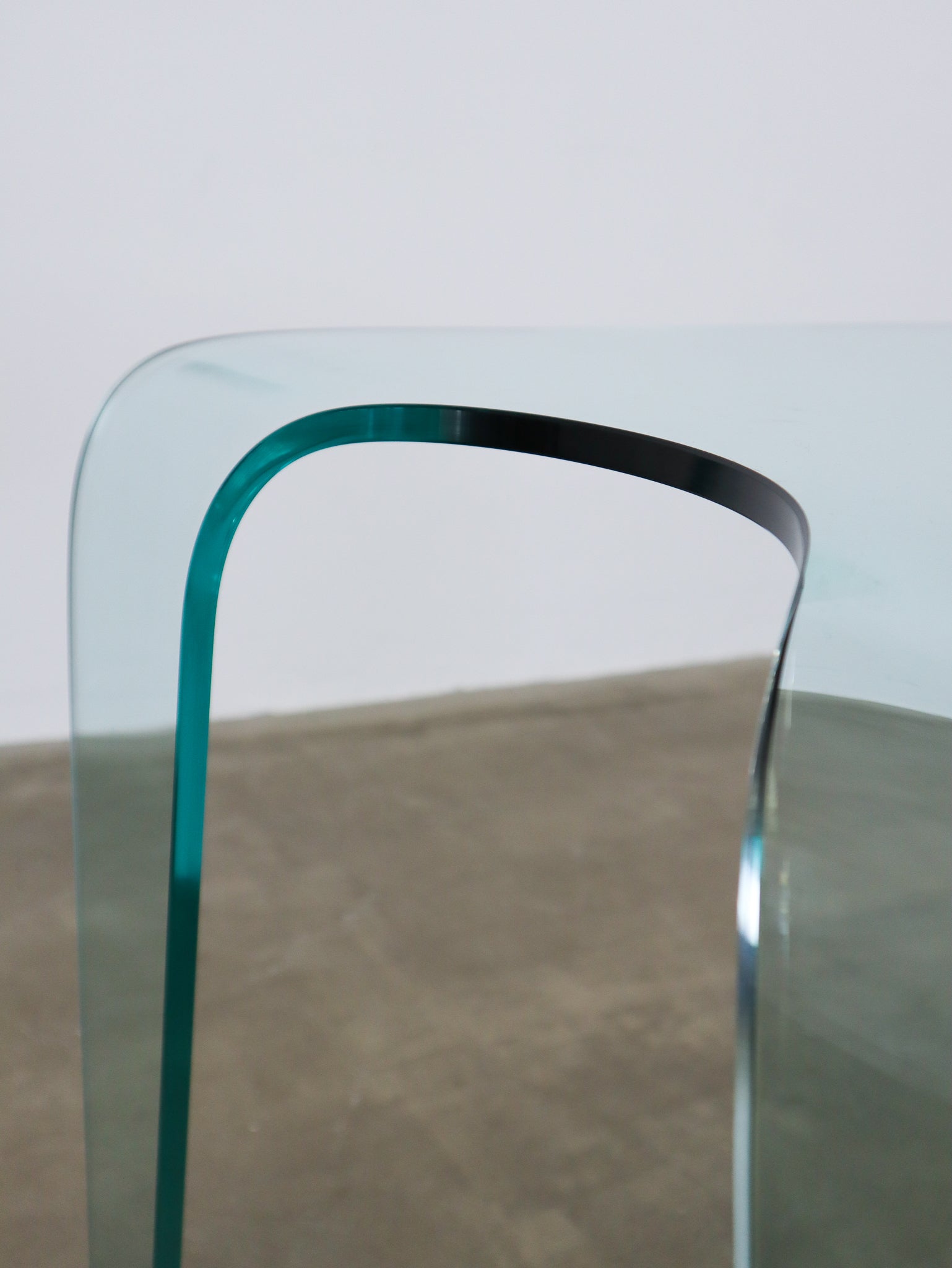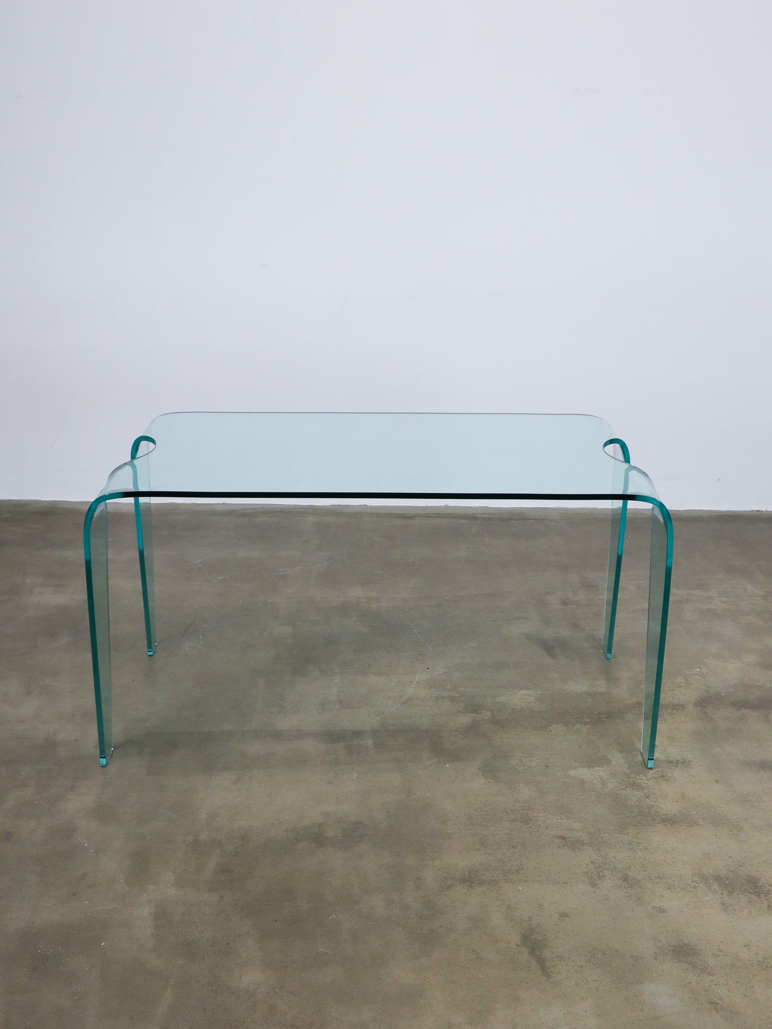 Amazing glass table made out of one piece of heavy glass, with legs that bend down from the table top in a curved shape. This table has the perfect measurements to be used as a dining table for four or as a spacious desk.