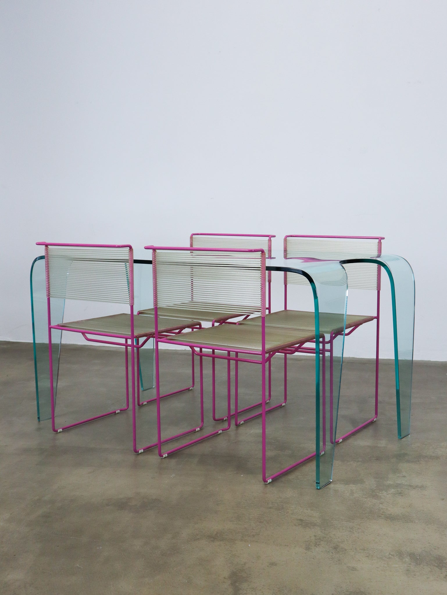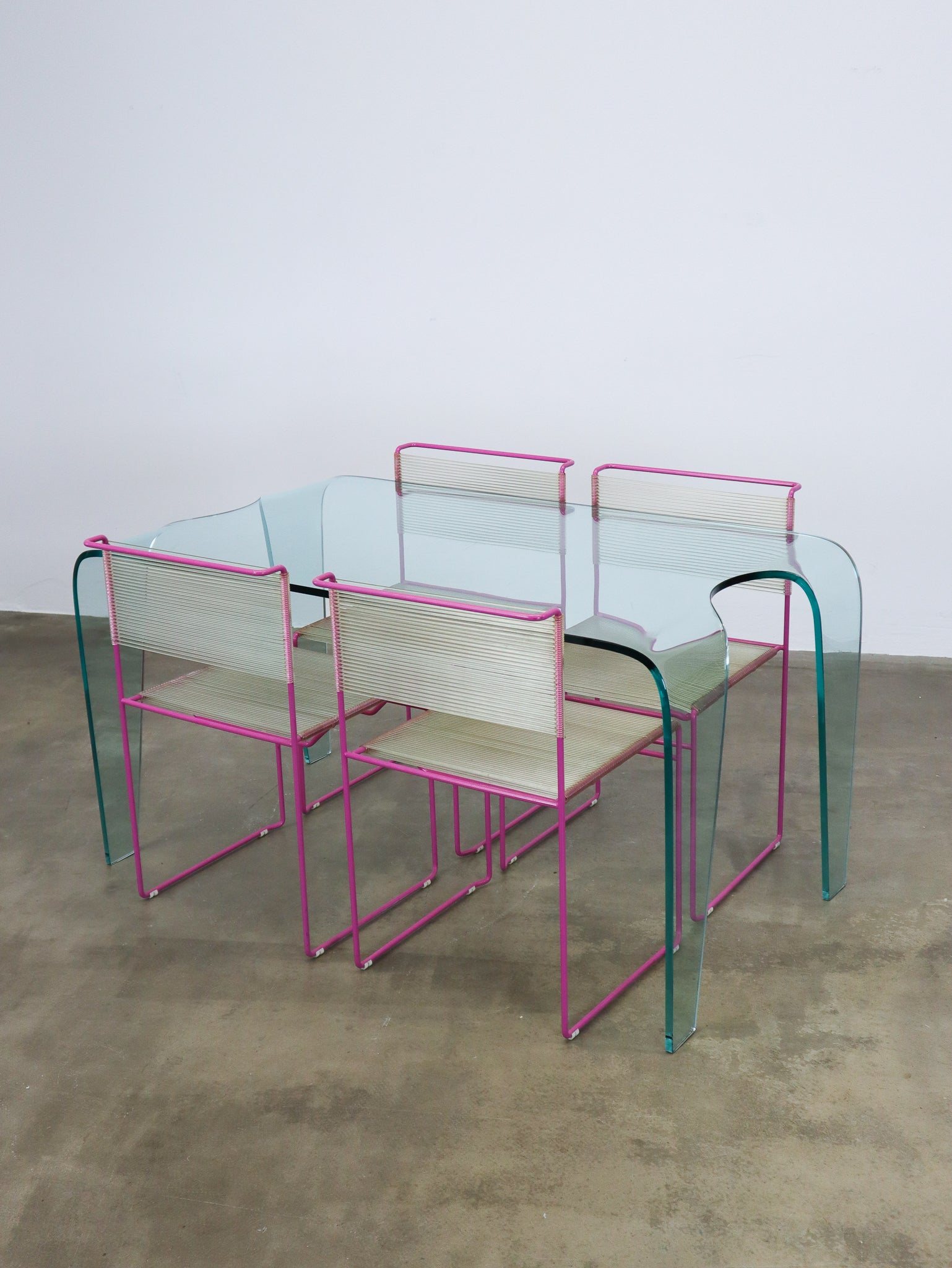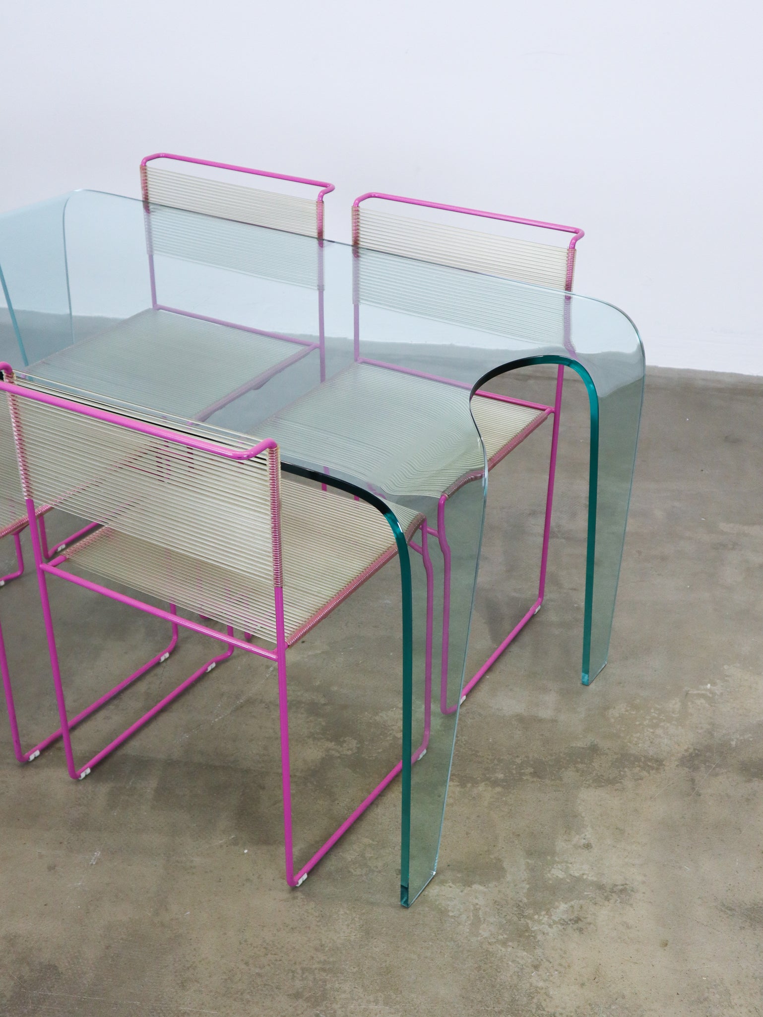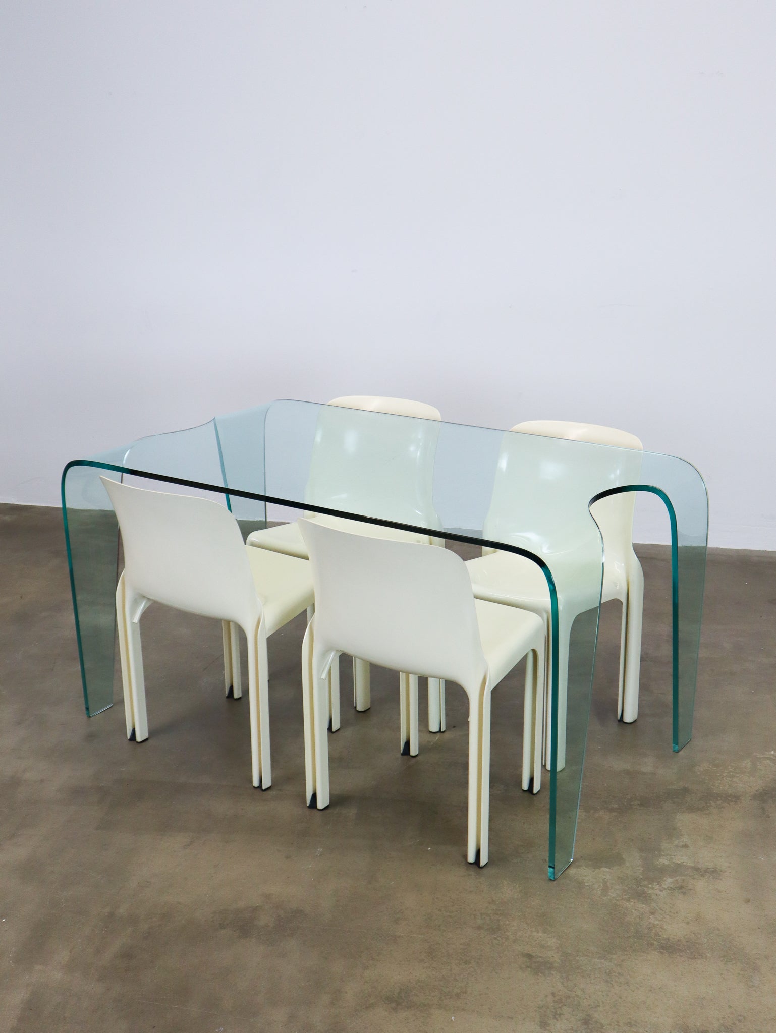 Amazing glass table made out of one piece of heavy glass, with legs that bend down from the table top in a curved shape. This table has the perfect measurements to be used as a dining table for four or as a spacious desk.
