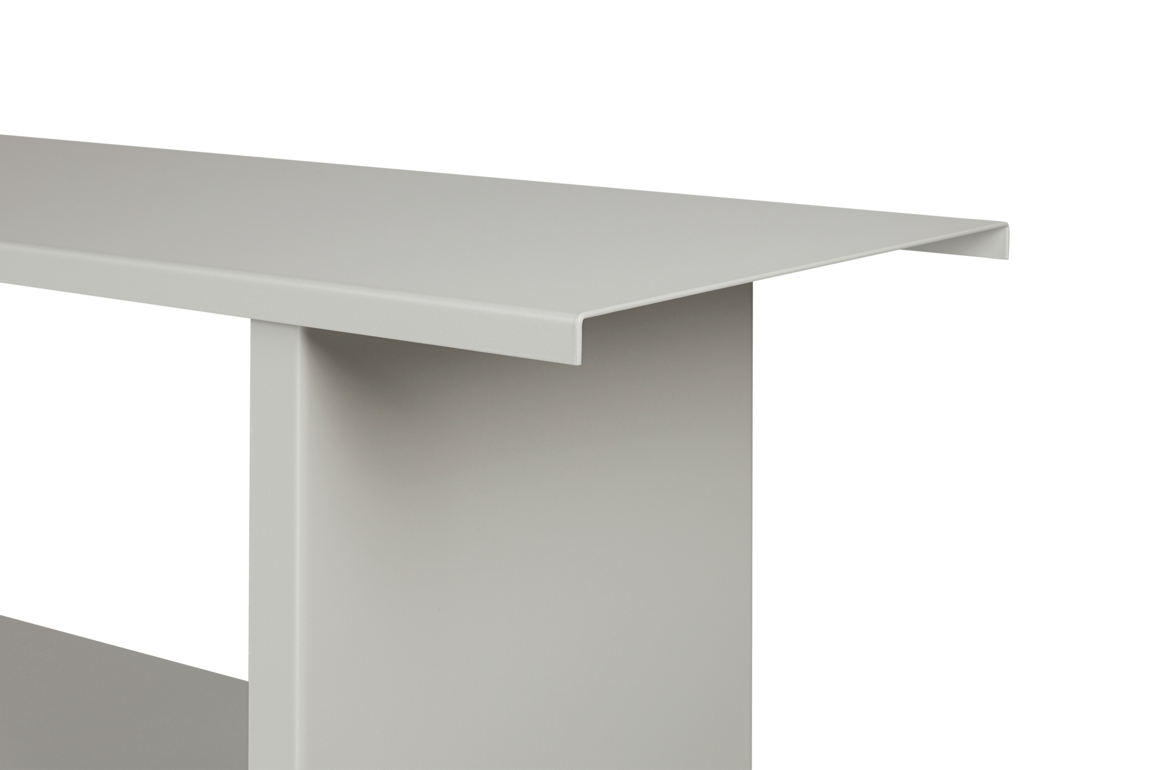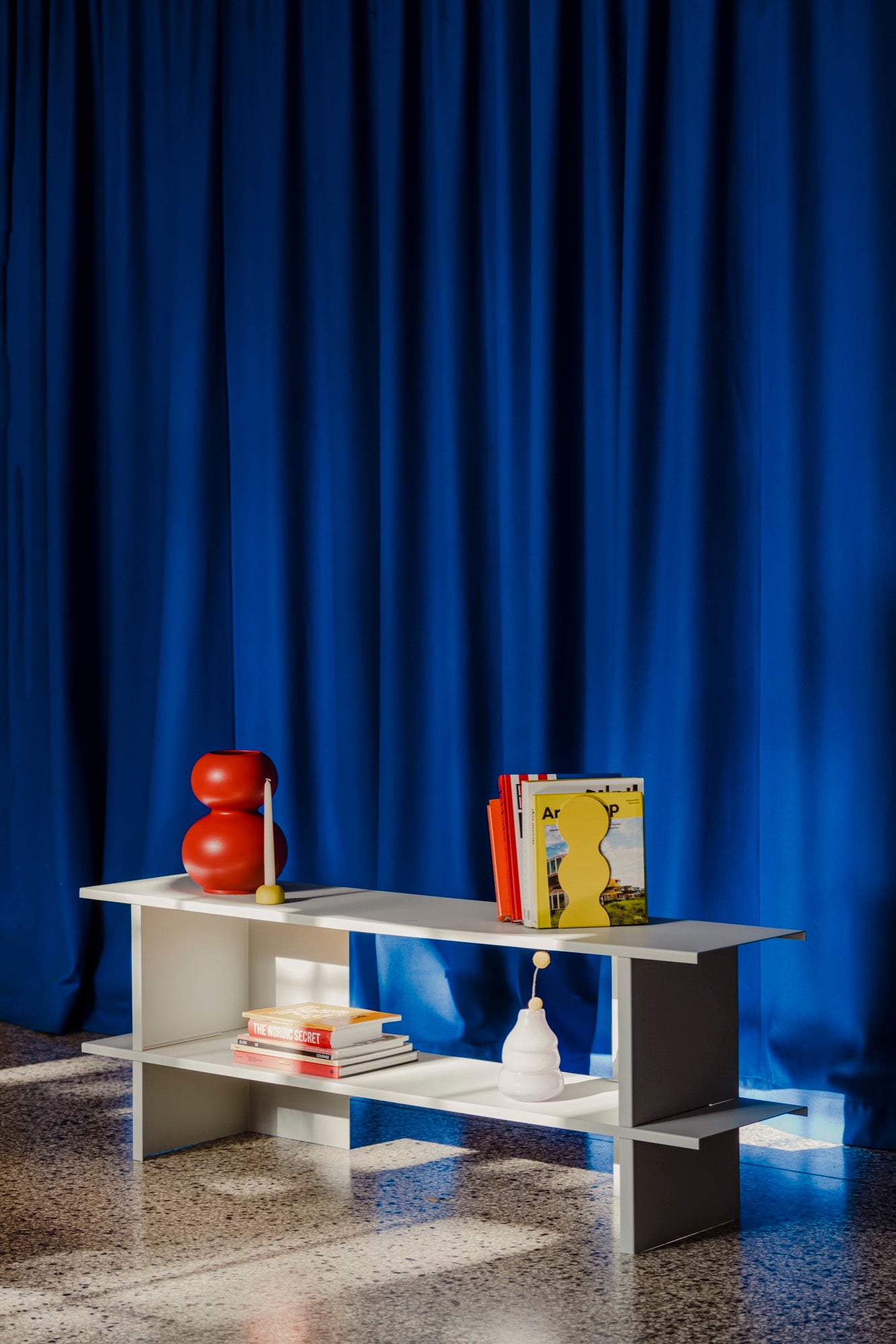 Meet Hes — a classic low shelving unit, a suitable TV stand or storage for your books, records and décors. The simplistic bent steel construction with protruding elements leaves lots of room for storing and is a discreet nod to minimalism admirers. Available in classic grey and crisp red color, Hes has capacity to become an outstanding hero piece in your living room or home office.