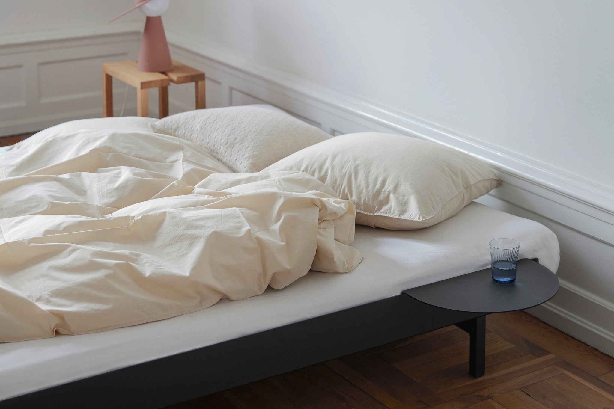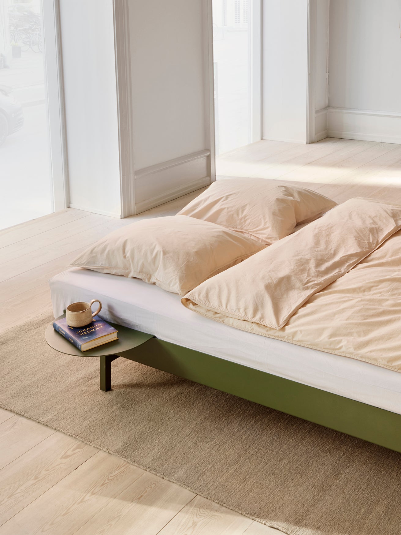 A cute half moon shaped bed side table to match the expandable bedframe. Available in the same four colors as the bedframe: sand, black, pine green and dusty rose. Choose the same color as your frame, or mix and match with another color. Made from powder coated steel.