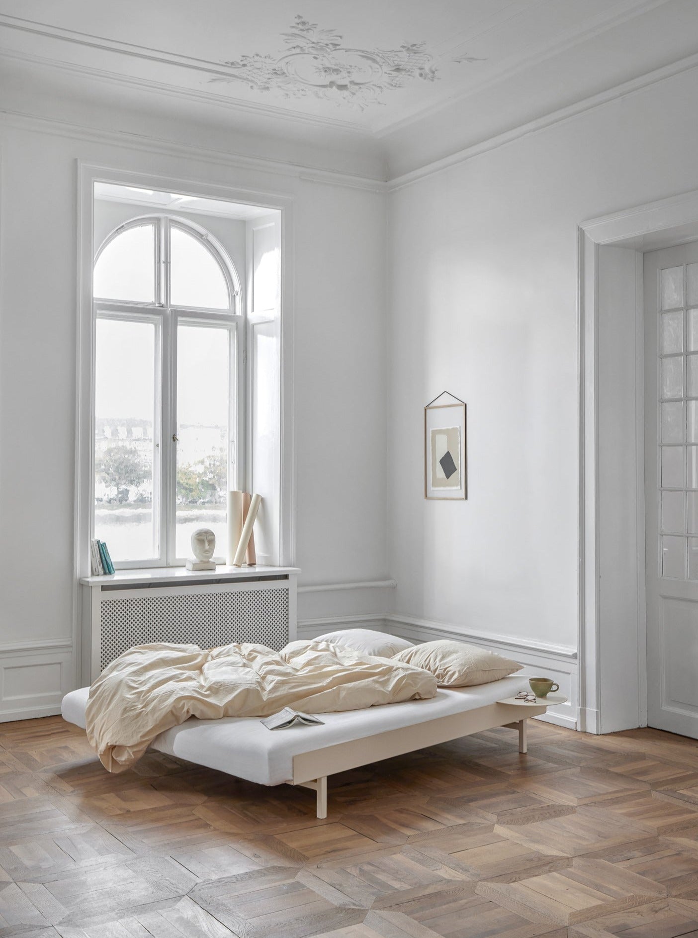 The expandable bed by MOEBE is a minimal and modern bed made of a powder coated steel frame that can be changed in size from 90 to 180cm wide.
