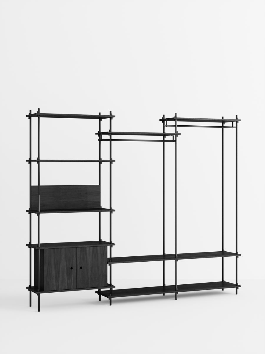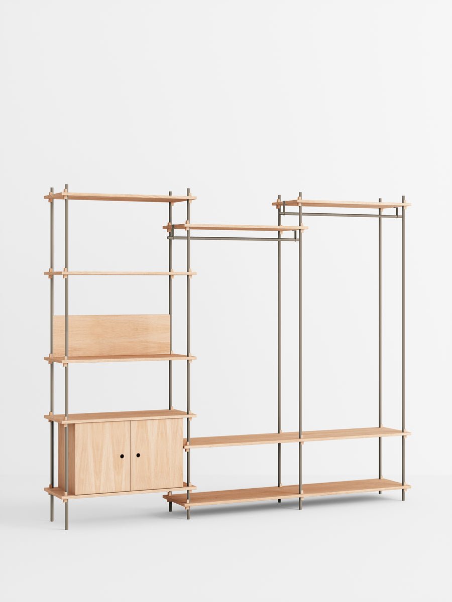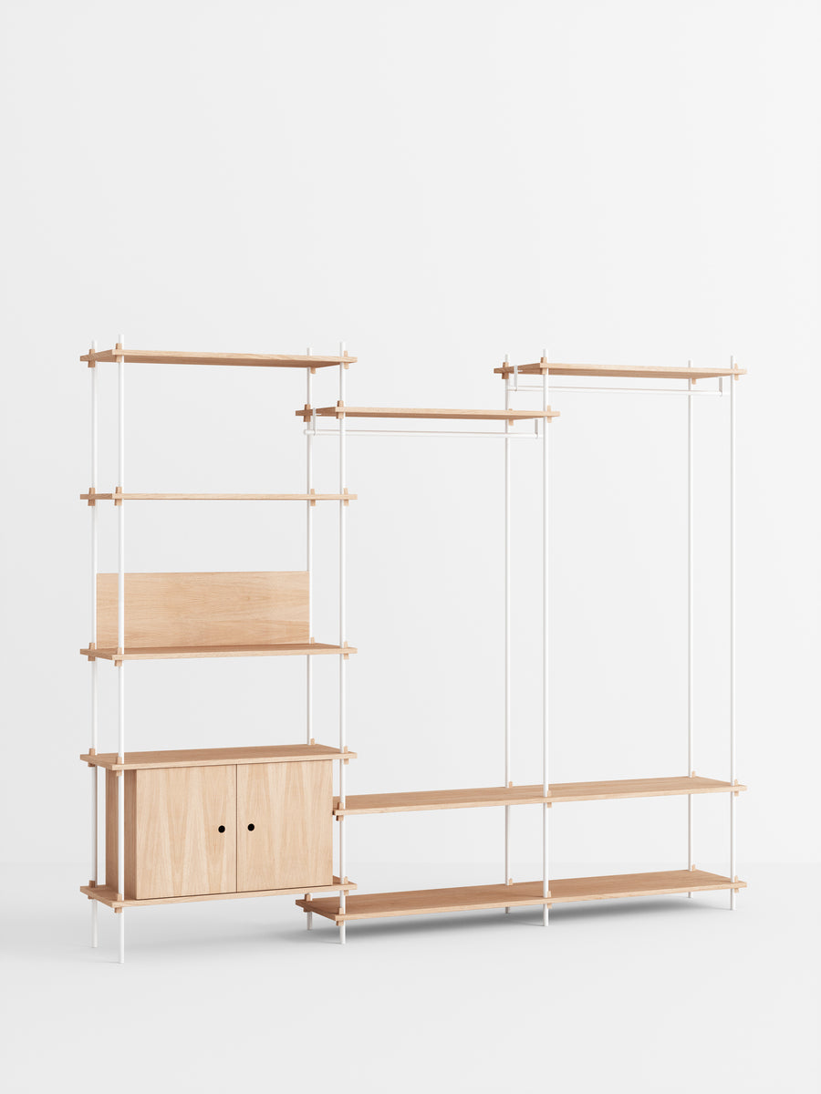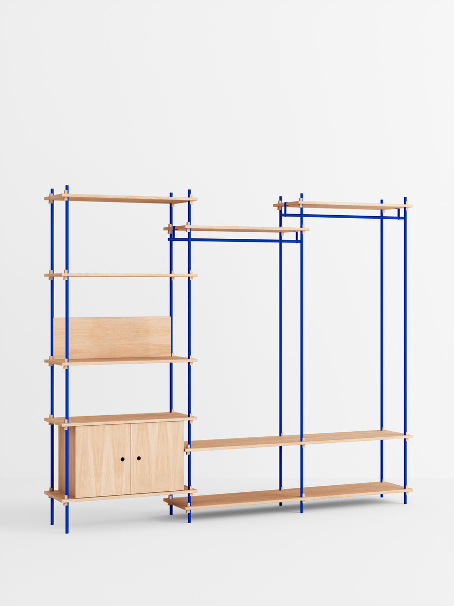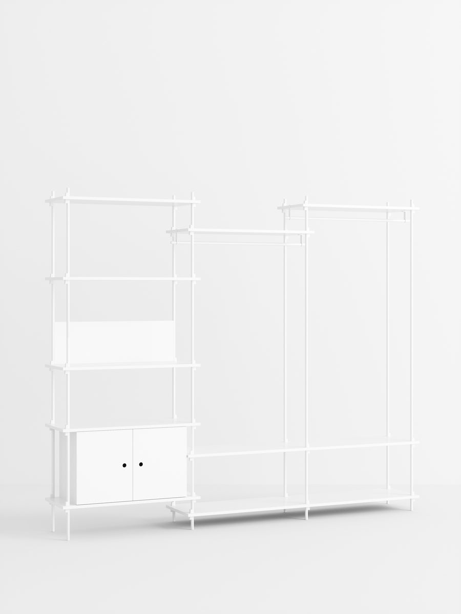 The MOEBE Shelving System is a modular piece of furniture that gives you full freedom to build your own piece of furniture. Build as tall as you like, as wide as you like, around corners, or even span different levels. Add function by implementing a wardrobe, desk or cabinet. Place it across a wall or use it free standing. From workspaces to room dividers, bookshelves to wardrobes; the MOEBE Shelving System can be used in a variety of ways, for a variety of functions.