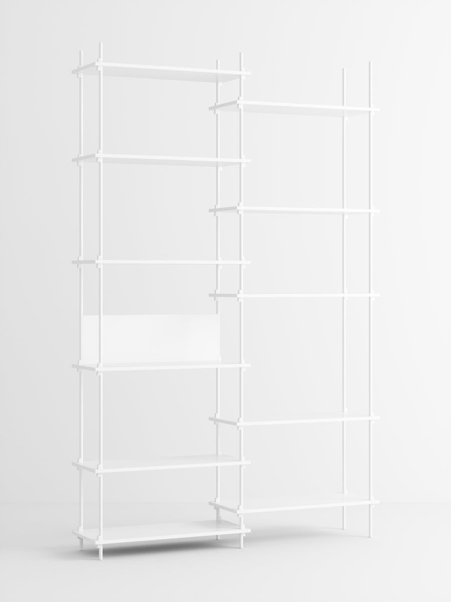 The MOEBE Shelving System is a modular piece of furniture that gives you full freedom to build your own piece of furniture. Build as tall as you like, as wide as you like, around corners, or even span different levels. Add function by implementing a wardrobe, desk or cabinet. Place it across a wall or use it free standing. From workspaces to room dividers, bookshelves to wardrobes; the MOEBE Shelving System can be used in a variety of ways, for a variety of functions.