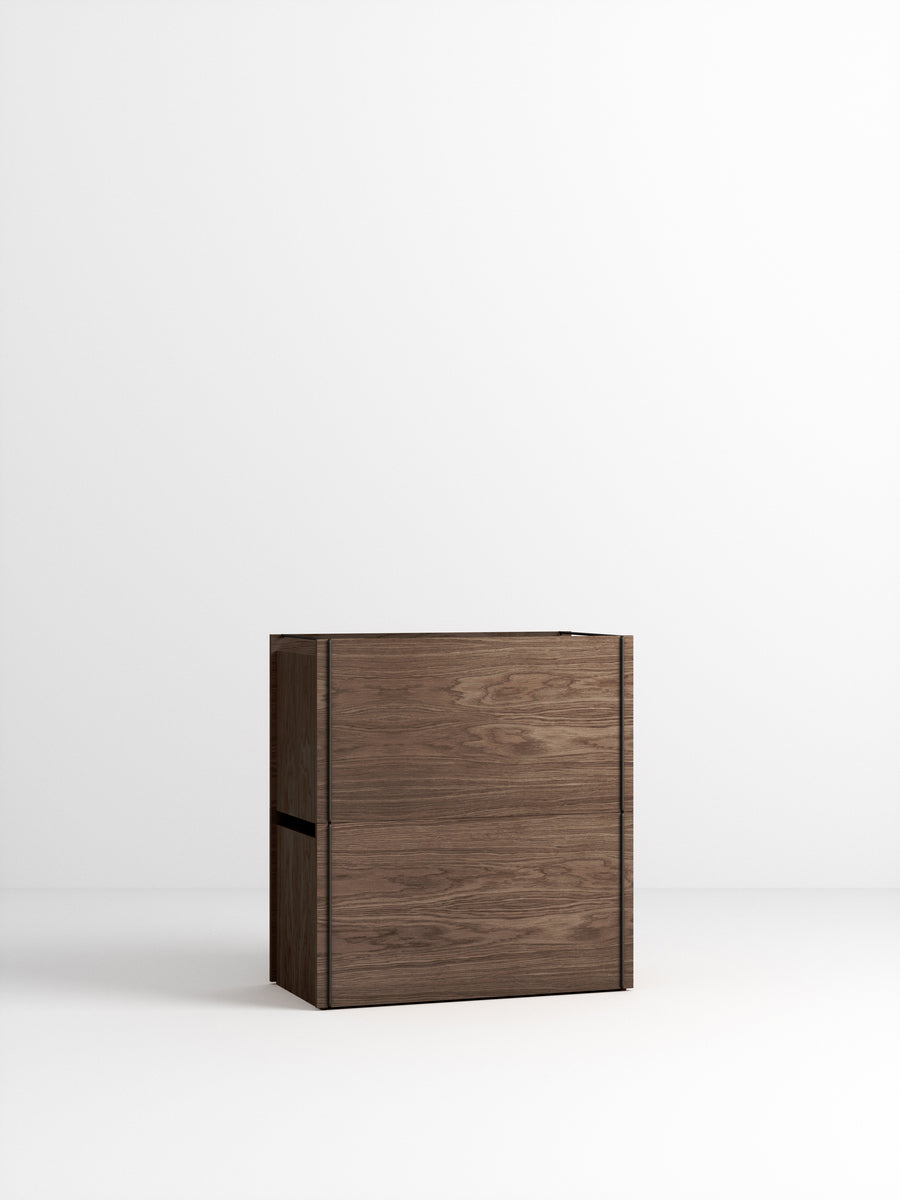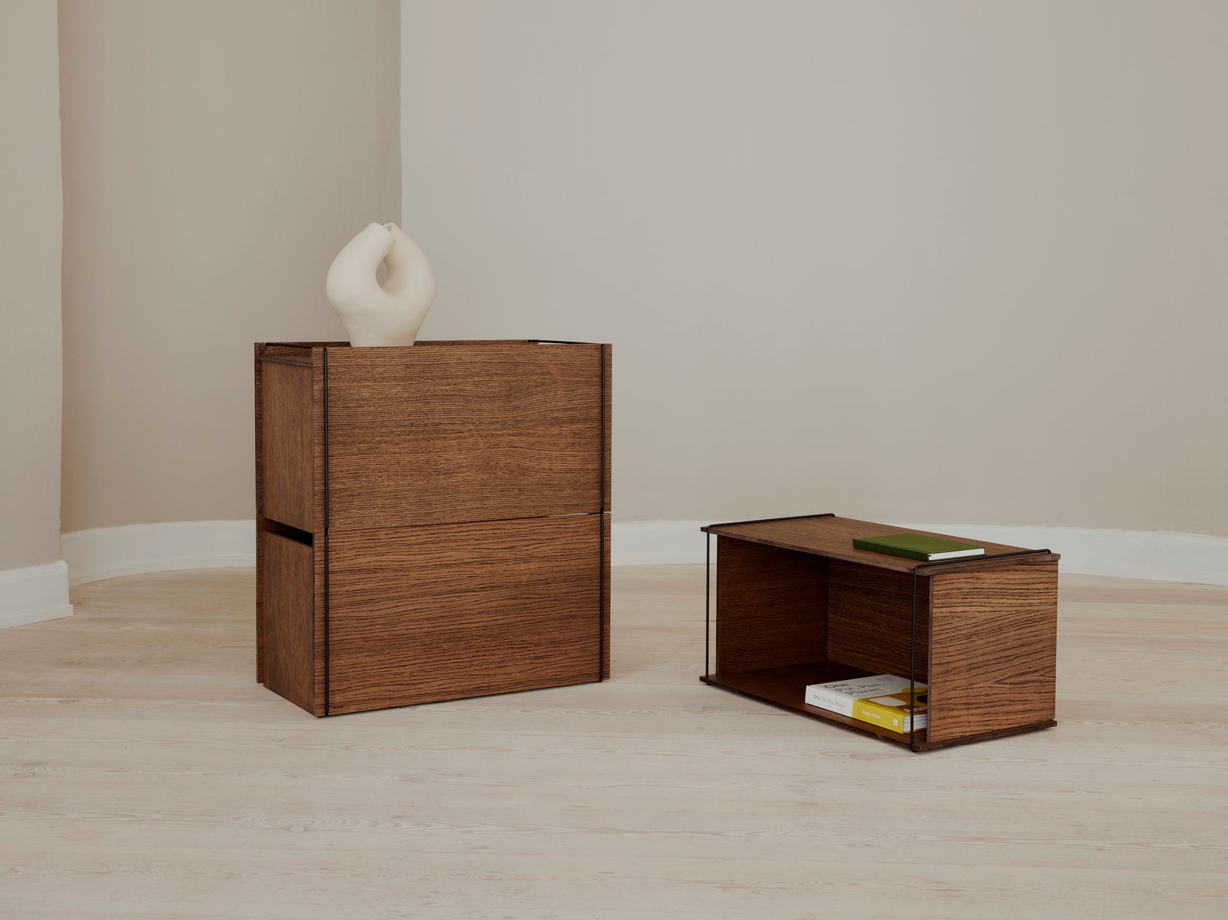 The component based design arrives flat-packed and can be assembled and disassembled whenever needed. The two square metal frames lock the box together, whilst also serving as handles to carry. Designed to be a single piece or to stack together. Lay them flat or stand them up. We recommend stacking a maximum of three boxes.