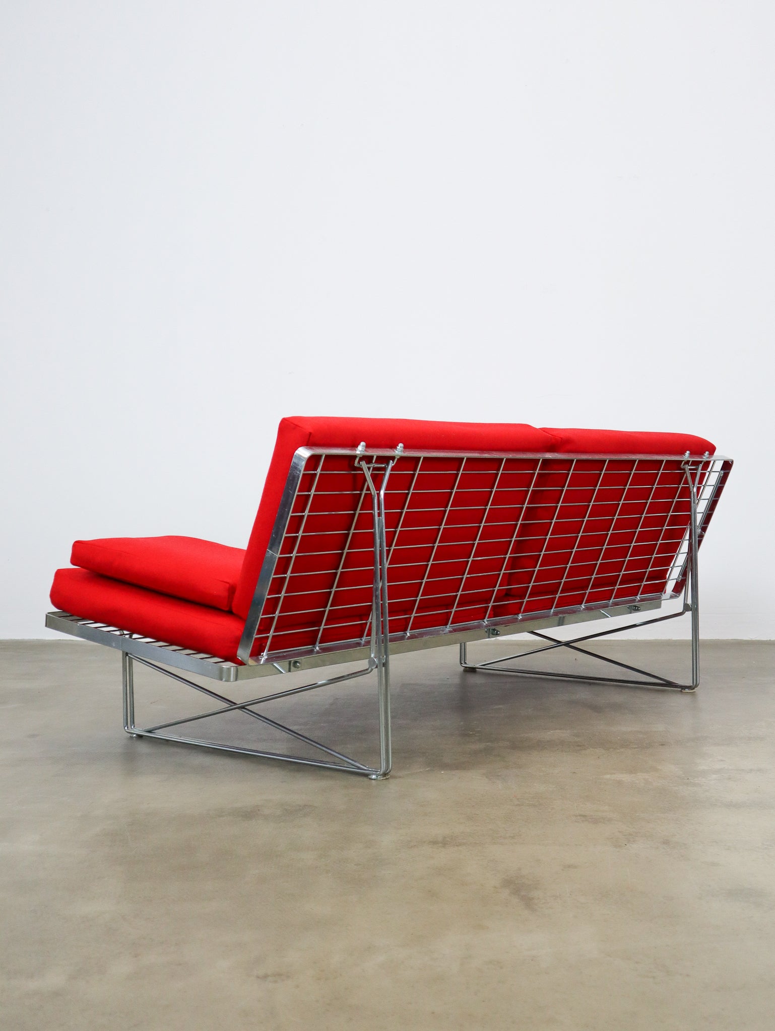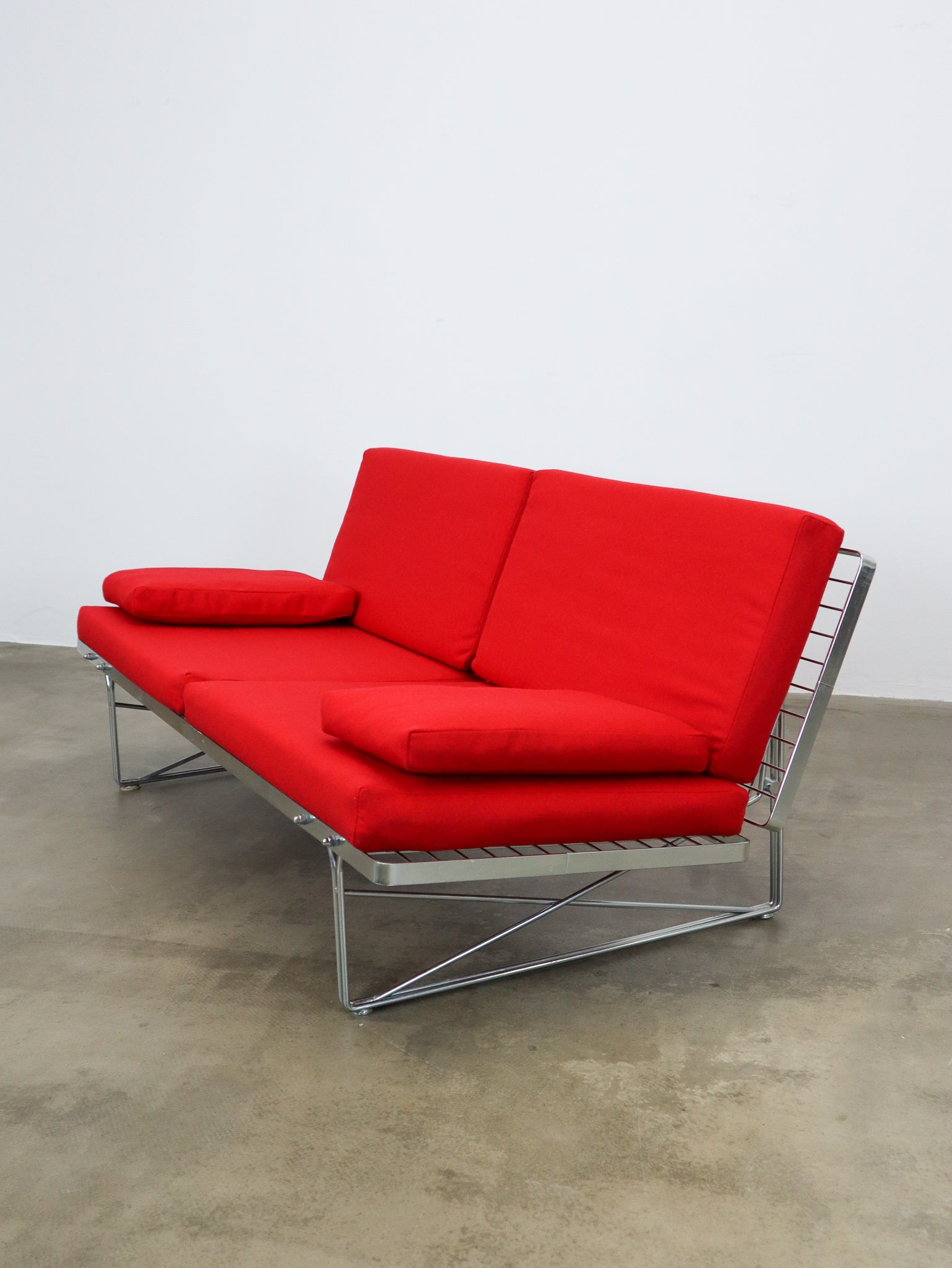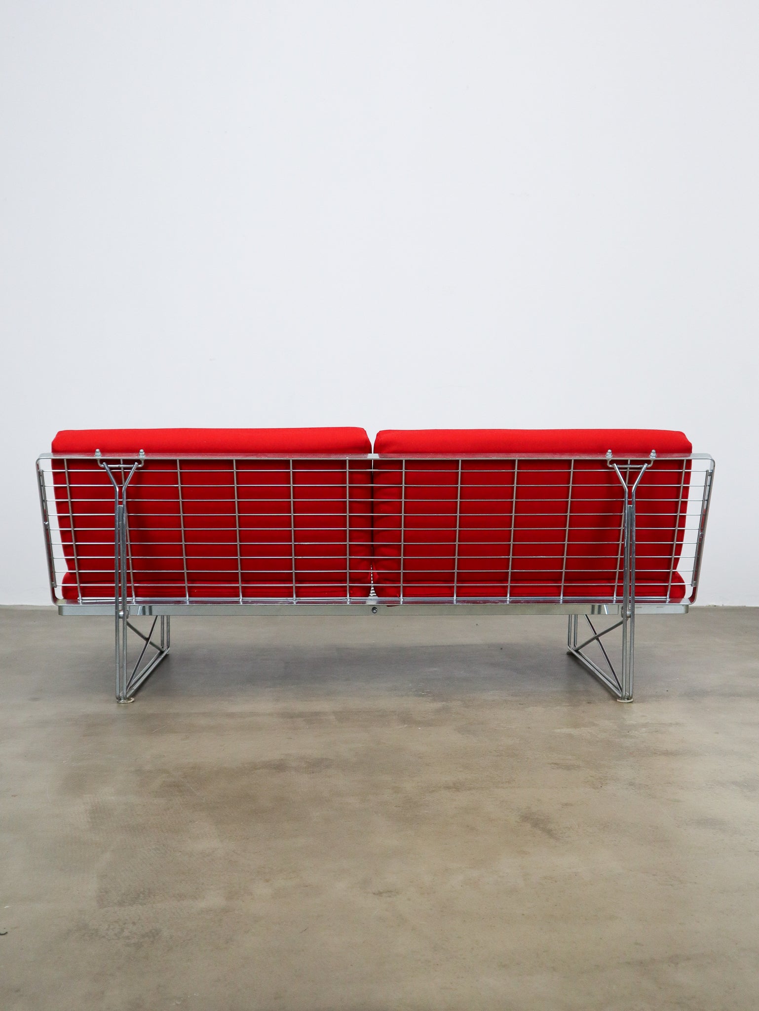 Vintage 'Moment' sofa designed by Niels Gammelgaard for Ikea in the 1980s. The sofa has a silver steel wire frame, typical for Gammelgaards designs. The cushions have been reupholstered by us in this lovely red fabric, which is a durable water repellent woolmix made of 70% recycled wool, 30% polyamide.
