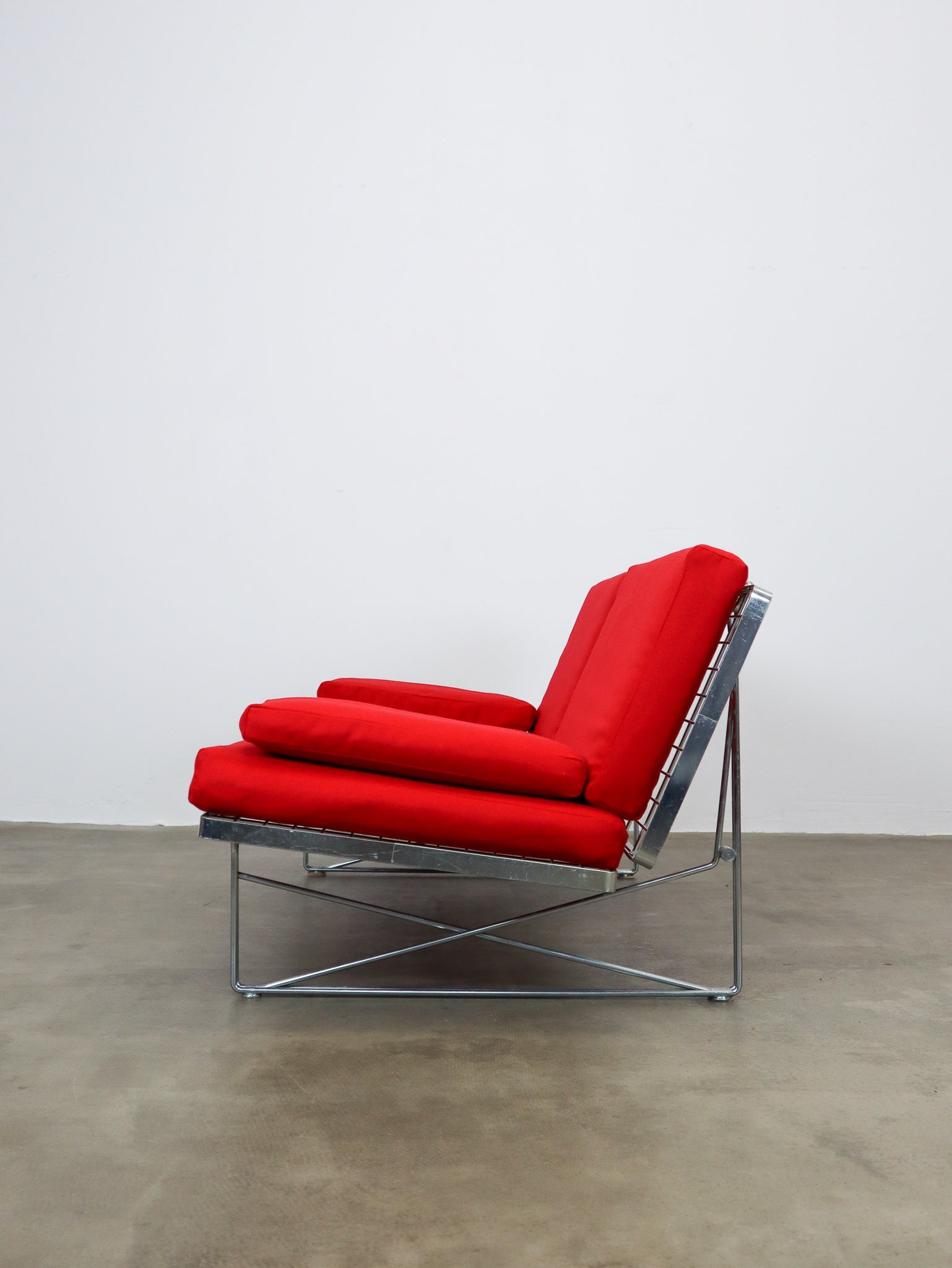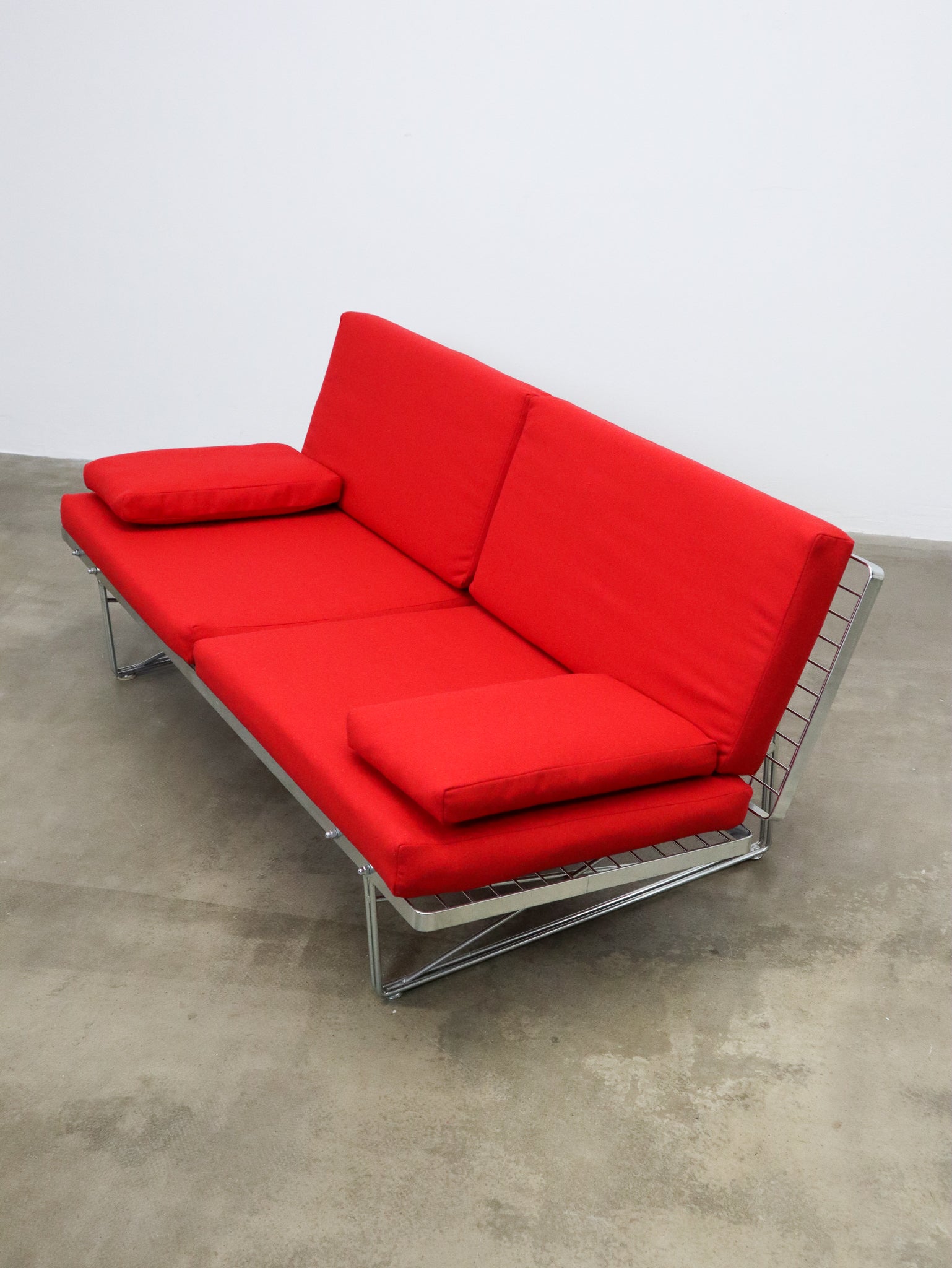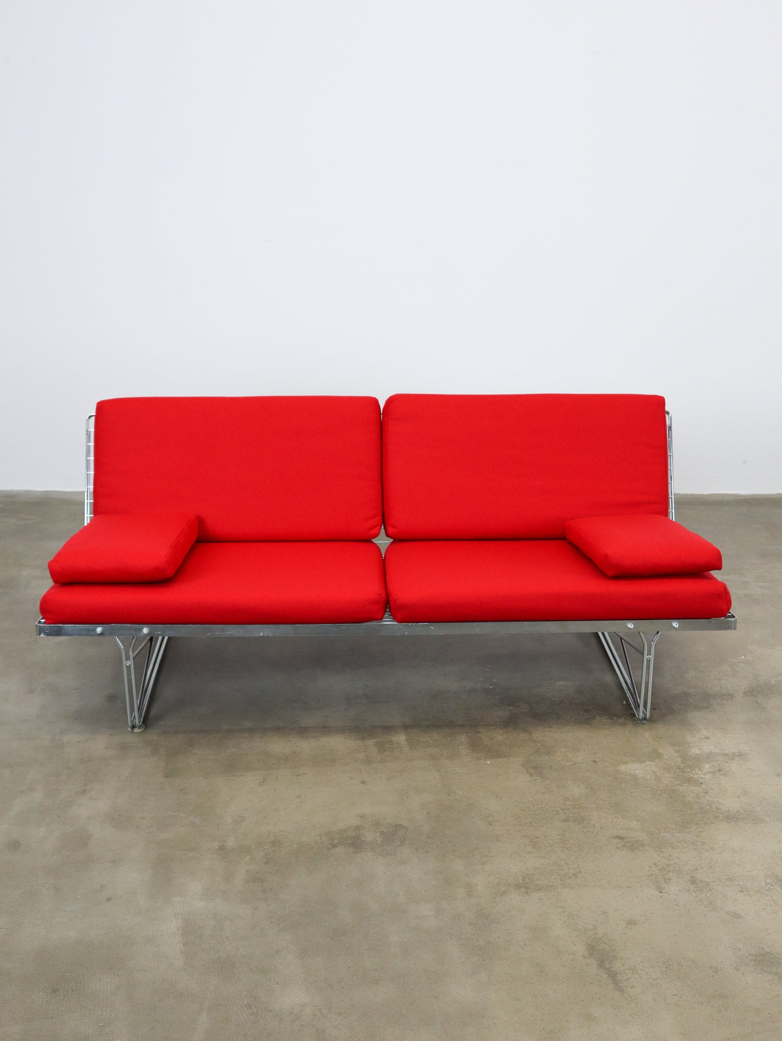 Vintage 'Moment' sofa designed by Niels Gammelgaard for Ikea in the 1980s. The sofa has a silver steel wire frame, typical for Gammelgaards designs. The cushions have been reupholstered by us in this lovely red fabric, which is a durable water repellent woolmix made of 70% recycled wool, 30% polyamide.