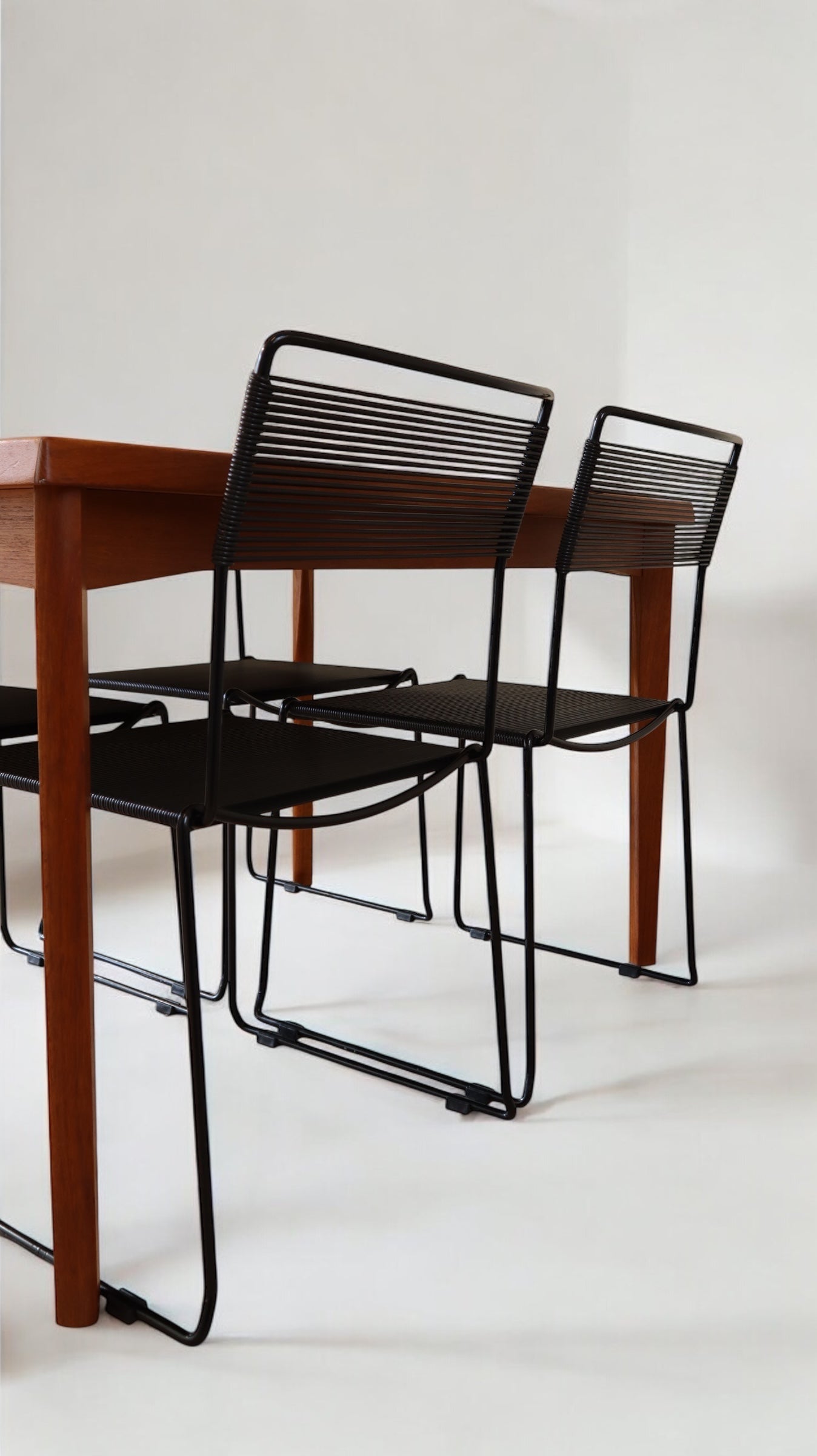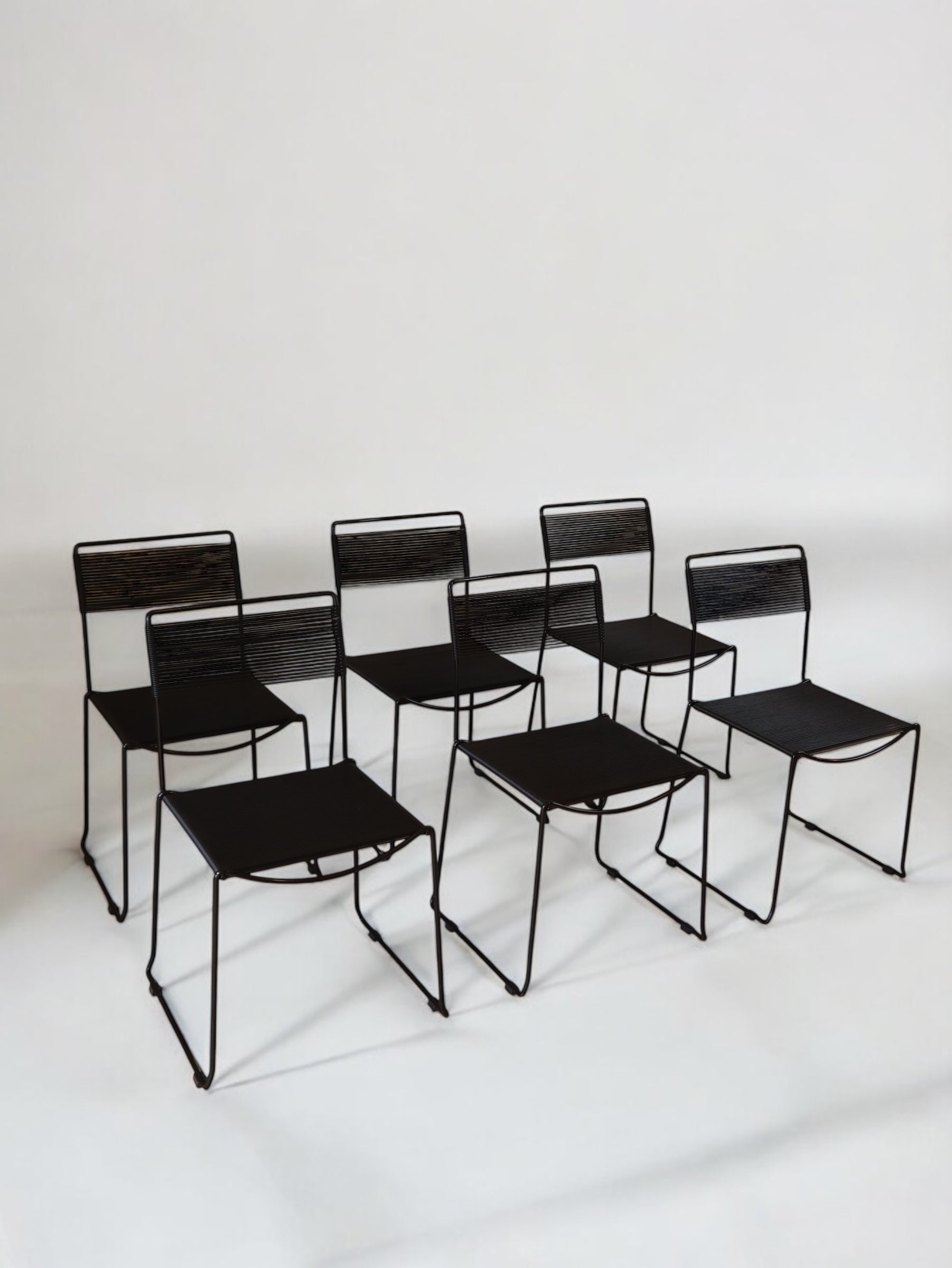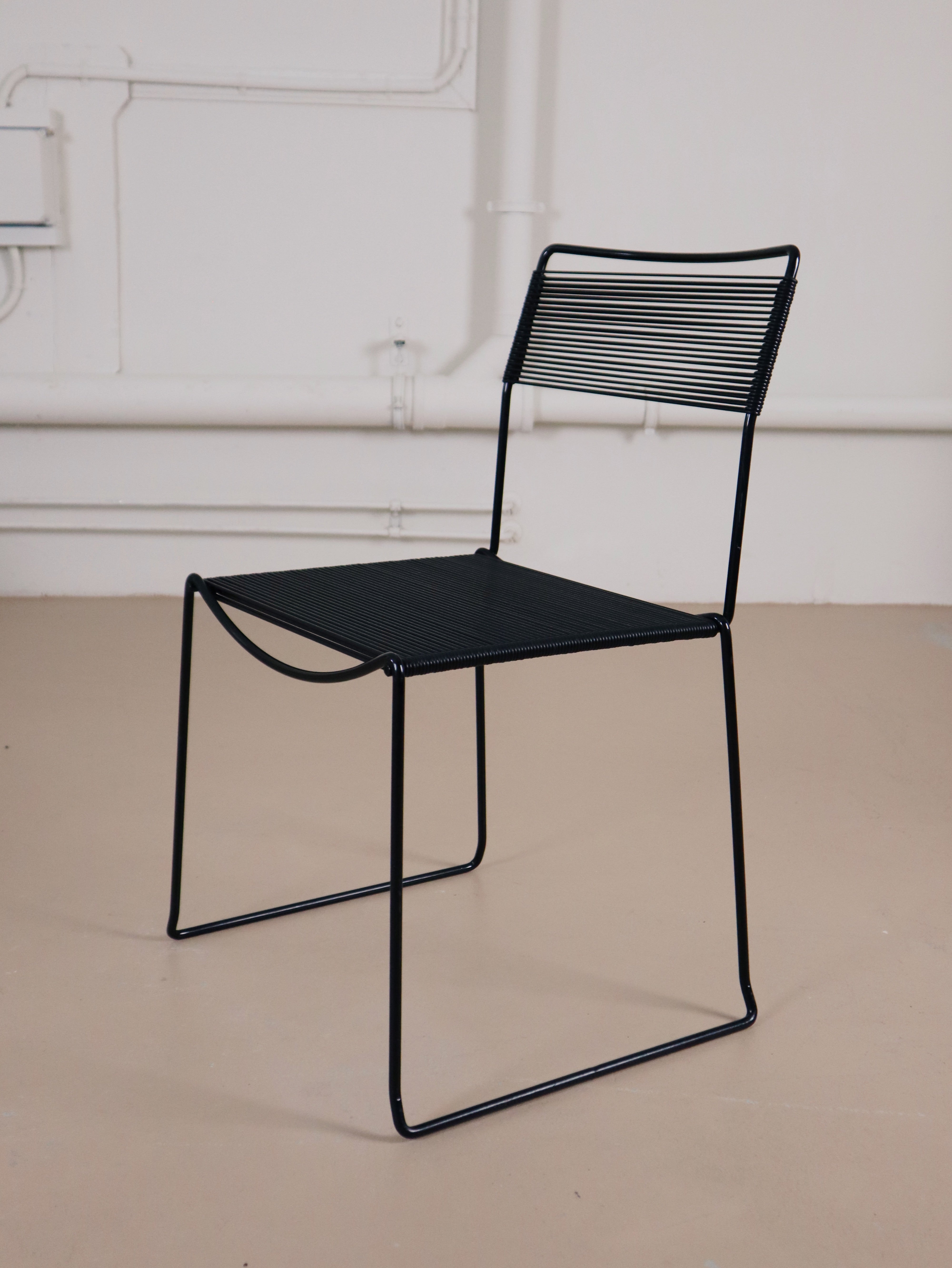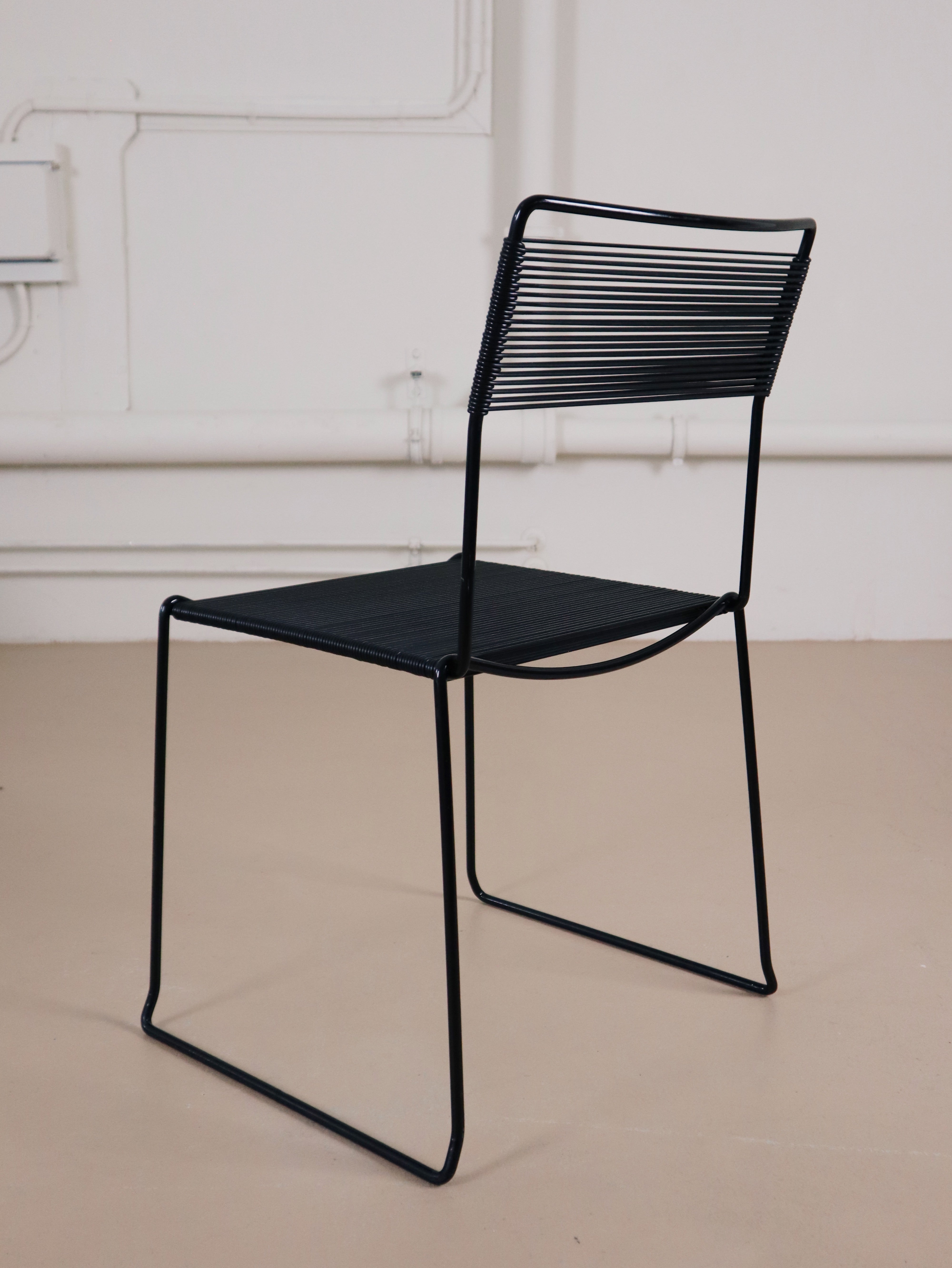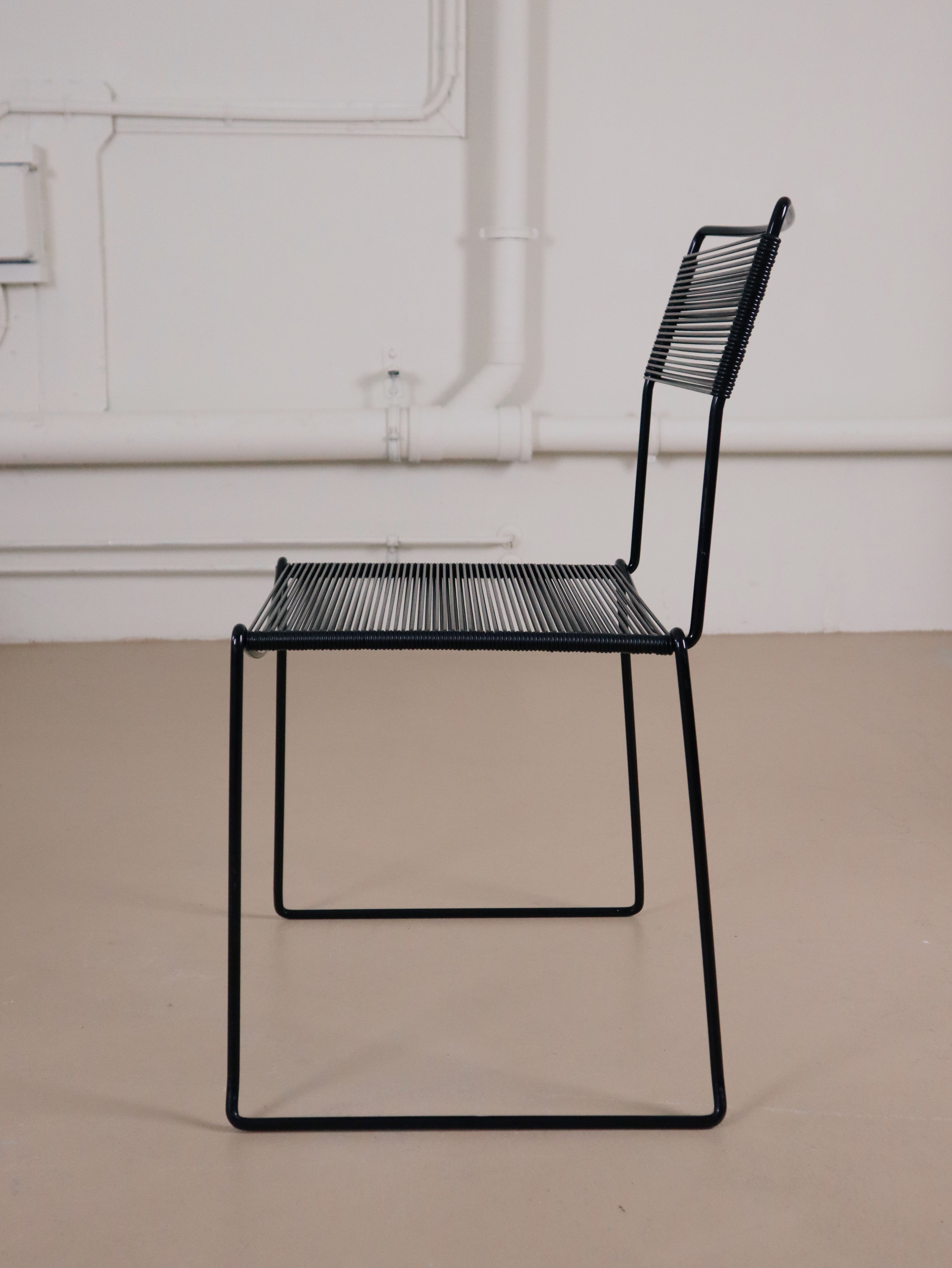 Vintage Italian design 'Jodi' Spaghetti chairs by Sintesi (1980s). The chairs have a black (lacquered) steel frame and black PVC cord seats, the seats are still in excellent condition. We have a set of four available, if you're looking for a bigger set please get in touch!