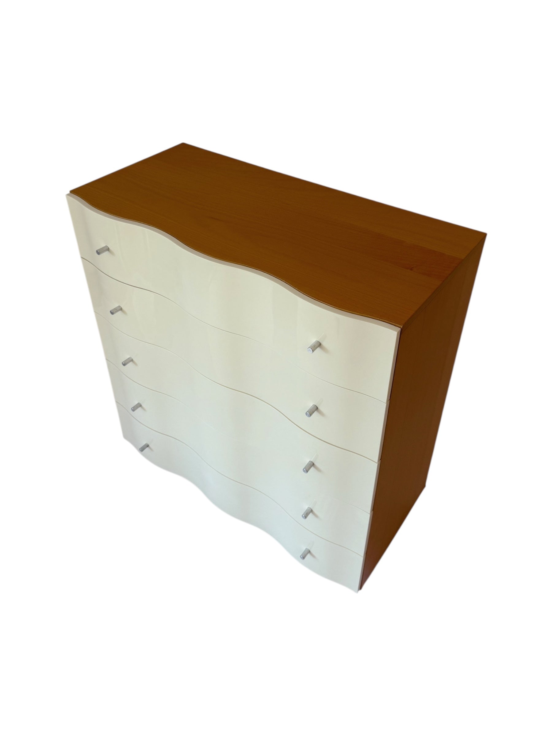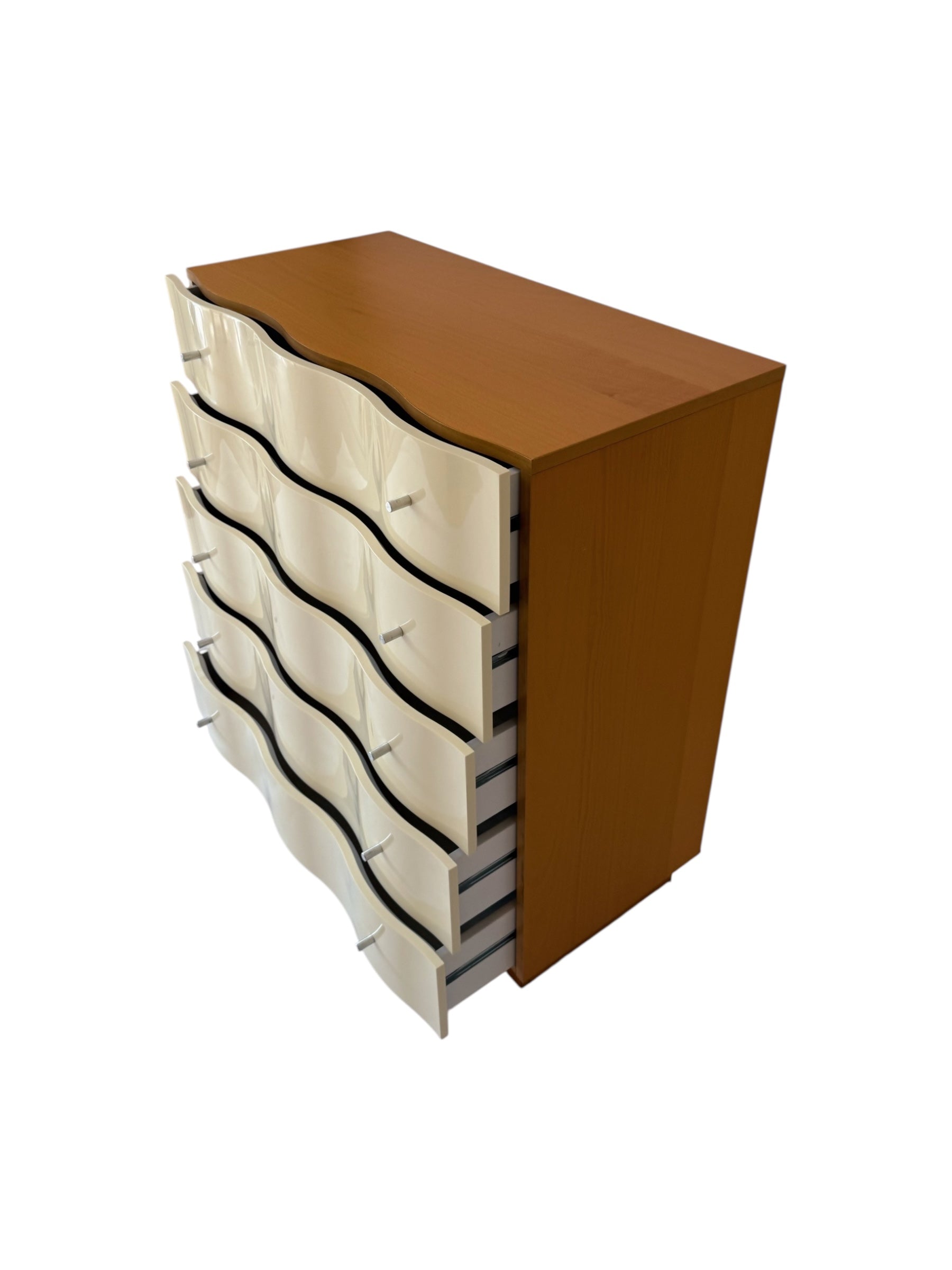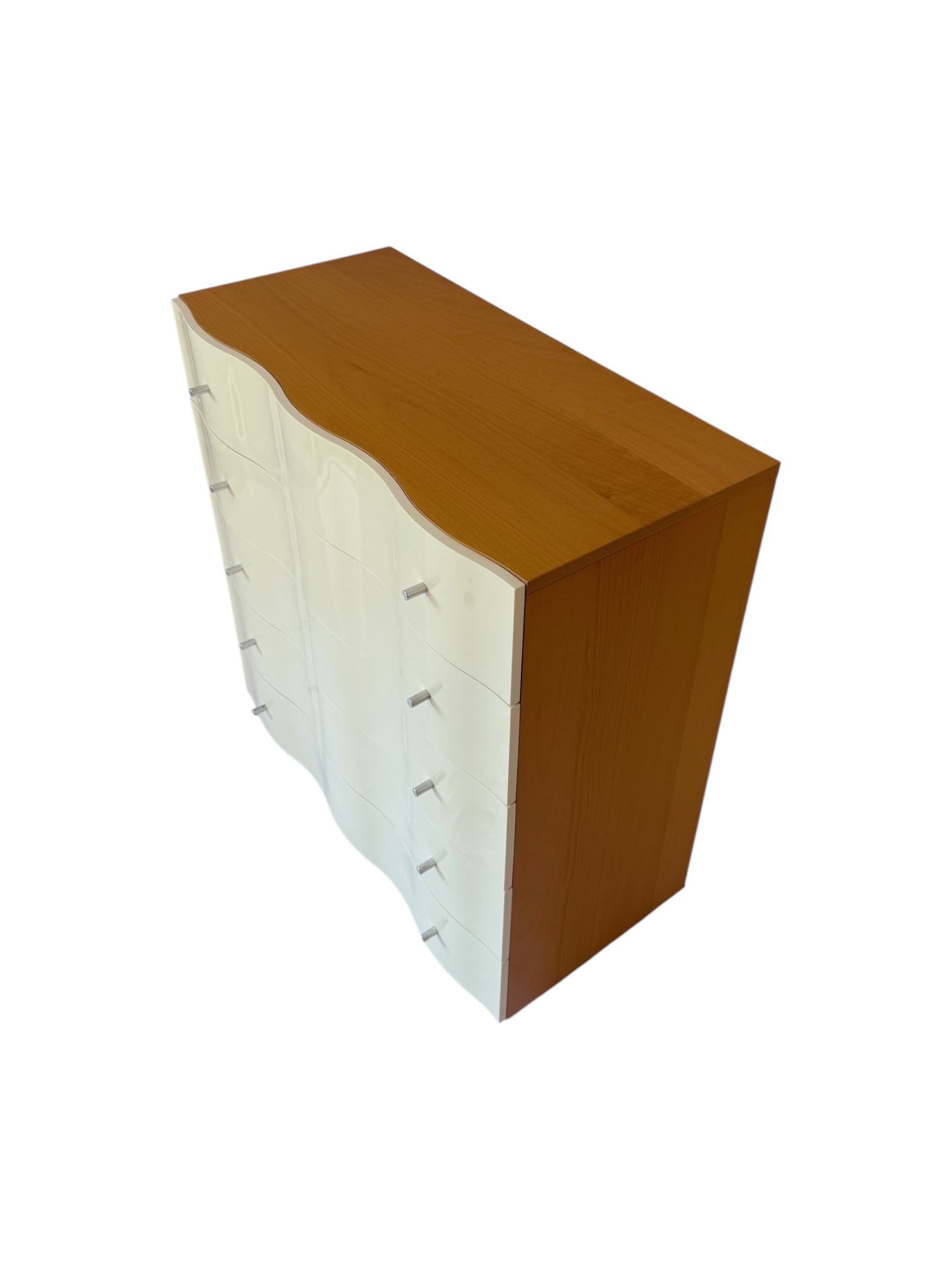 Amazing chest of drawers designed by Tomas Jelinek in the 1990s for IKEA in off white and wood veneer with aluminium knobs. The wave shaped- and plastic laminate fronts on each of drawers, make this piece endlessly interesting to look at and certainly a unique addition to your interior.