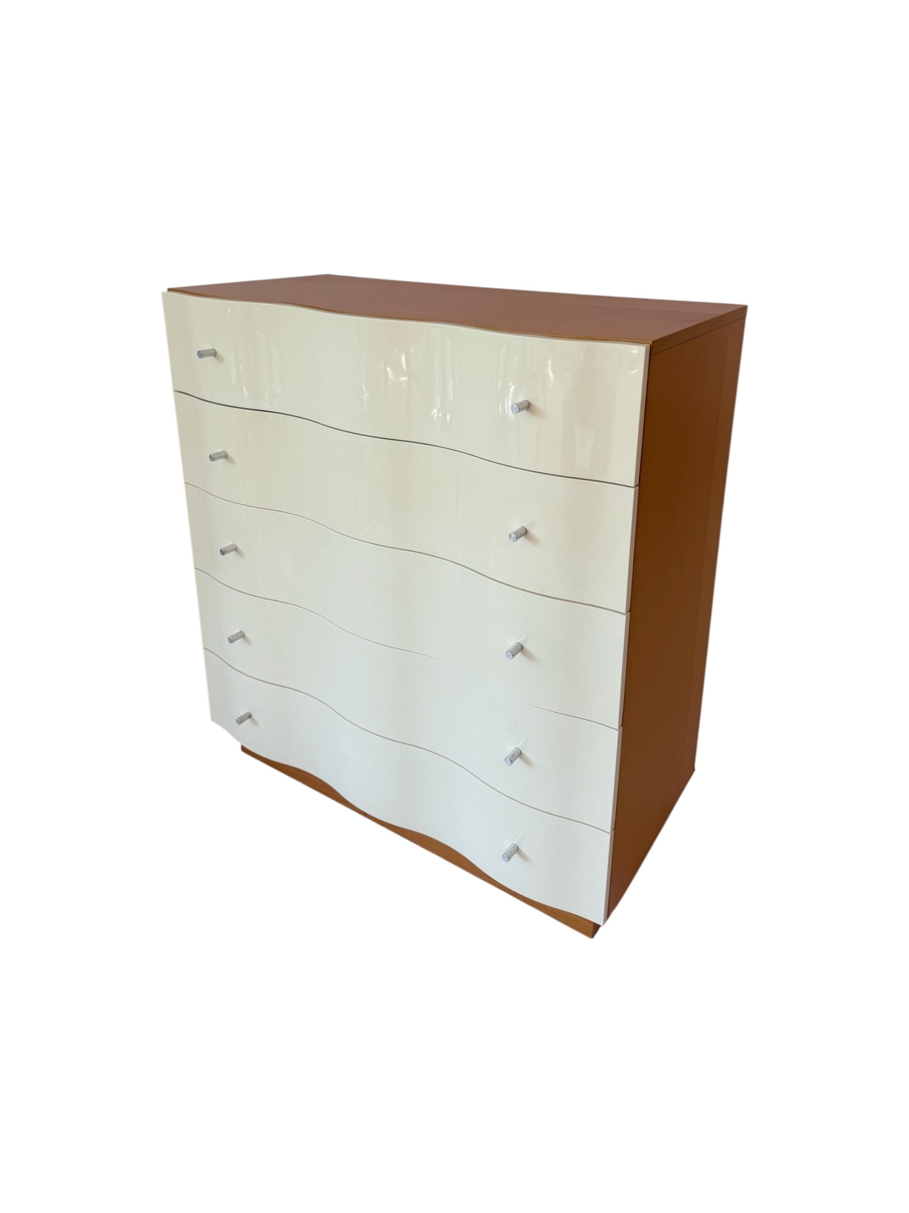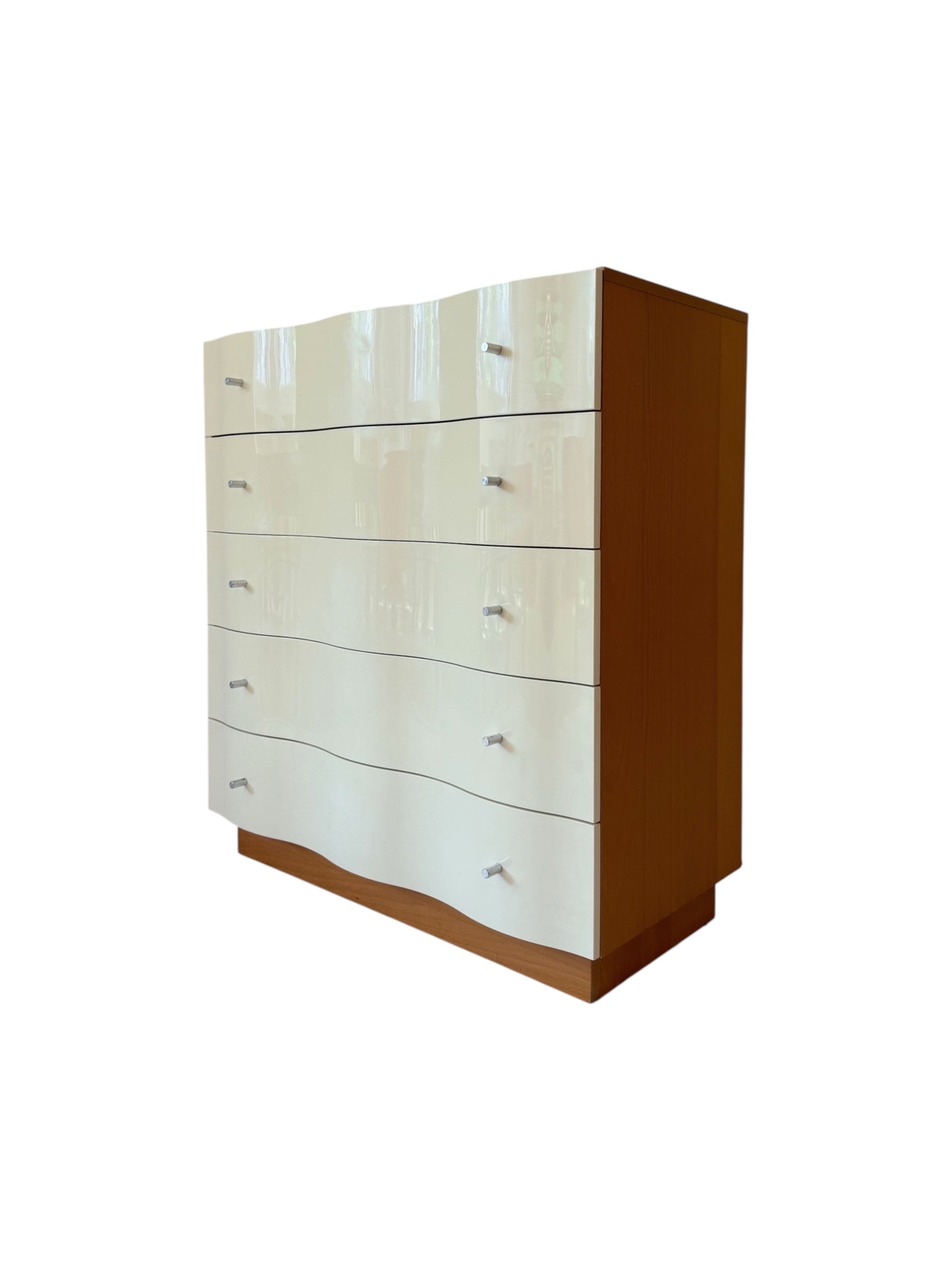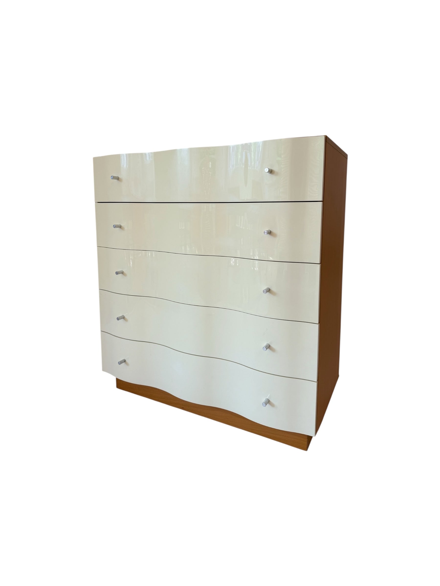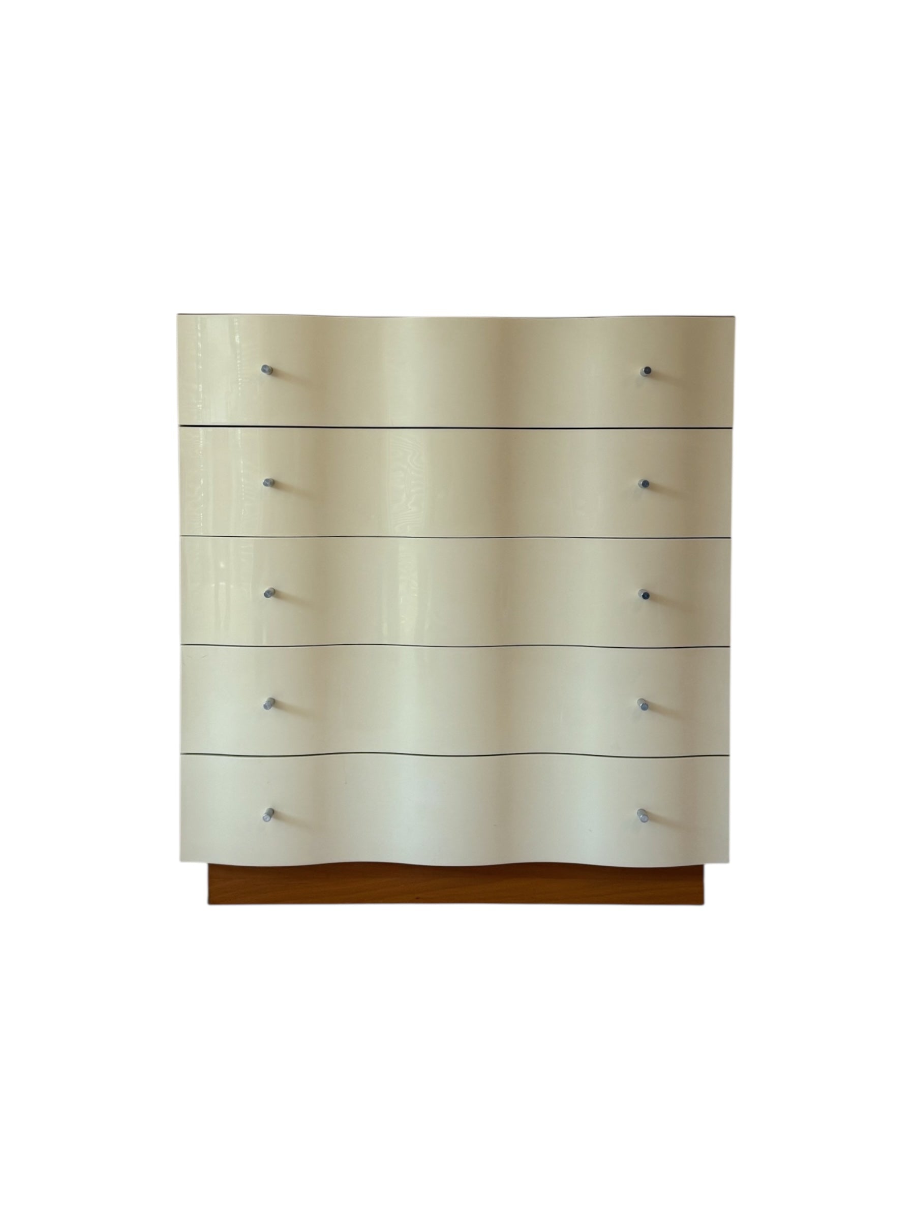 Amazing chest of drawers designed by Tomas Jelinek in the 1990s for IKEA in off white and wood veneer with aluminium knobs. The wave shaped- and plastic laminate fronts on each of drawers, make this piece endlessly interesting to look at and certainly a unique addition to your interior.