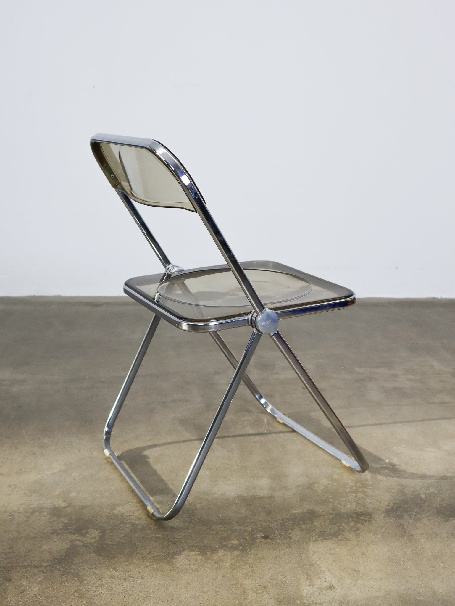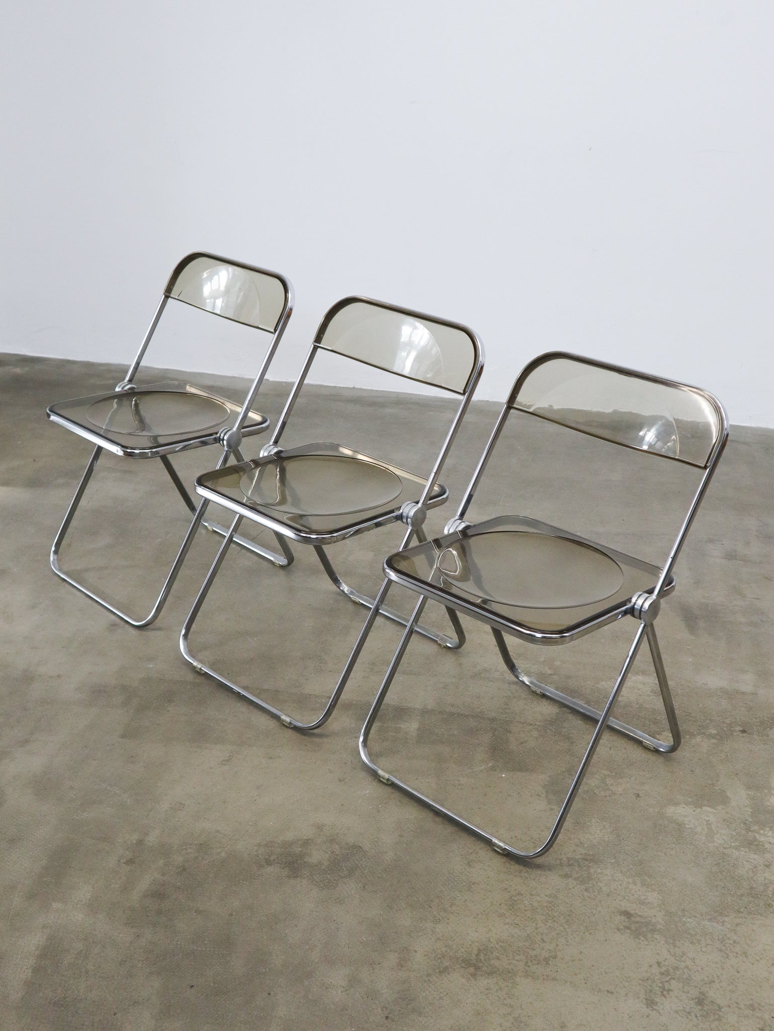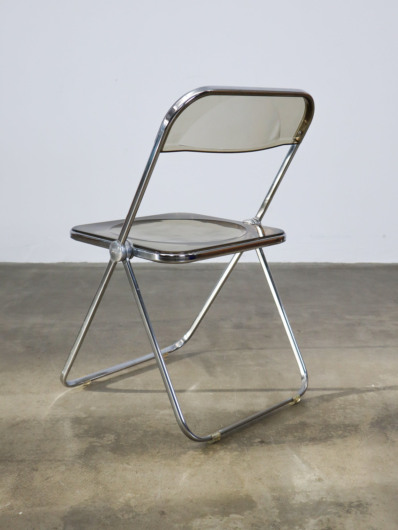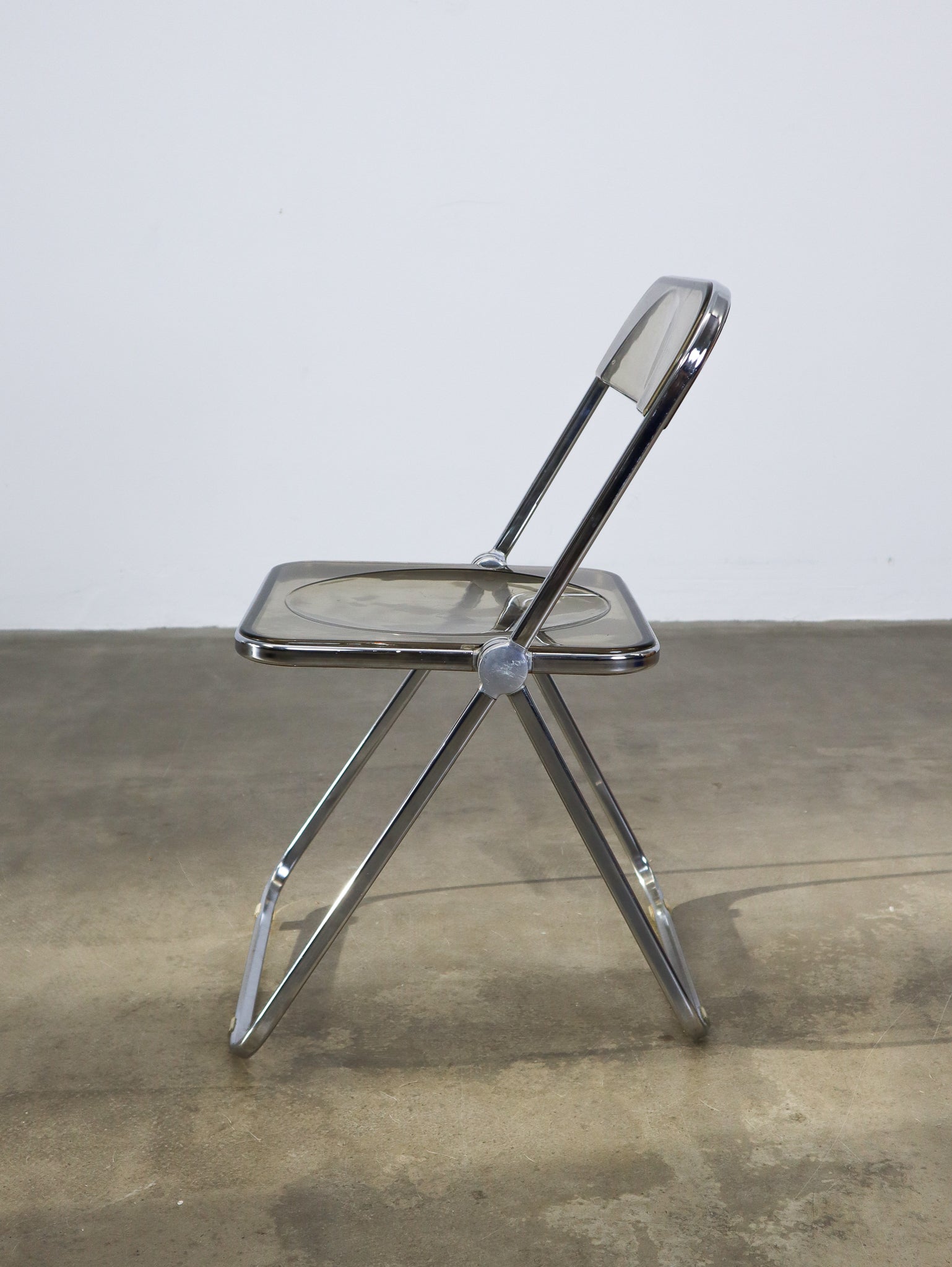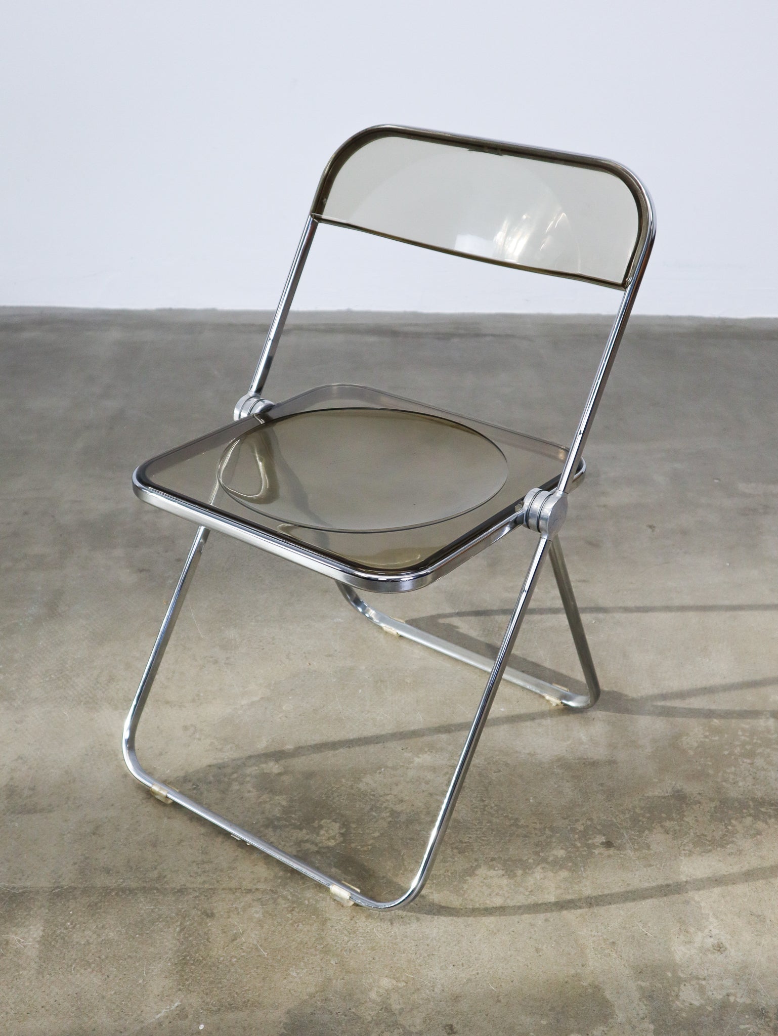 The 'Plia' folding chair was designed by Giancarlo Piretti for Anonima Castelli in 1967 and features a steel frame and a smokey transparant polycarbonate seat. Notably, Piretti incorporated 'three-disc pivot' hinges to enable the unique folding mechanism of the chairs.
