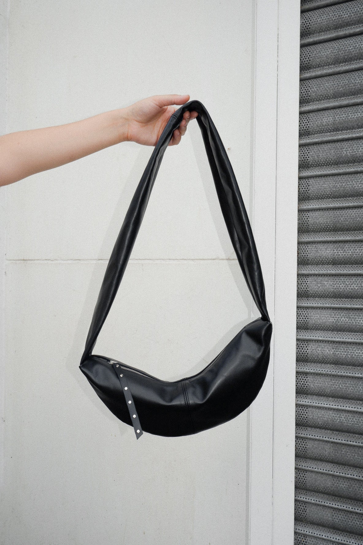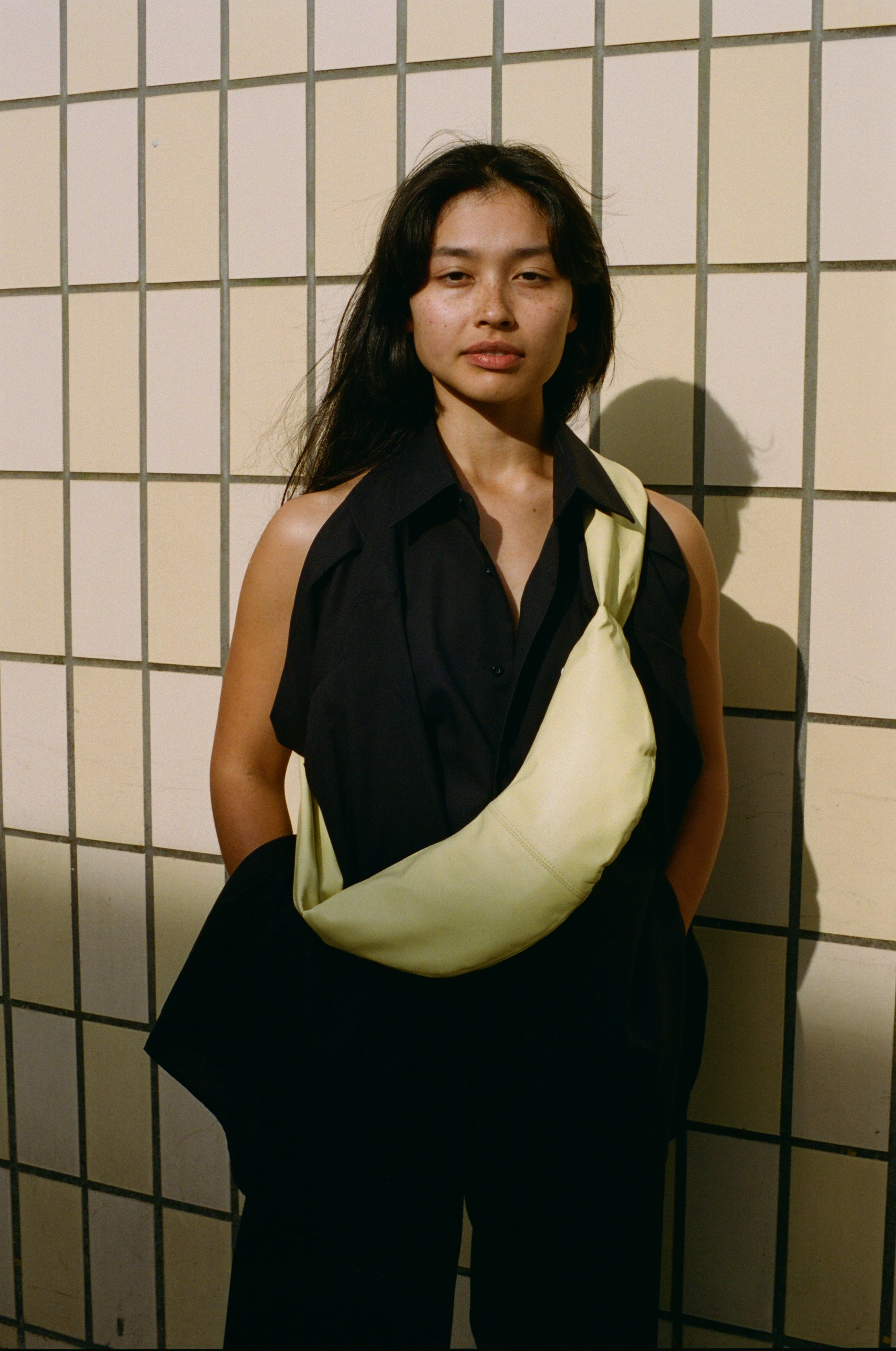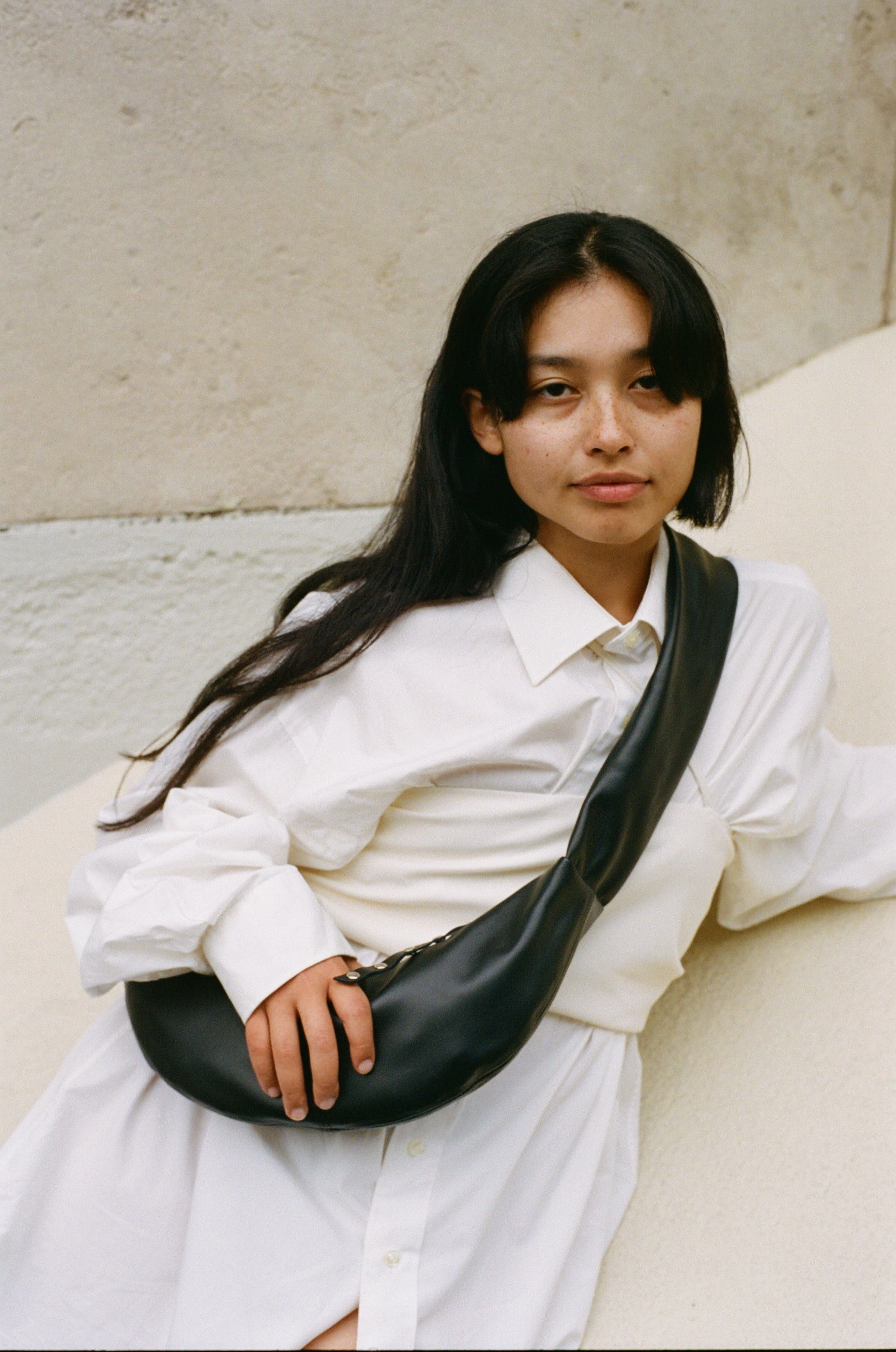 The small crossbody Banana Bag model in black. The Banana Bag closes with a zipper that runs side to side, is lined with 100% cotton and has an inside logo. Fits your most important belongings: phone, wallet, keys and more. Made from a crisp lambskin leather with 1-1.1mm thickness. A comfy, hands-free, bag for your busy daily life.