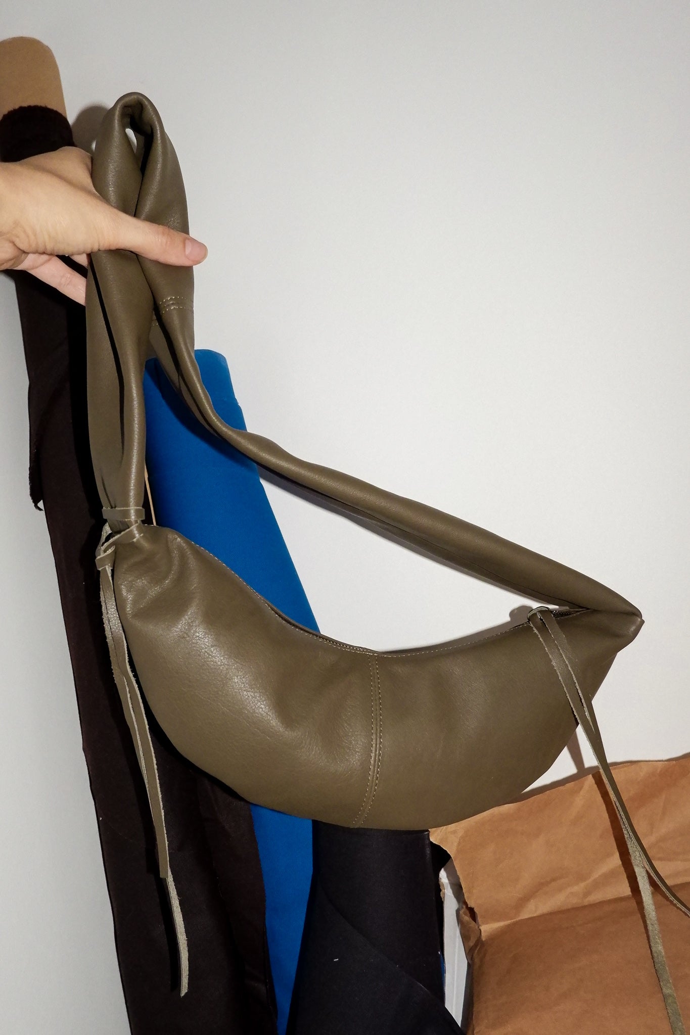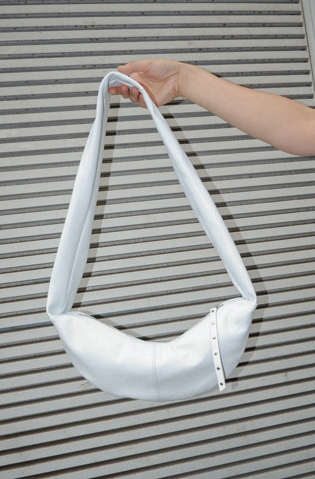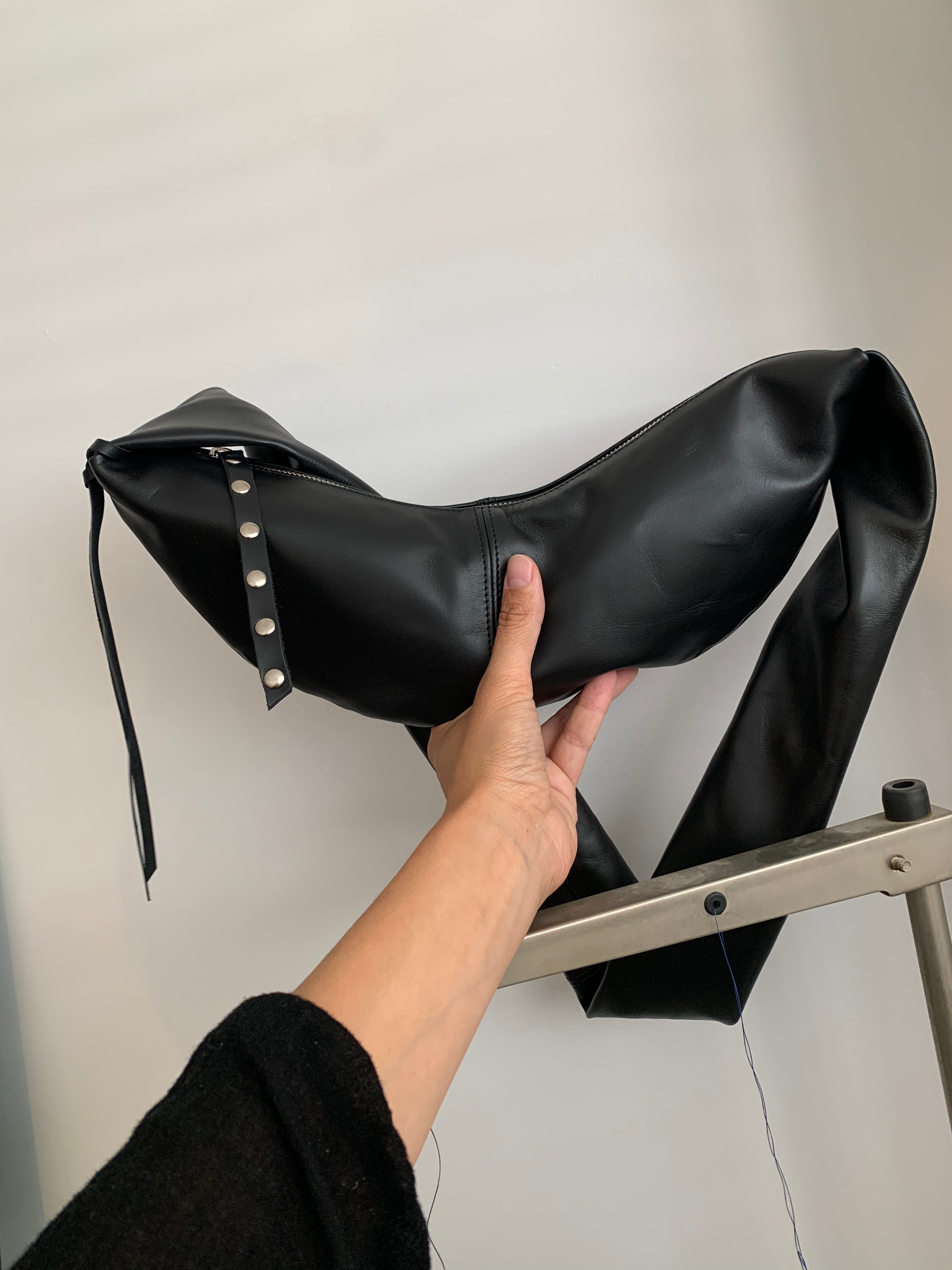 The small crossbody Banana Bag model in black. The Banana Bag closes with a zipper that runs side to side, is lined with 100% cotton and has an inside logo. Fits your most important belongings: phone, wallet, keys and more. Made from a crisp lambskin leather with 1-1.1mm thickness. A comfy, hands-free, bag for your busy daily life.