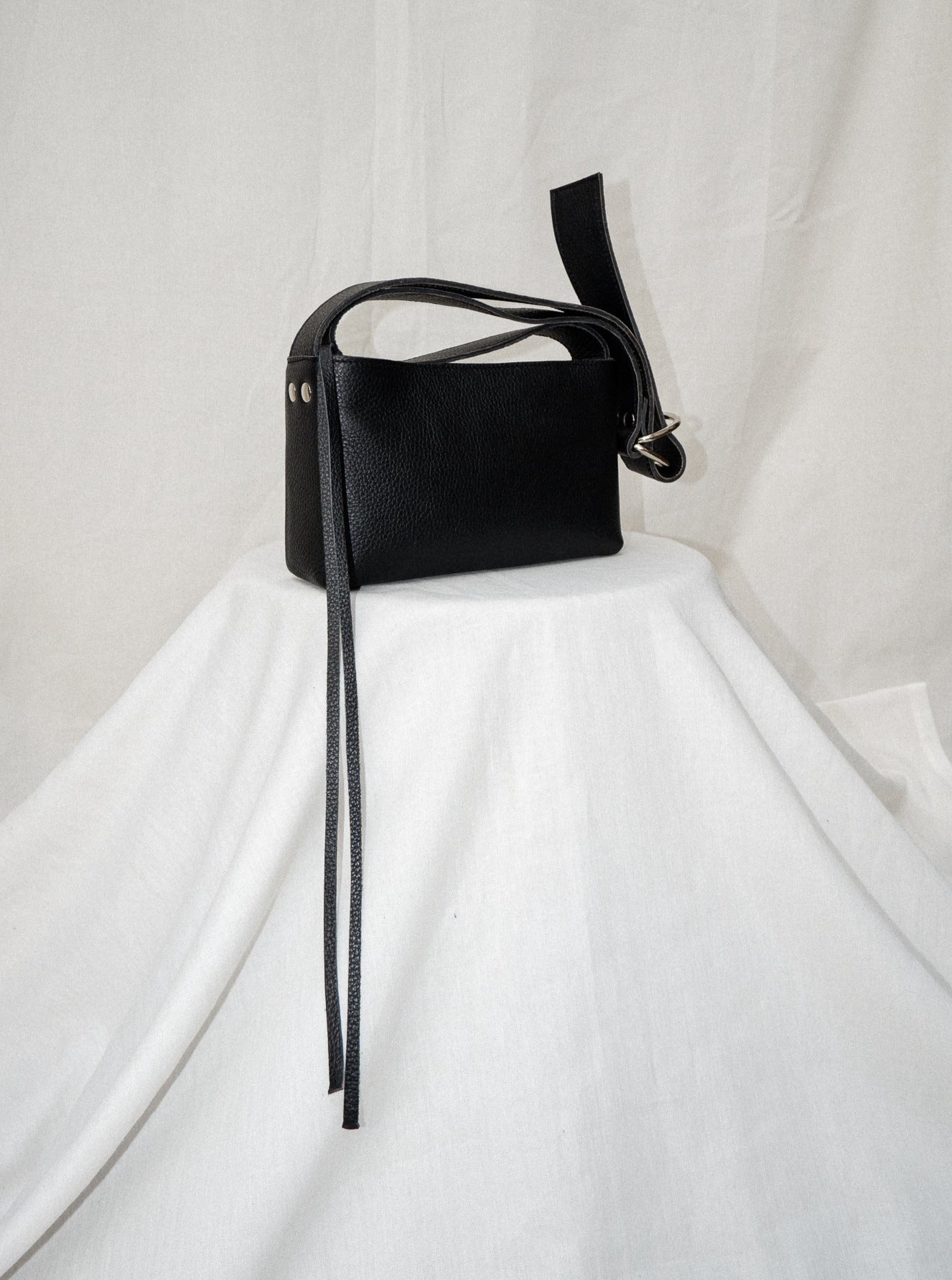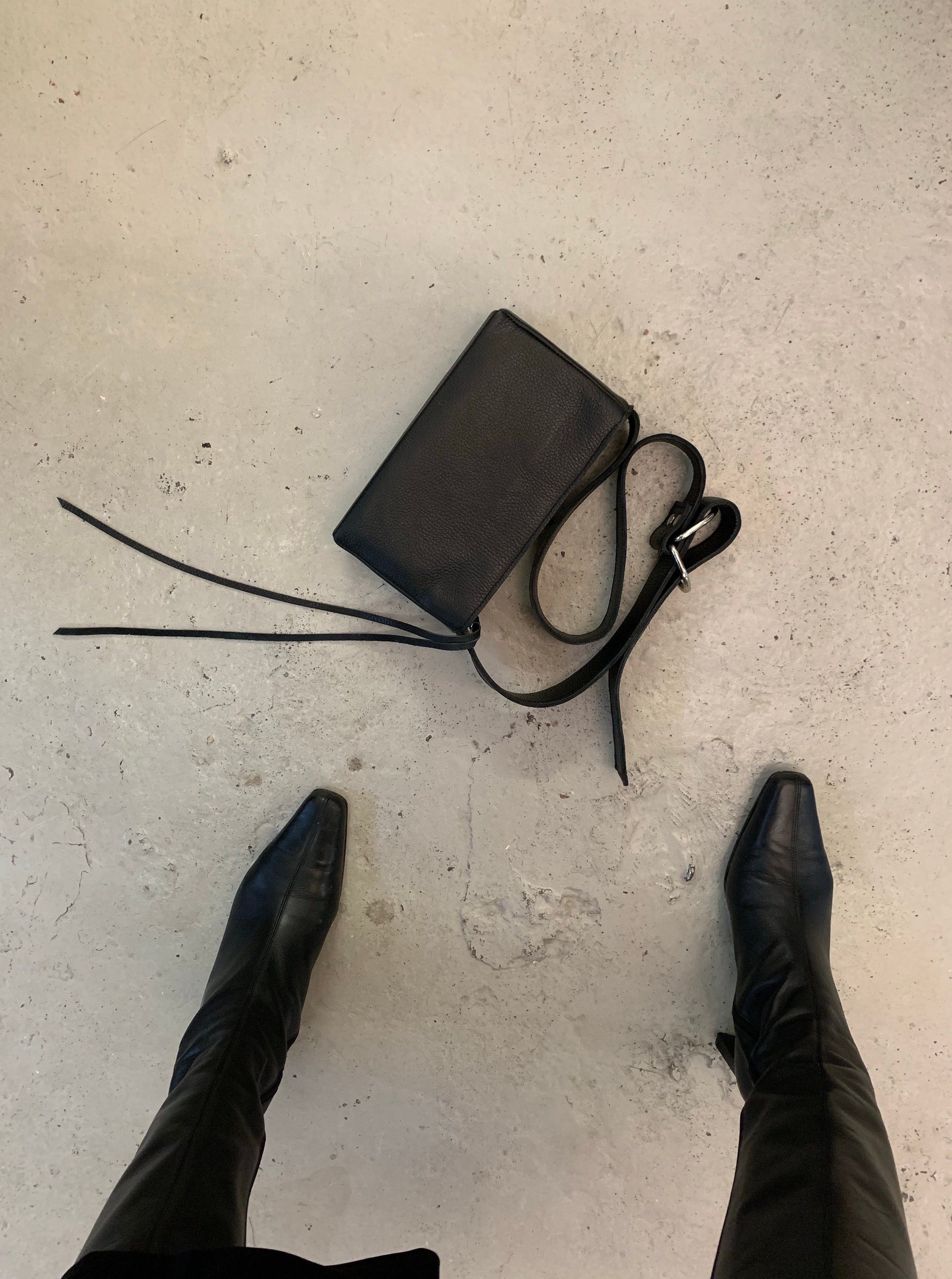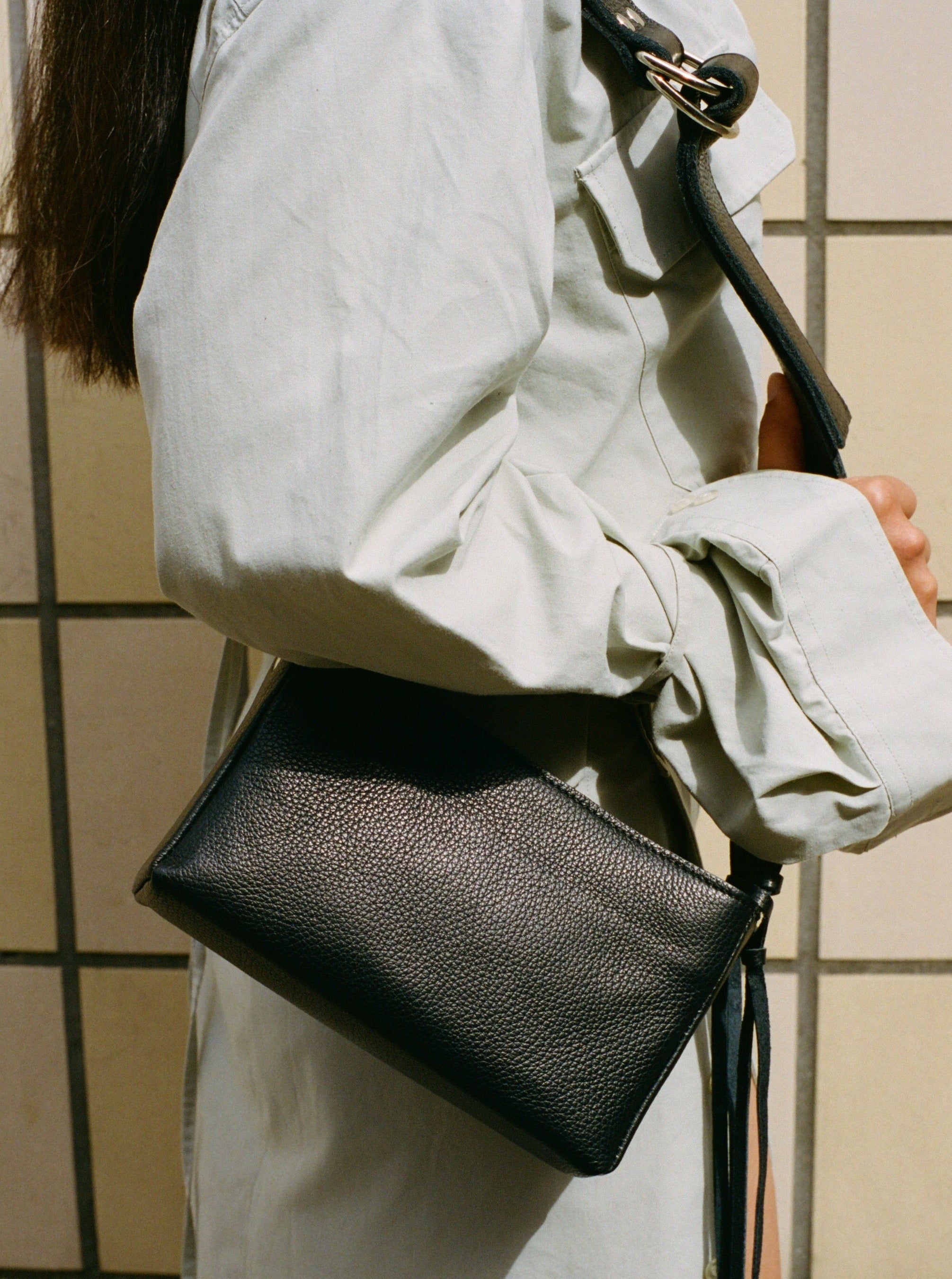 A forever classic: the Box Bag model in grained black leather with 100% black cotton lining. You can never go wrong with black! Wear elegantly on one shoulder or adjust the strap and carry it crossbody for day-to-day use. This rectangular shaped bag closes with a zipper and holds essentials like your phone, wallet and keys. Adjustable strap up to 100 centimeters.