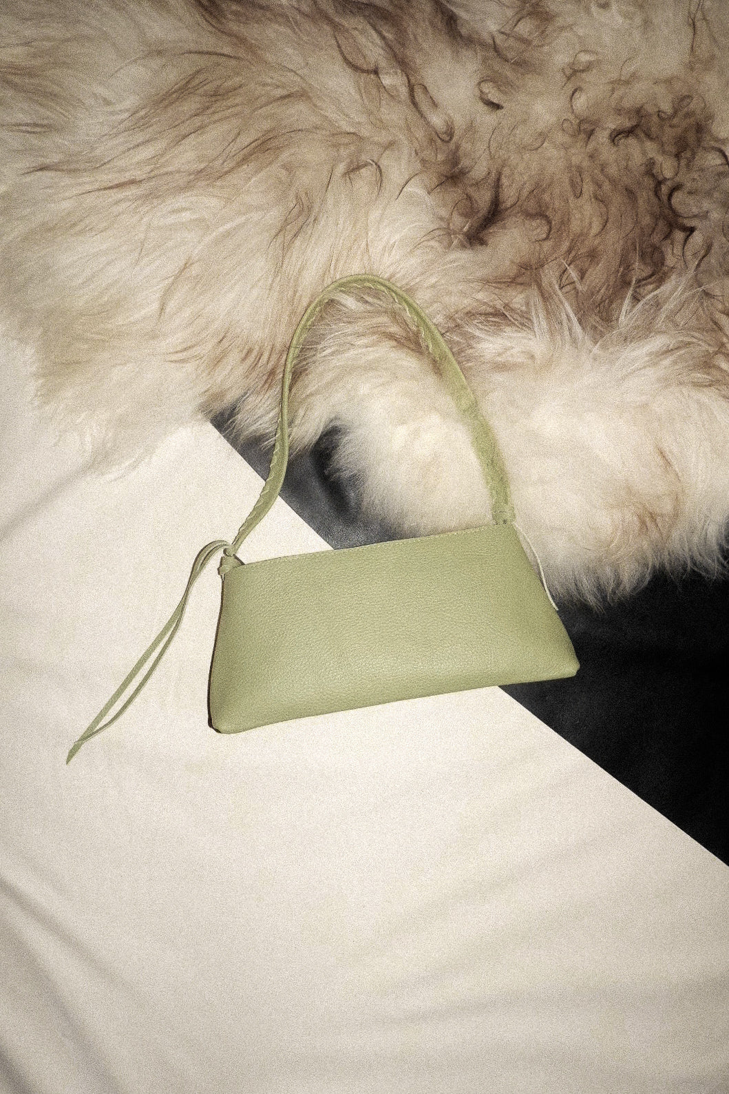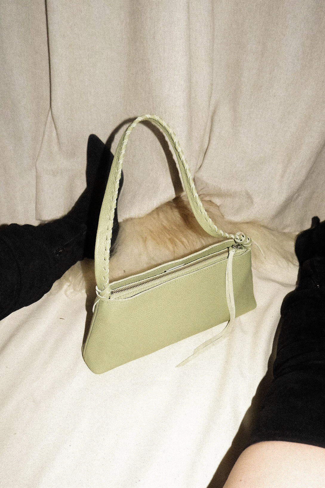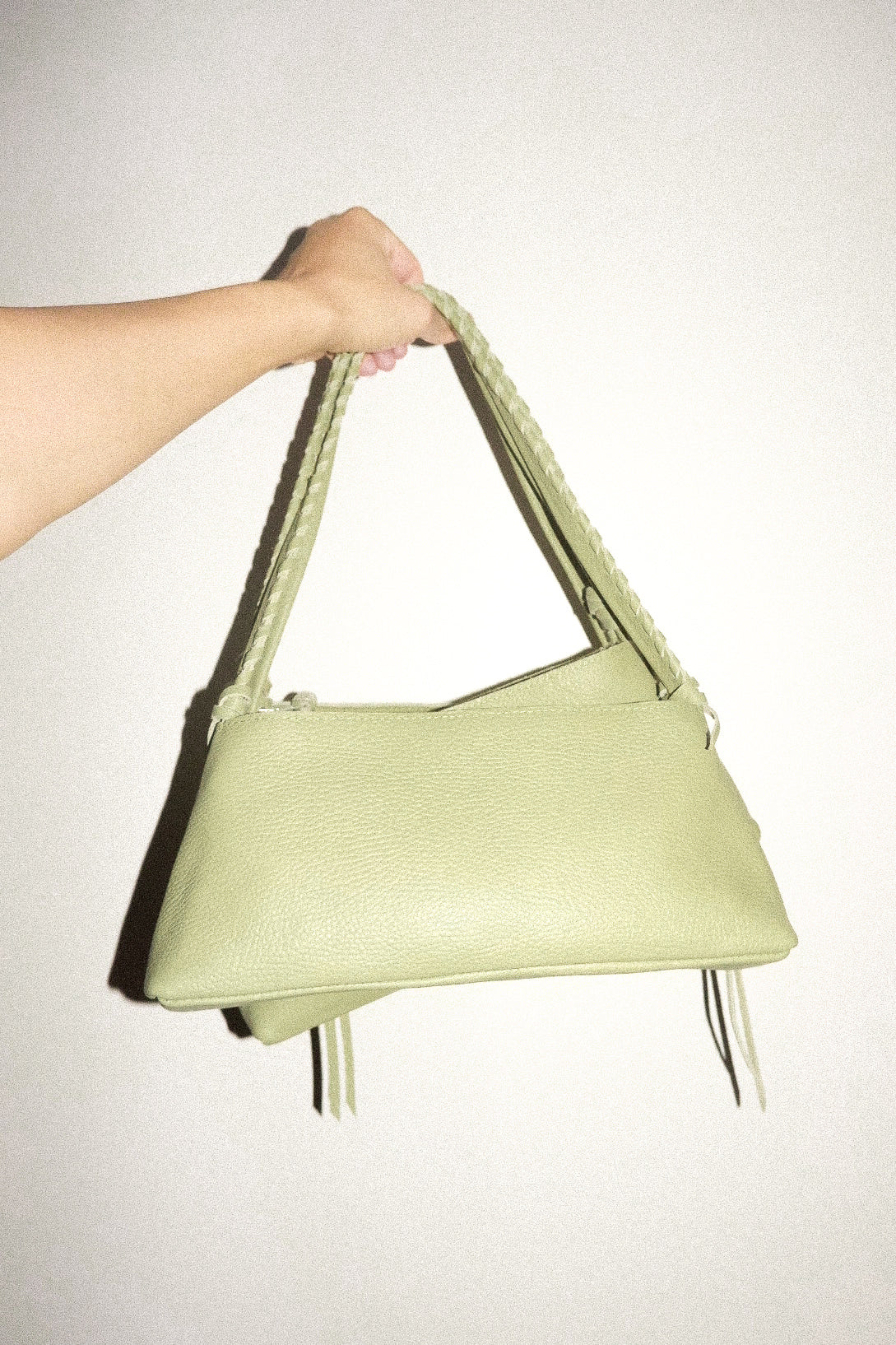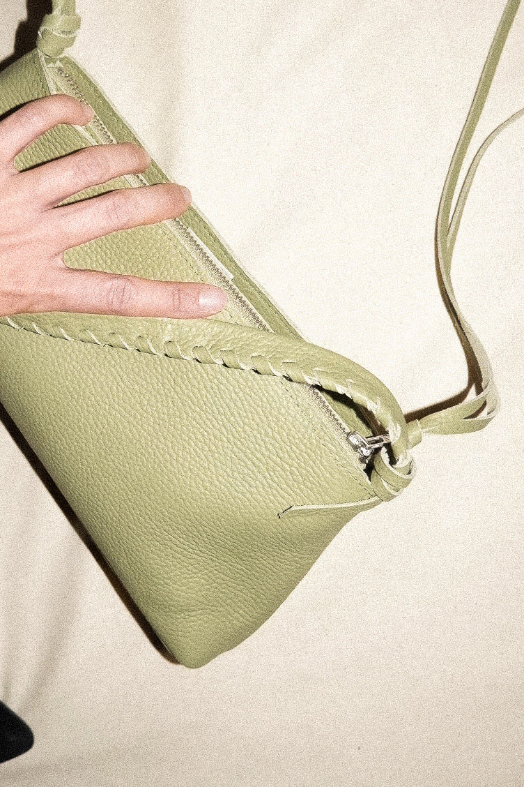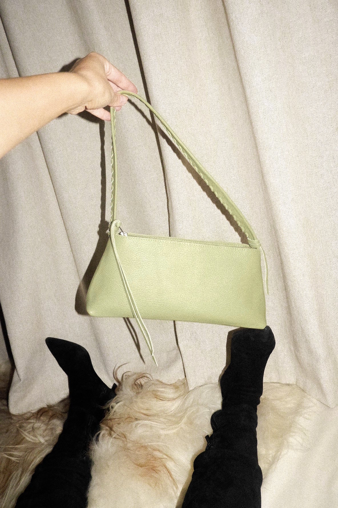 The Triangle Bag in Pistachio. Made of a grained leather with whip stitch detail on short shoulder strap with a green 100% cotton interior. The bag closes with a zipper and easily holds essentials like your phone, cards and keys. Limited availablity!