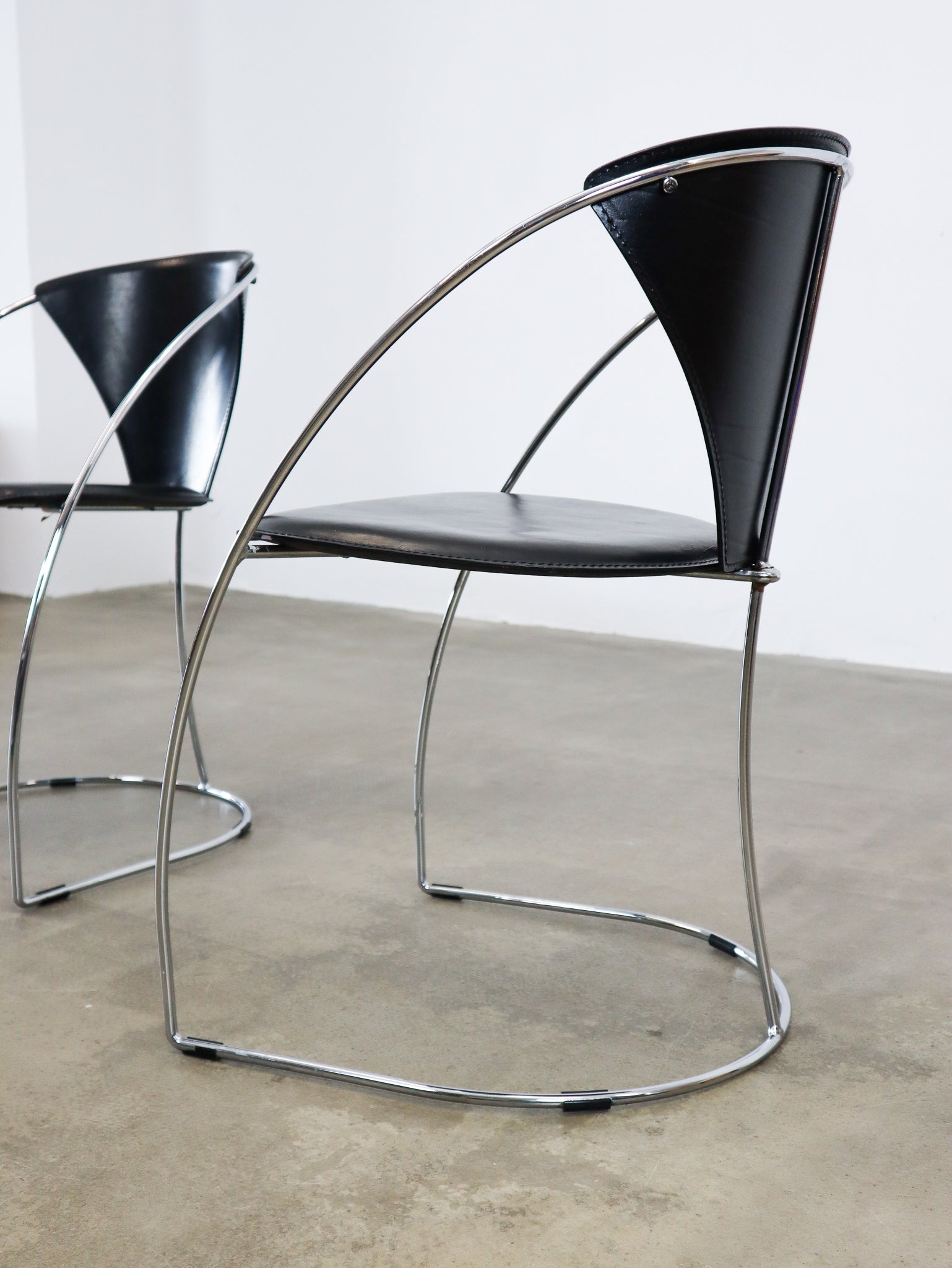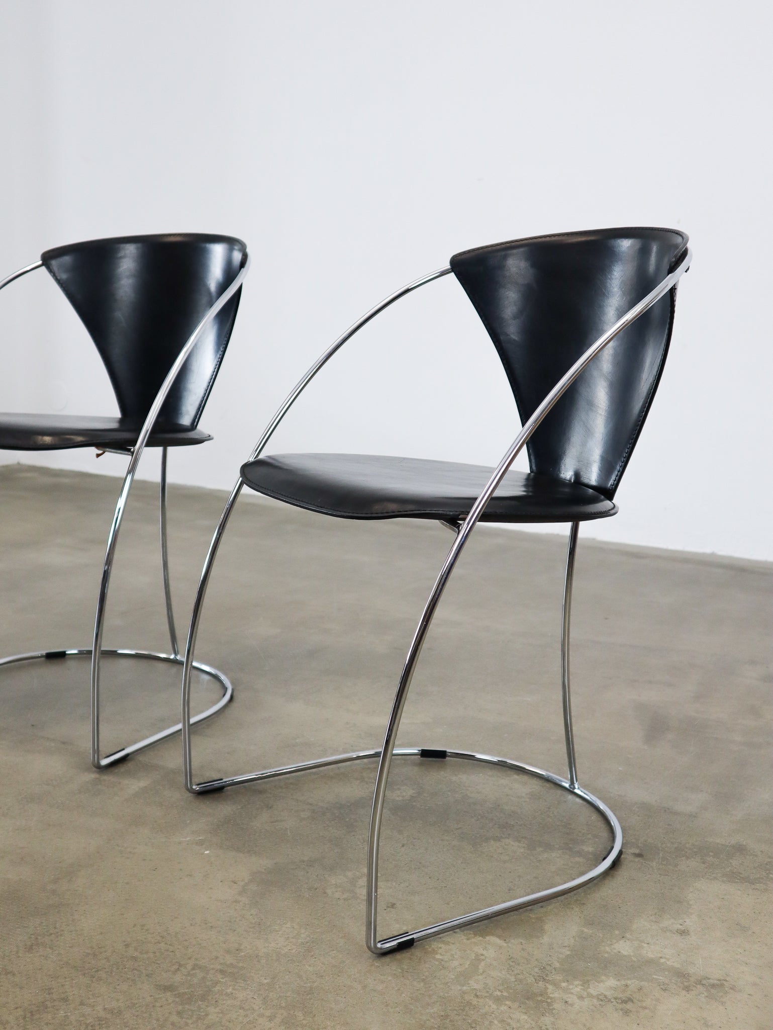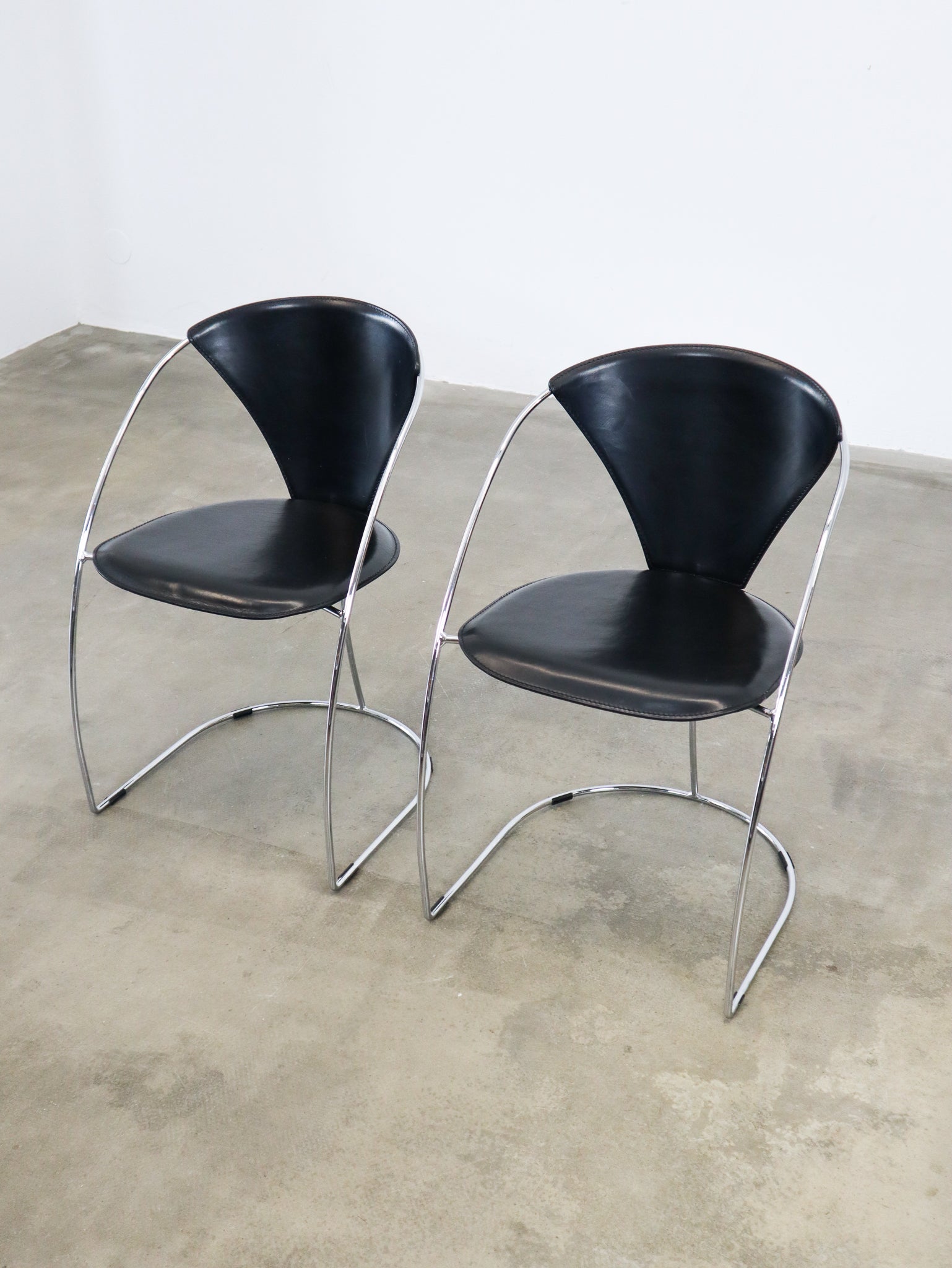 Black saddle leather chairs with a thin chrome frame, produced by Arbben Italy in the 1980's. We have eight pieces available.