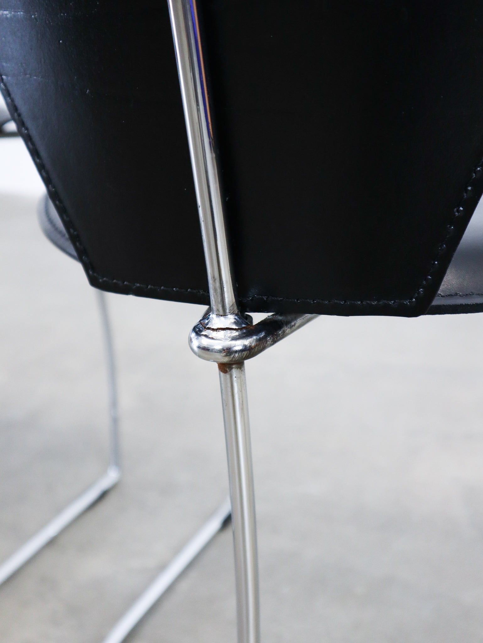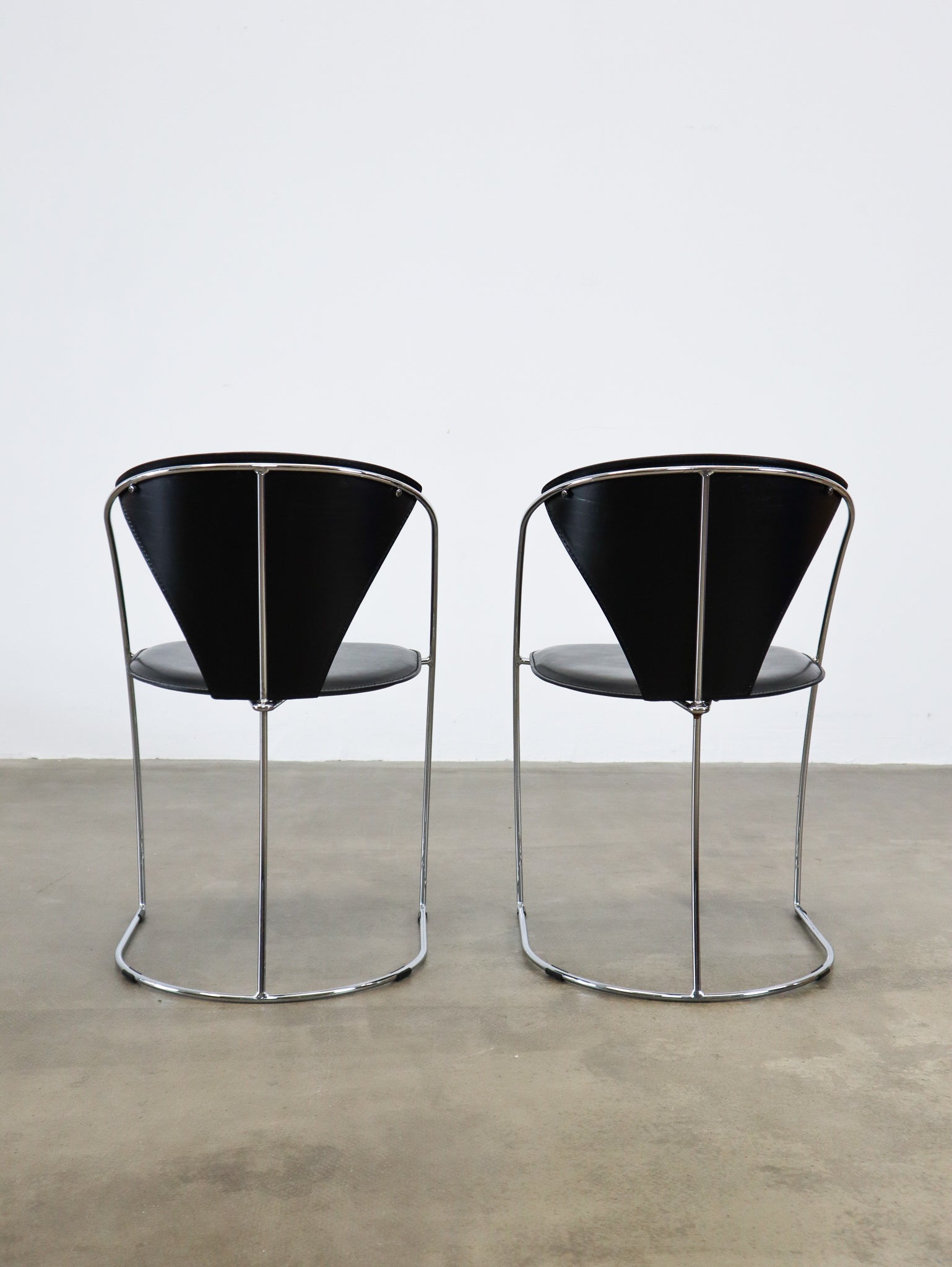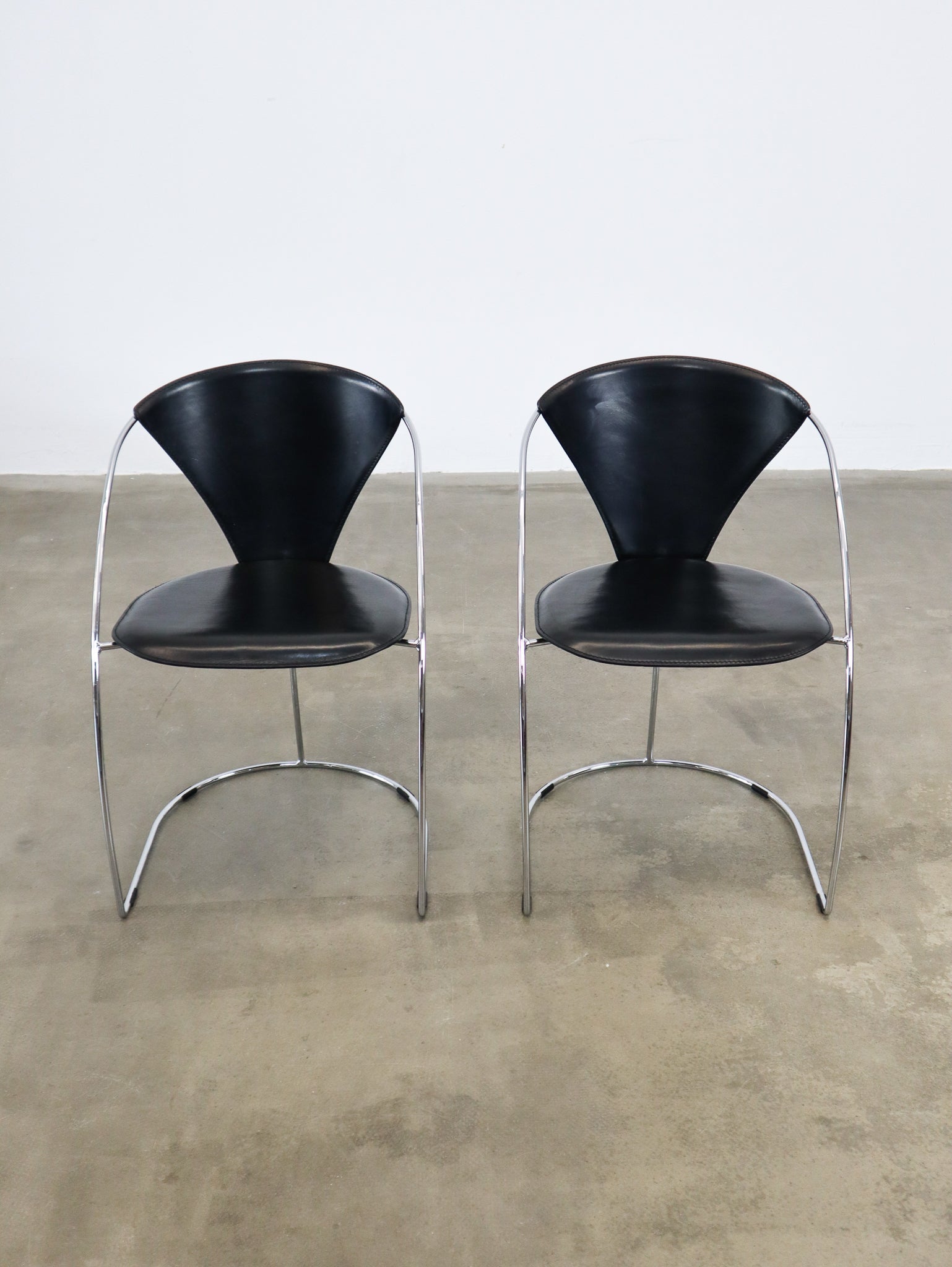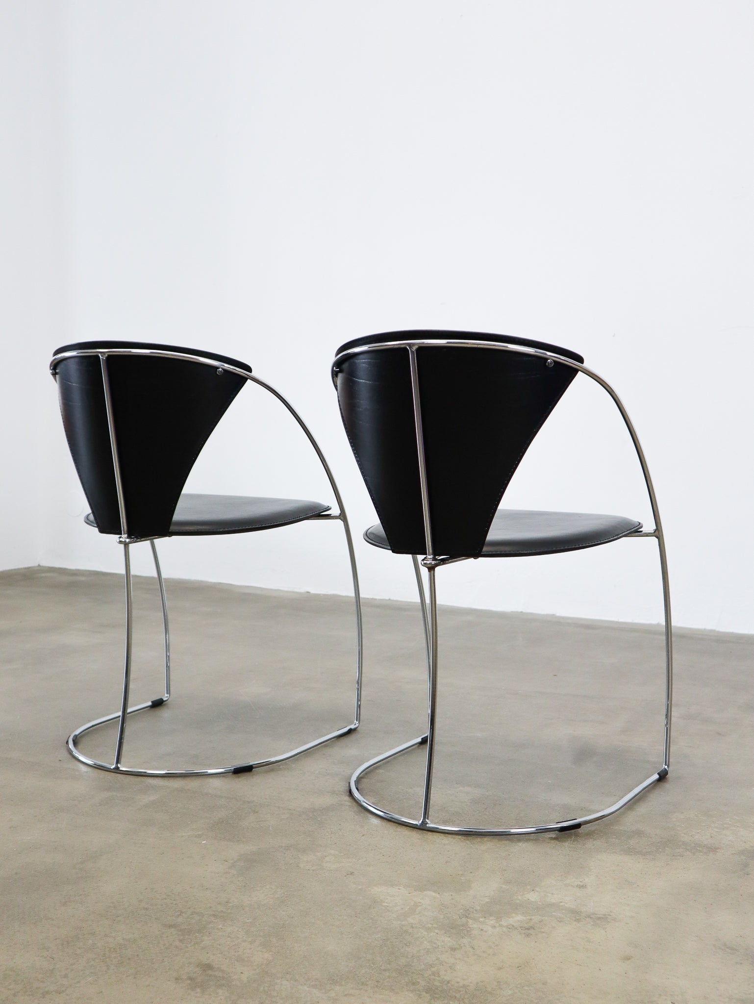 Black saddle leather chairs with a thin chrome frame, produced by Arbben Italy in the 1980's. We have eight pieces available.