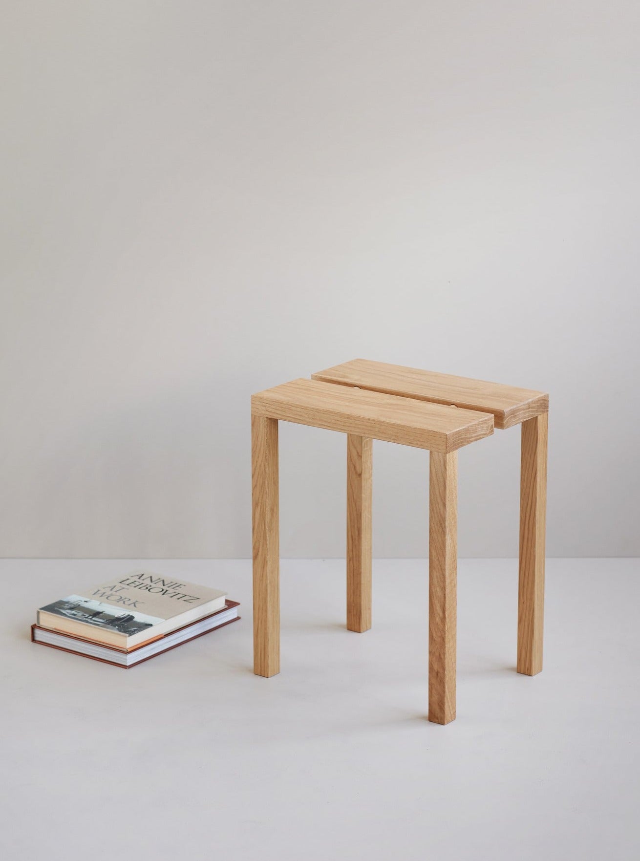 The stool comes flat packed and is made in Europe in FSC-certified oak.