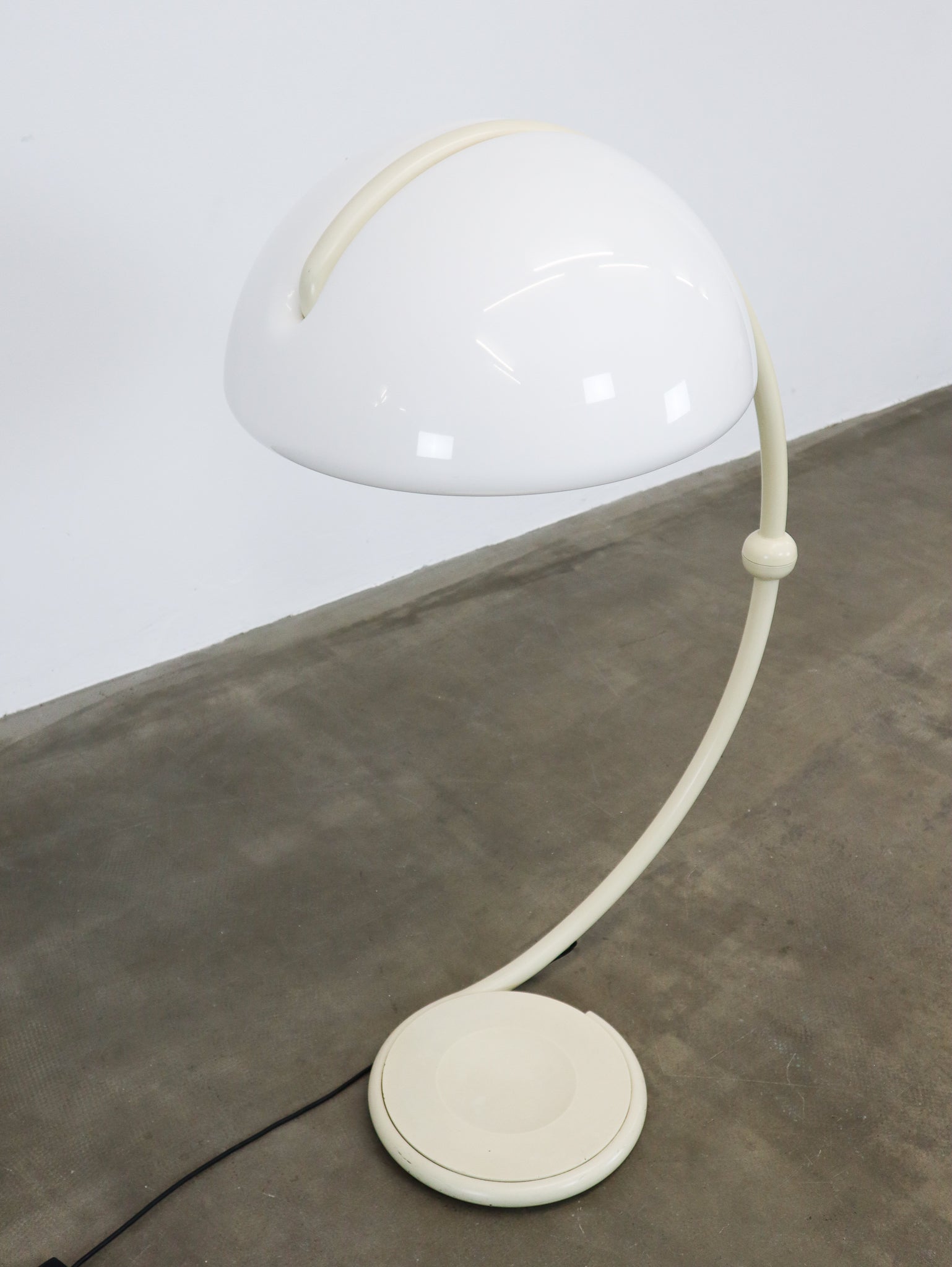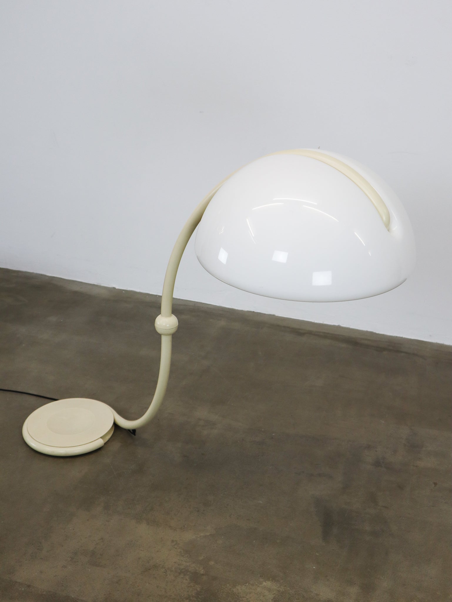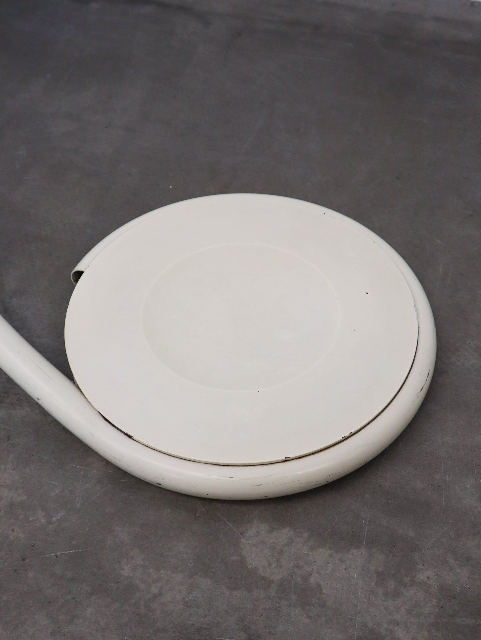 Vintage Serpente floorlamp with a white steel rotating frame and white round plastic shade, designed by Elio Martinelli for Luce Martinelli in the 1960s.