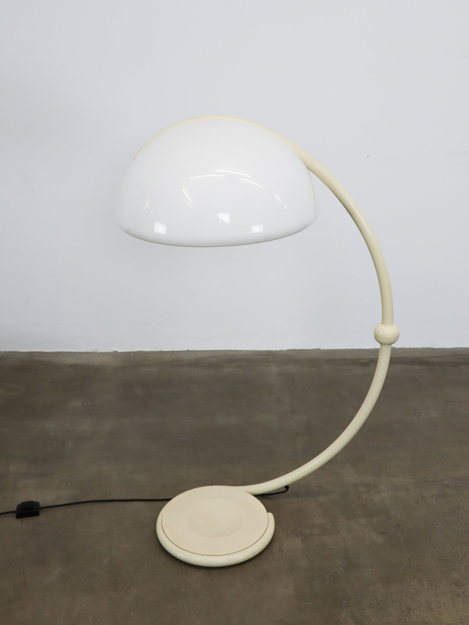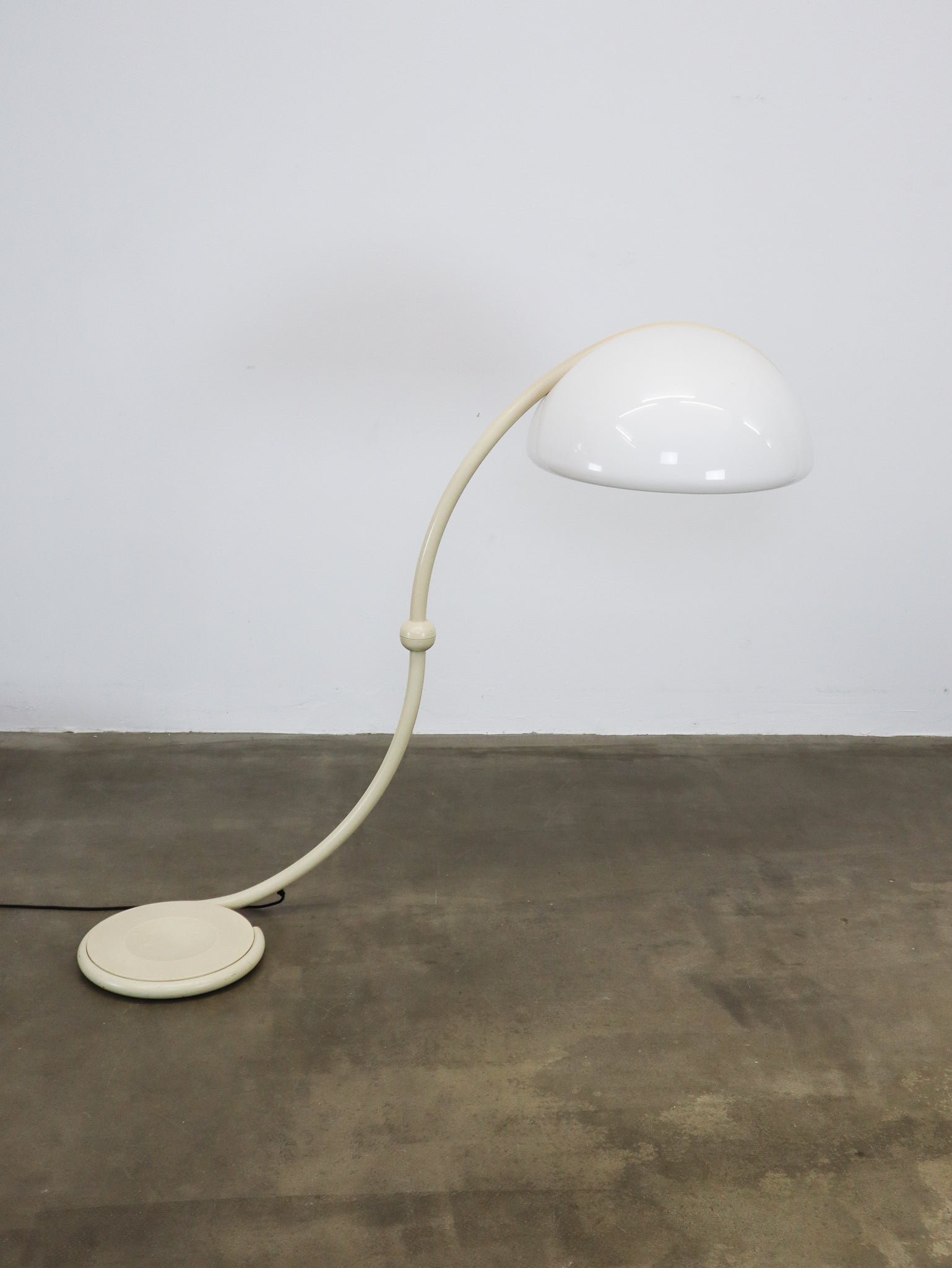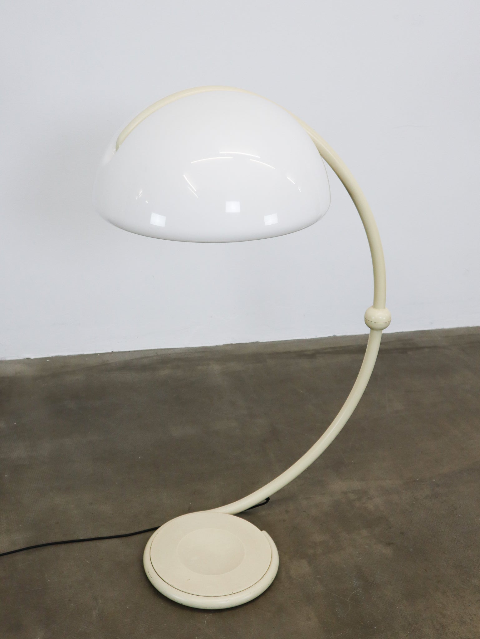 Vintage Serpente floorlamp with a white steel rotating frame and white round plastic shade, designed by Elio Martinelli for Luce Martinelli in the 1960s.