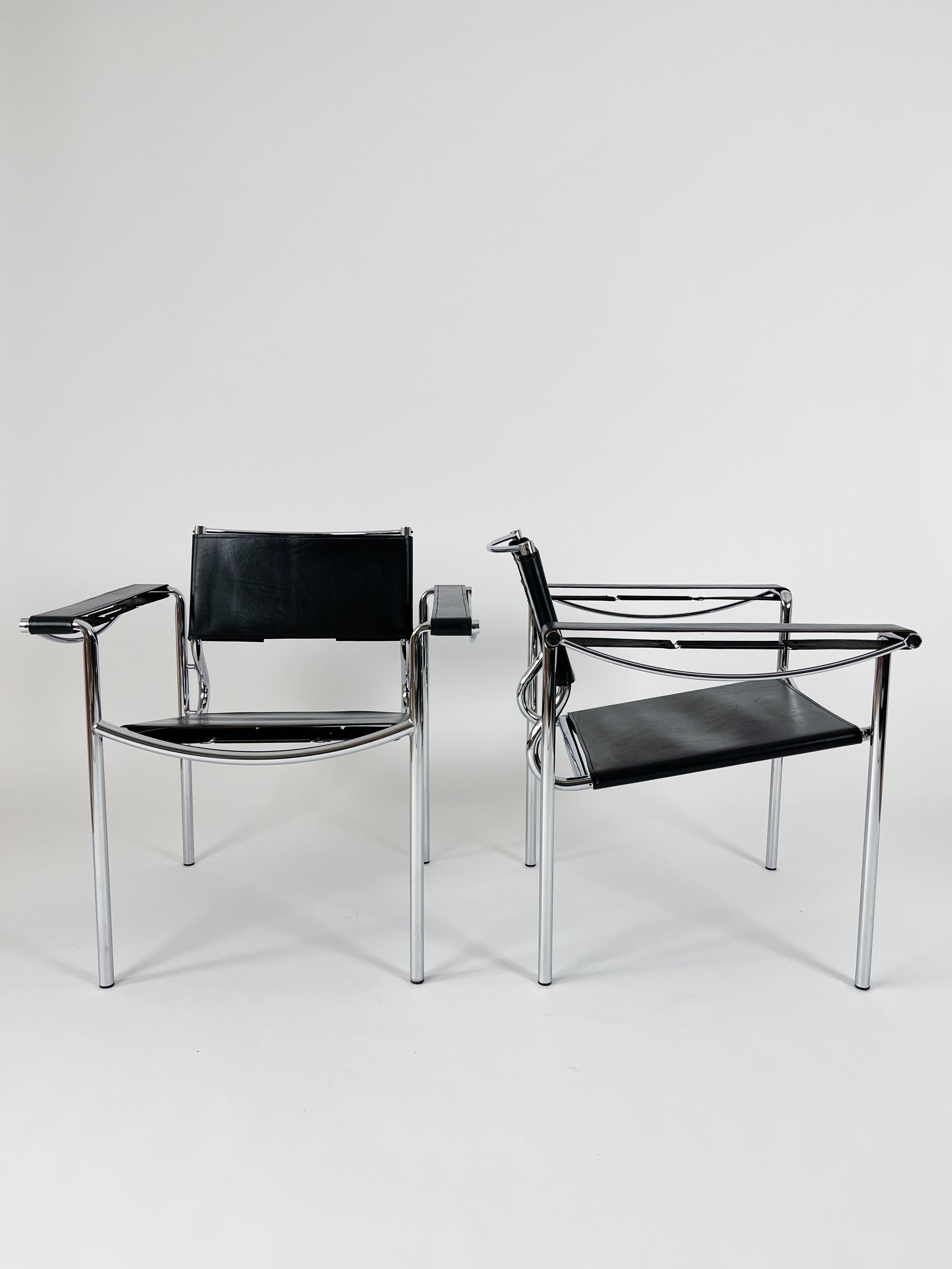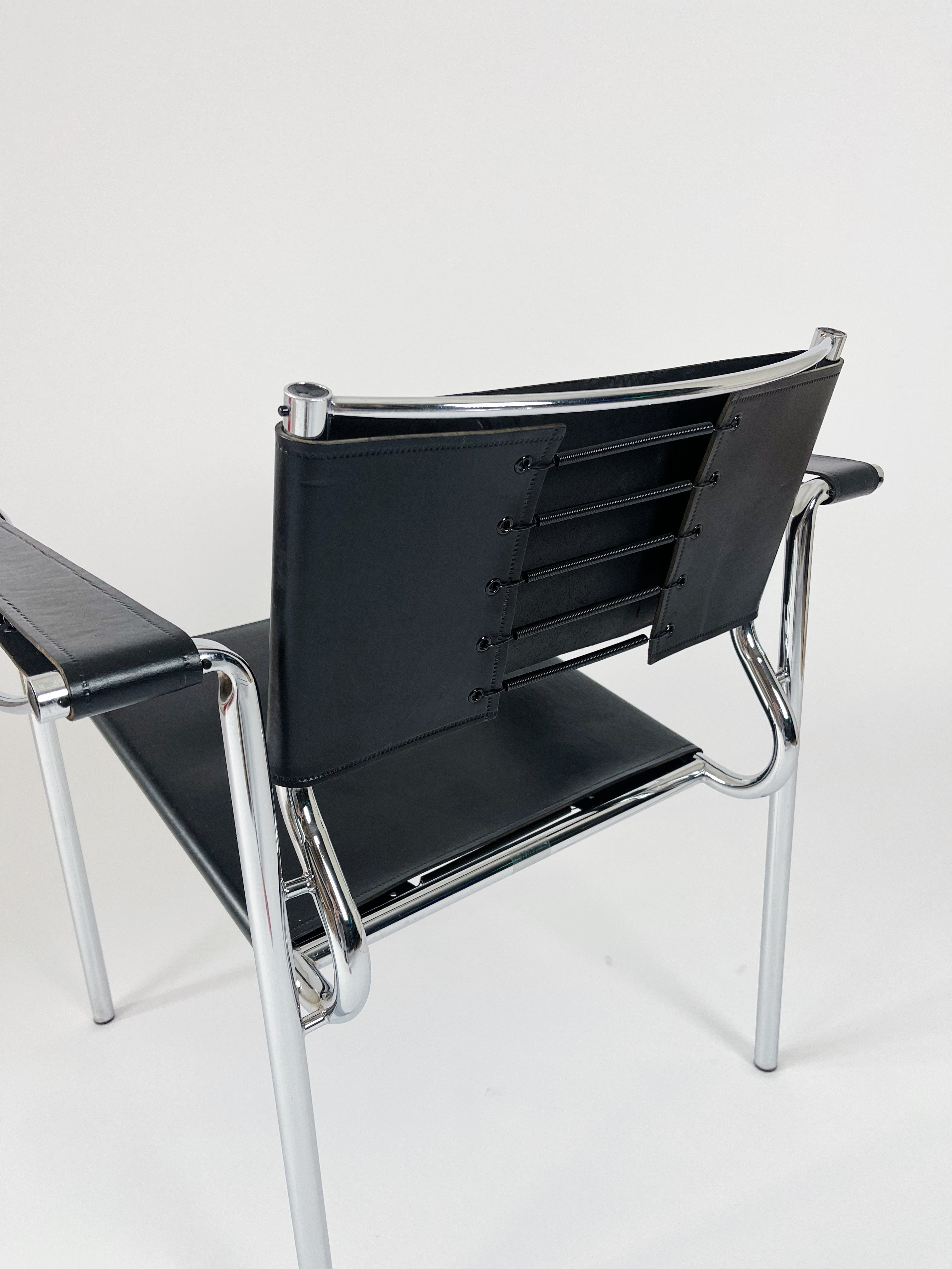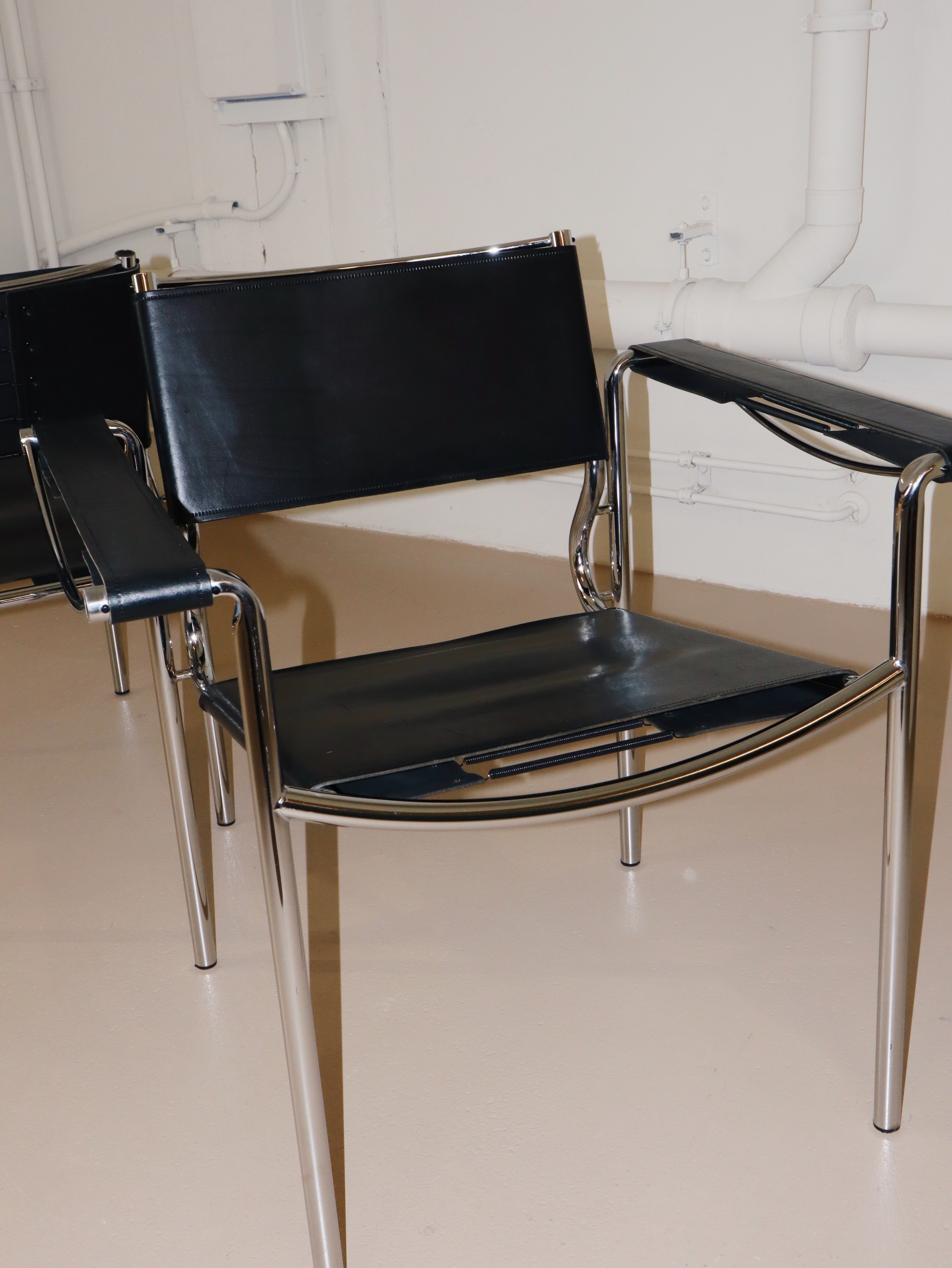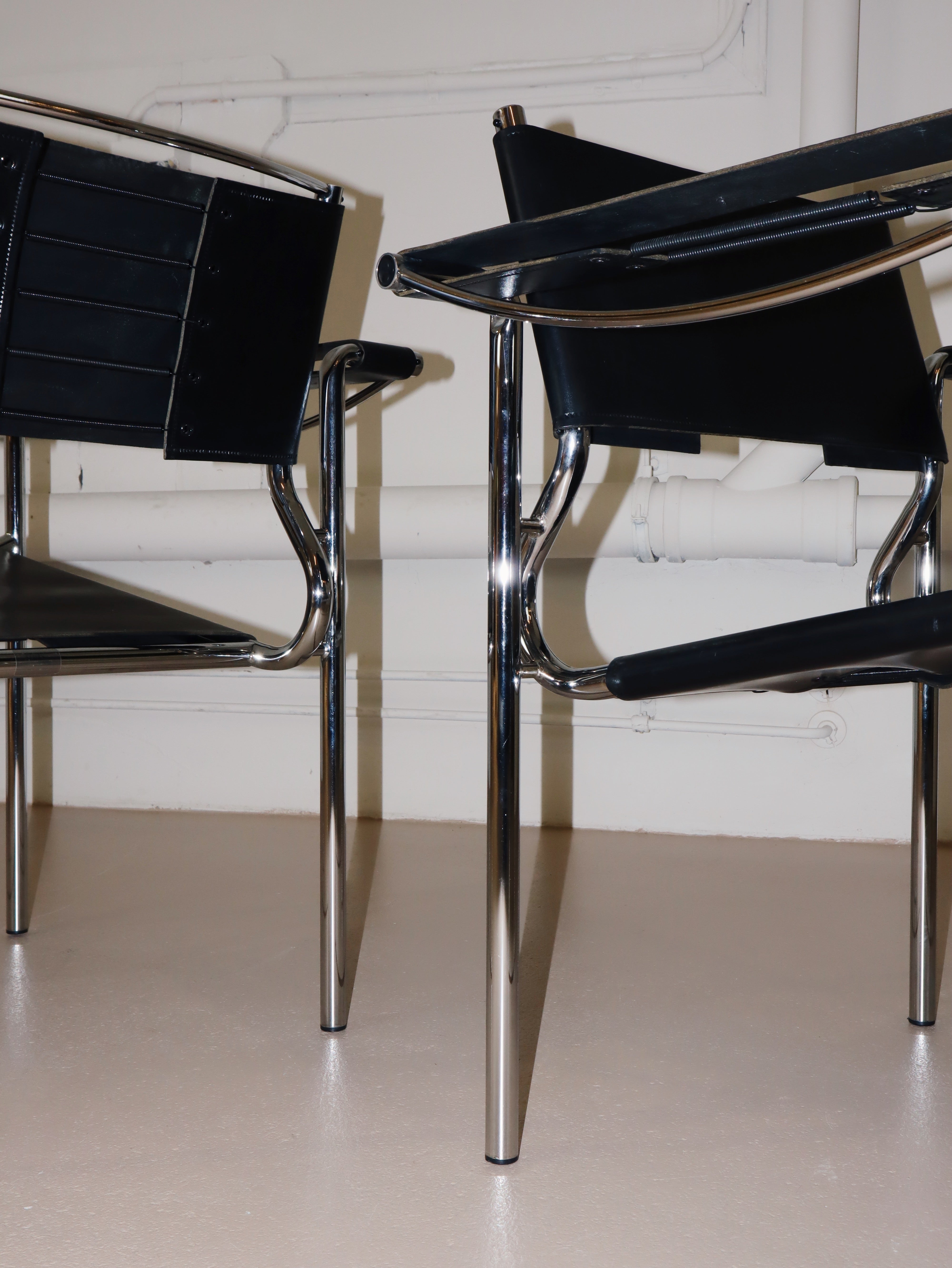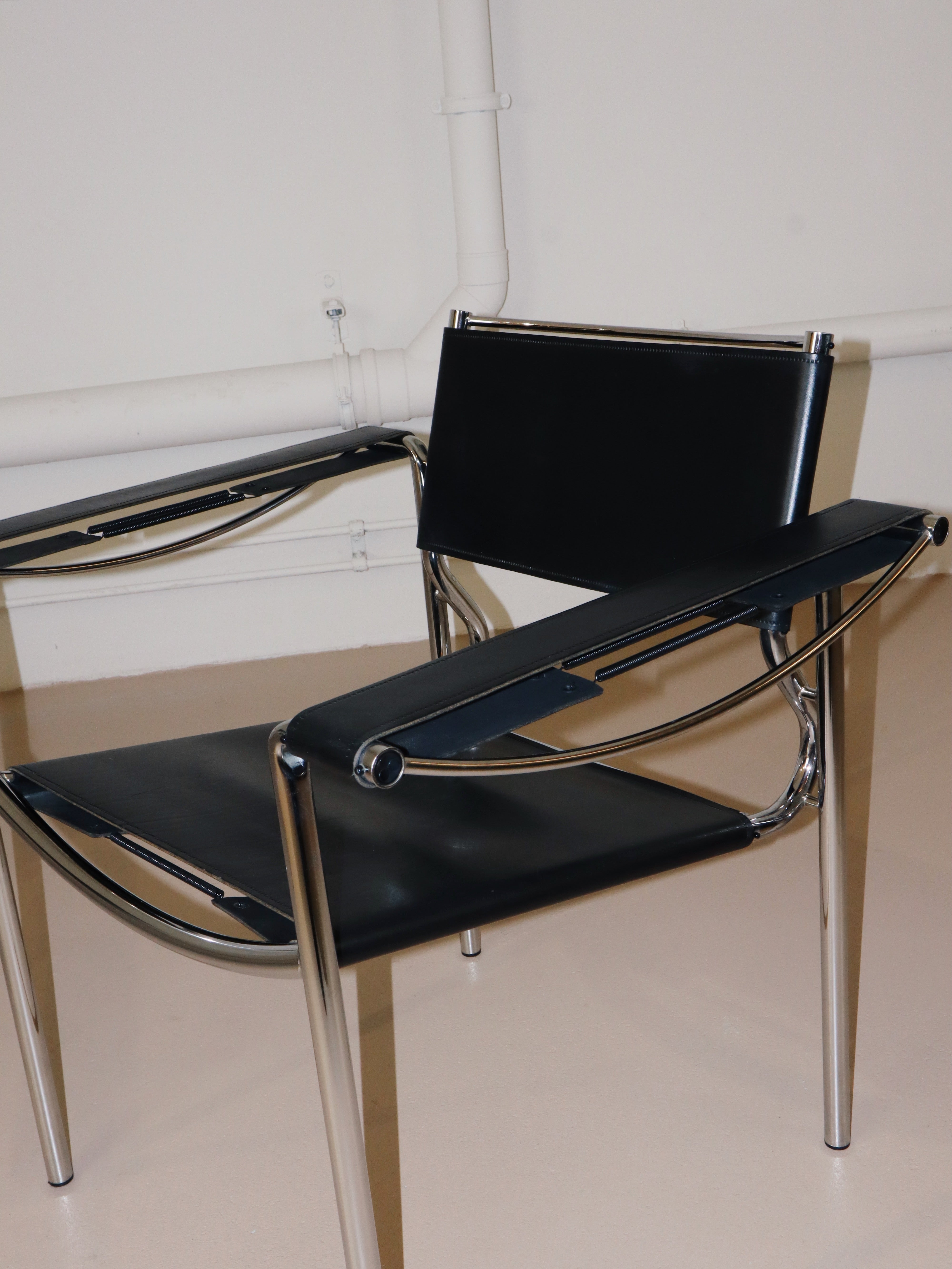 Set of two black saddle leather armchairs and a chrome frame, available per piece or as a set. The leather pieces of the seat, backrest and armrests are cleverly tied together with metal springs. Feels like Giandomenico Belotti decided to design his own version of the 1970s LC1 chair (Le Corbusier) and gave it some more curves for Alias. We thank him for it!