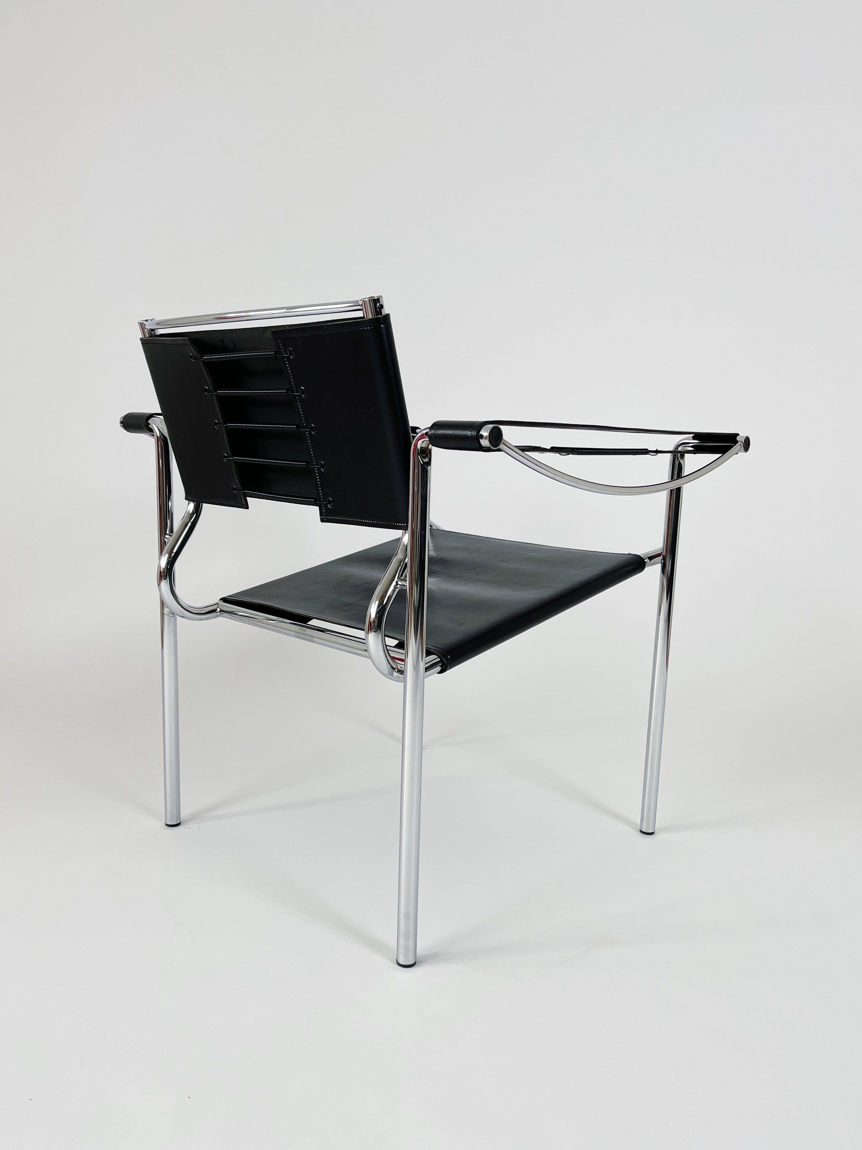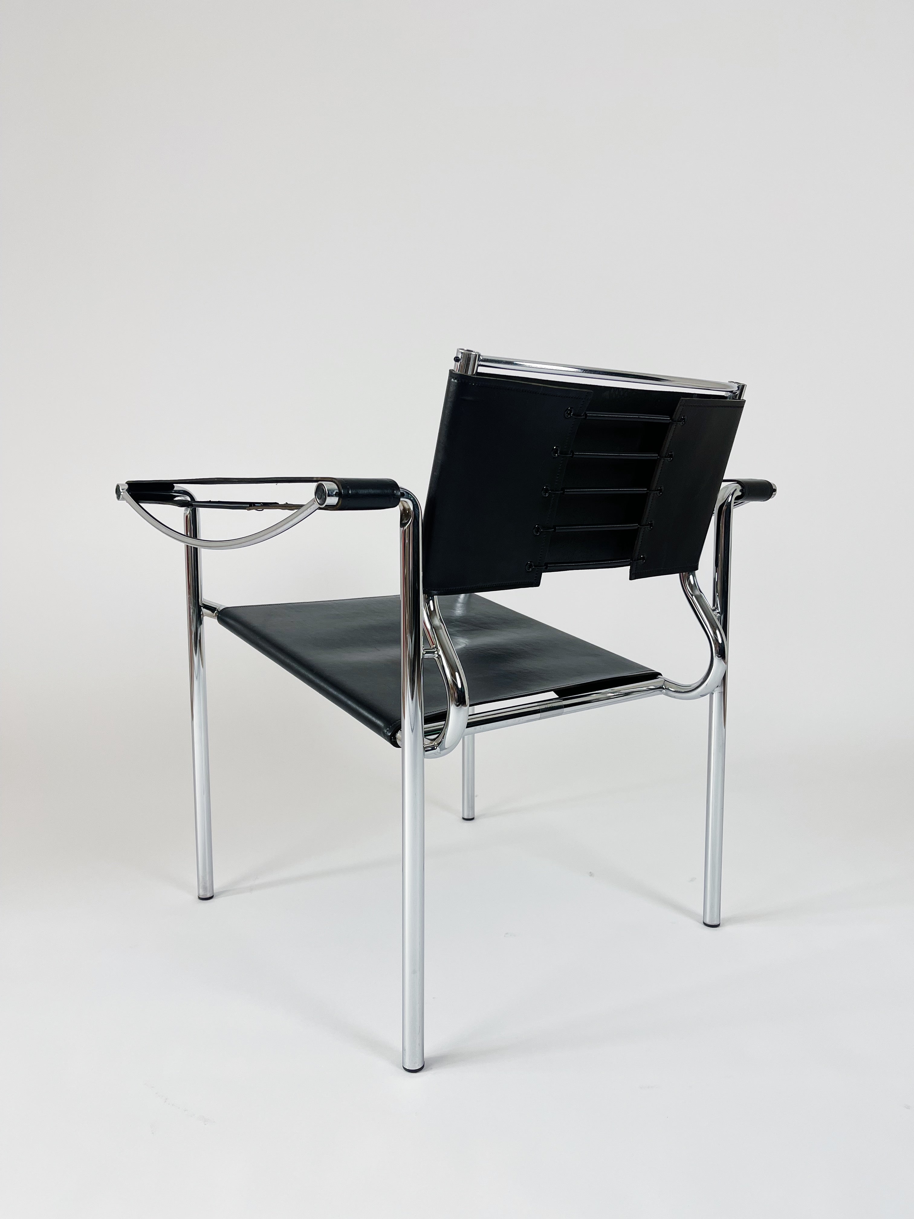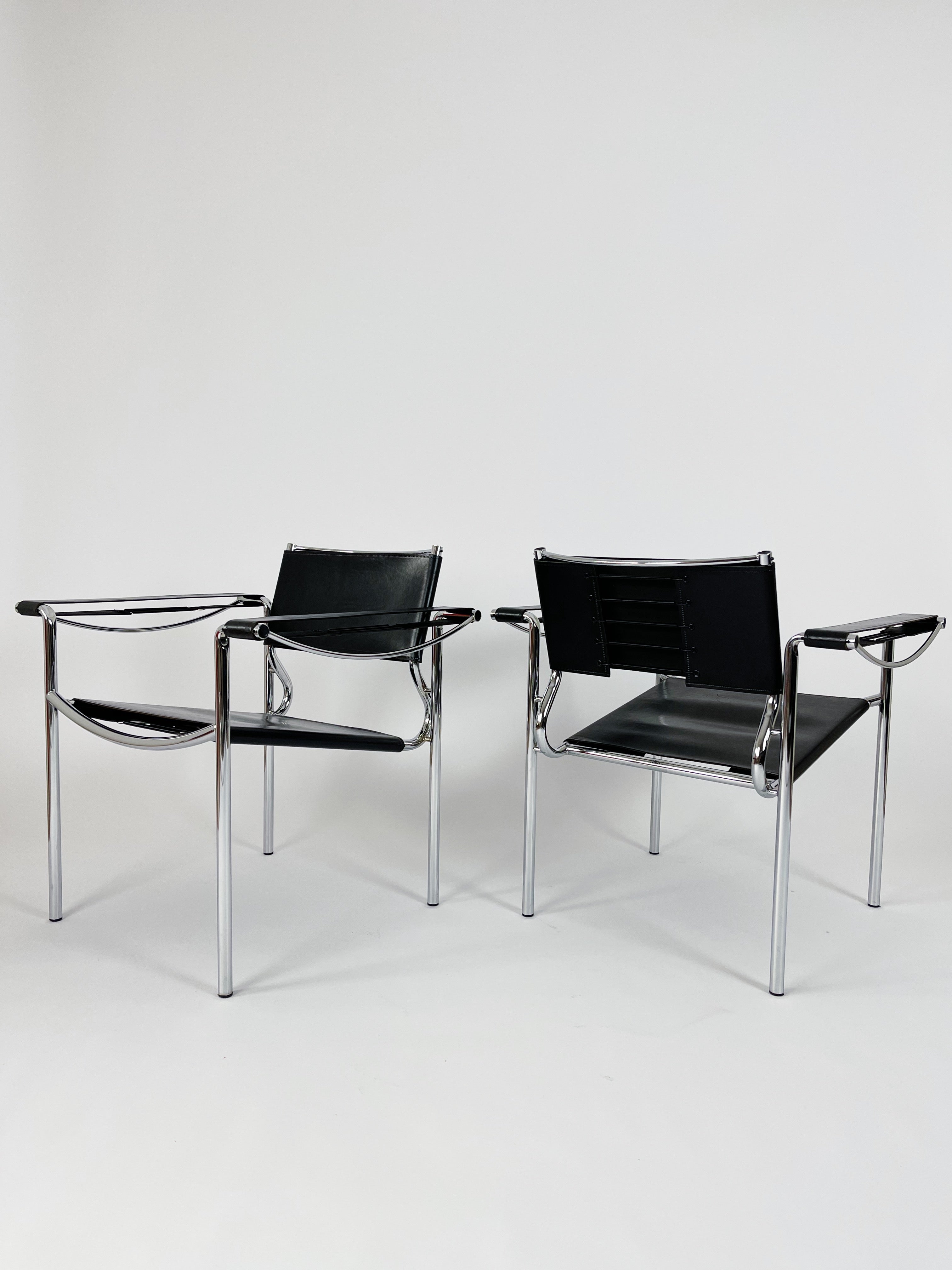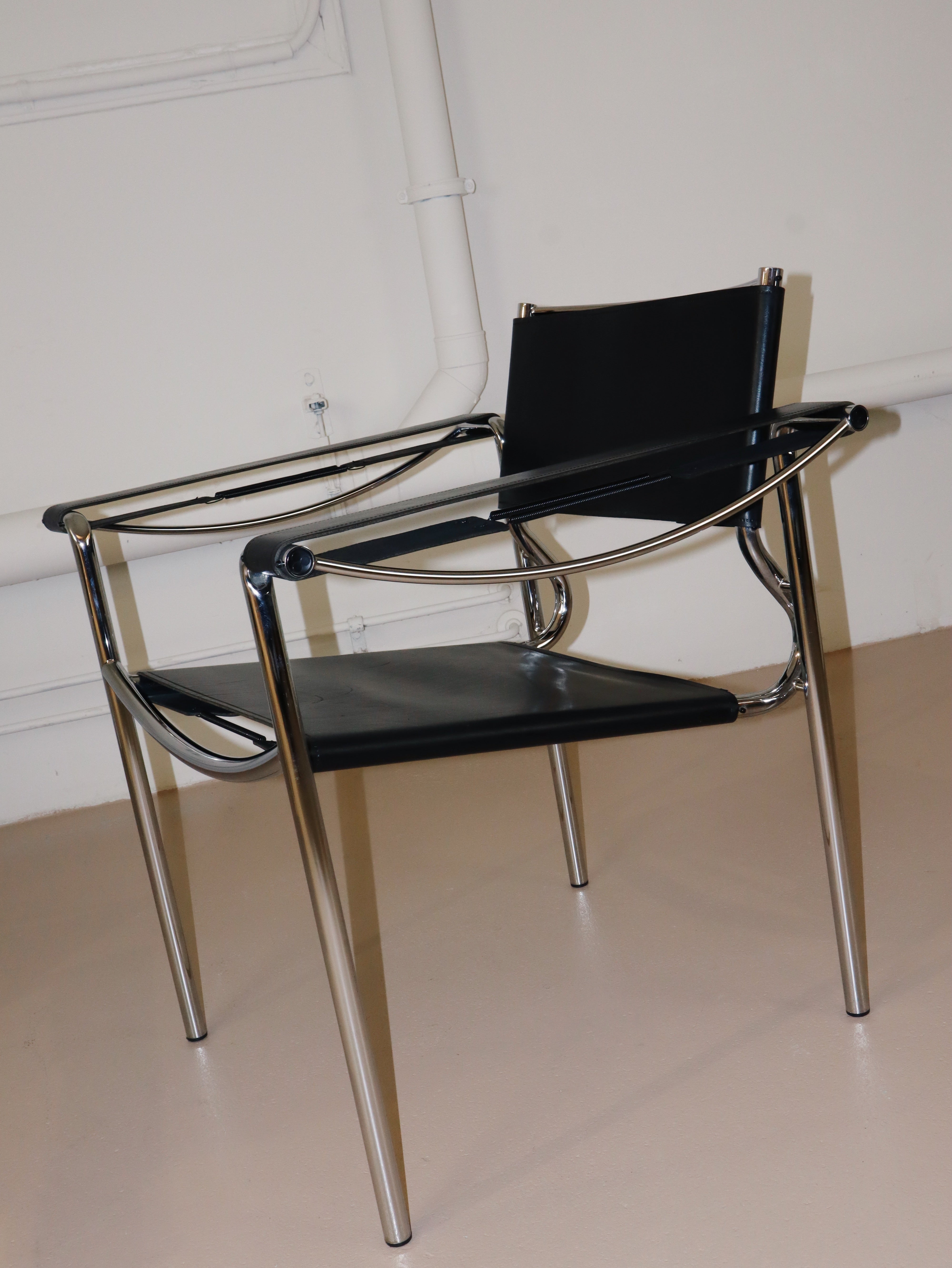 Set of two black saddle leather armchairs and a chrome frame, available per piece or as a set. The leather pieces of the seat, backrest and armrests are cleverly tied together with metal springs. Feels like Giandomenico Belotti decided to design his own version of the 1970s LC1 chair (Le Corbusier) and gave it some more curves for Alias. We thank him for it!
