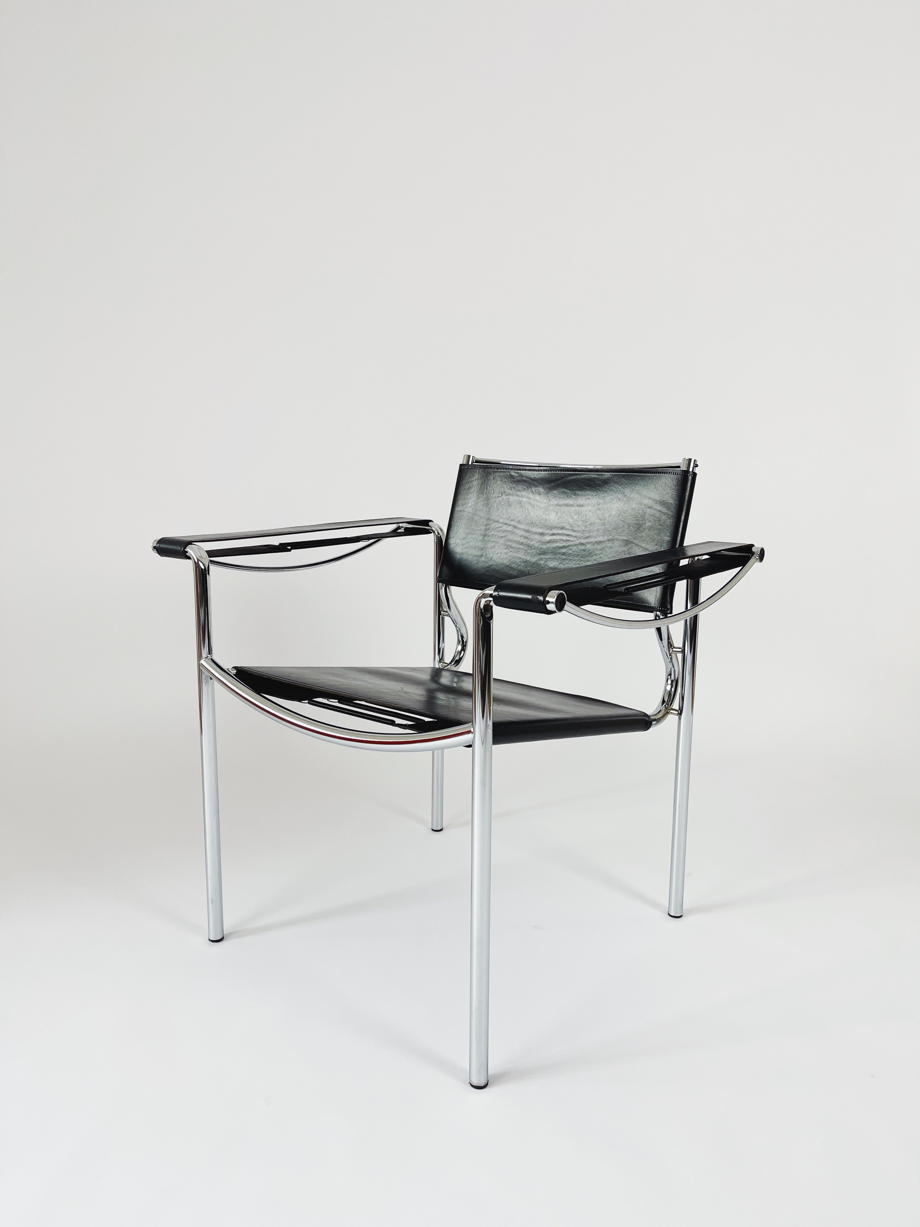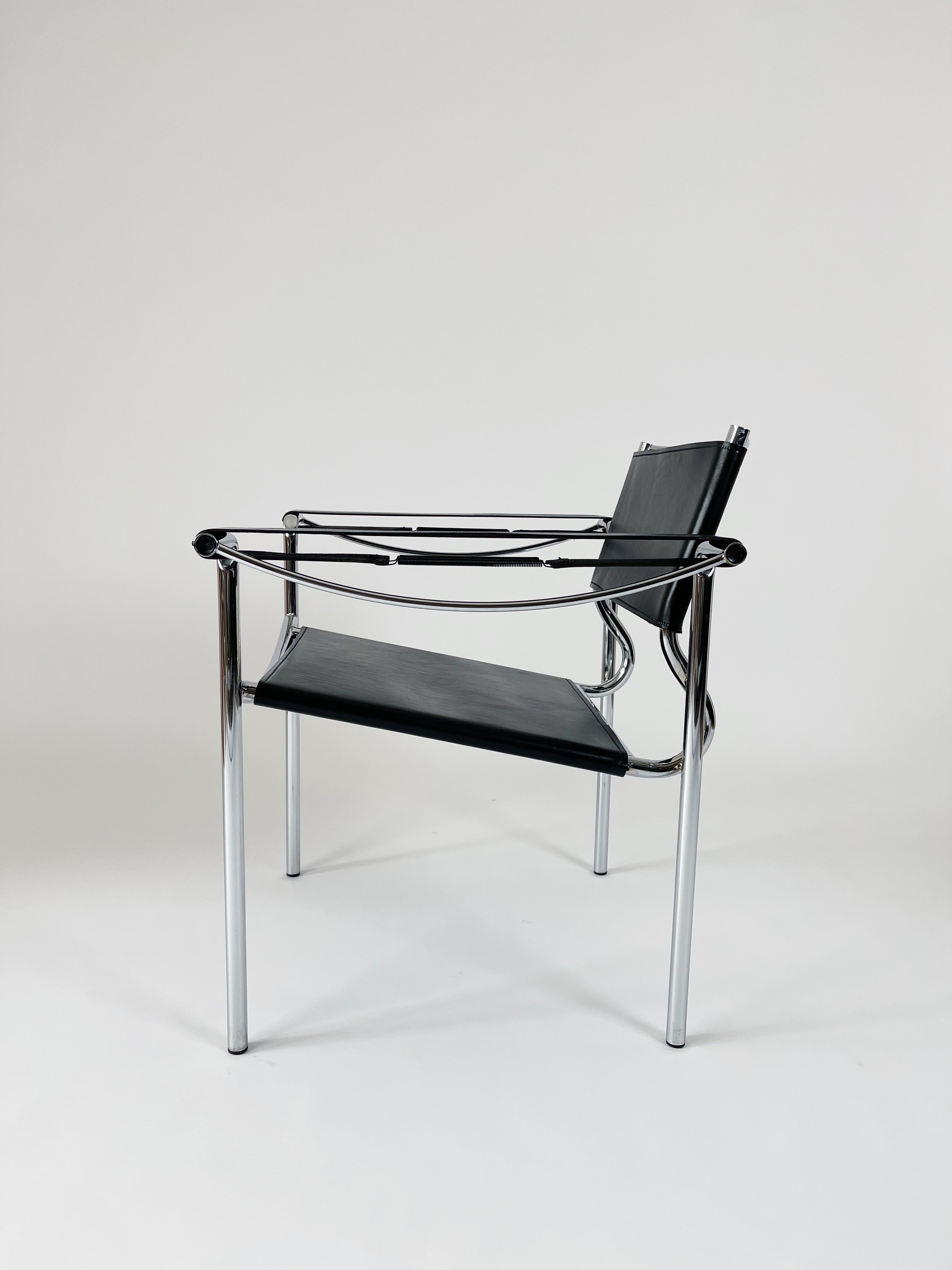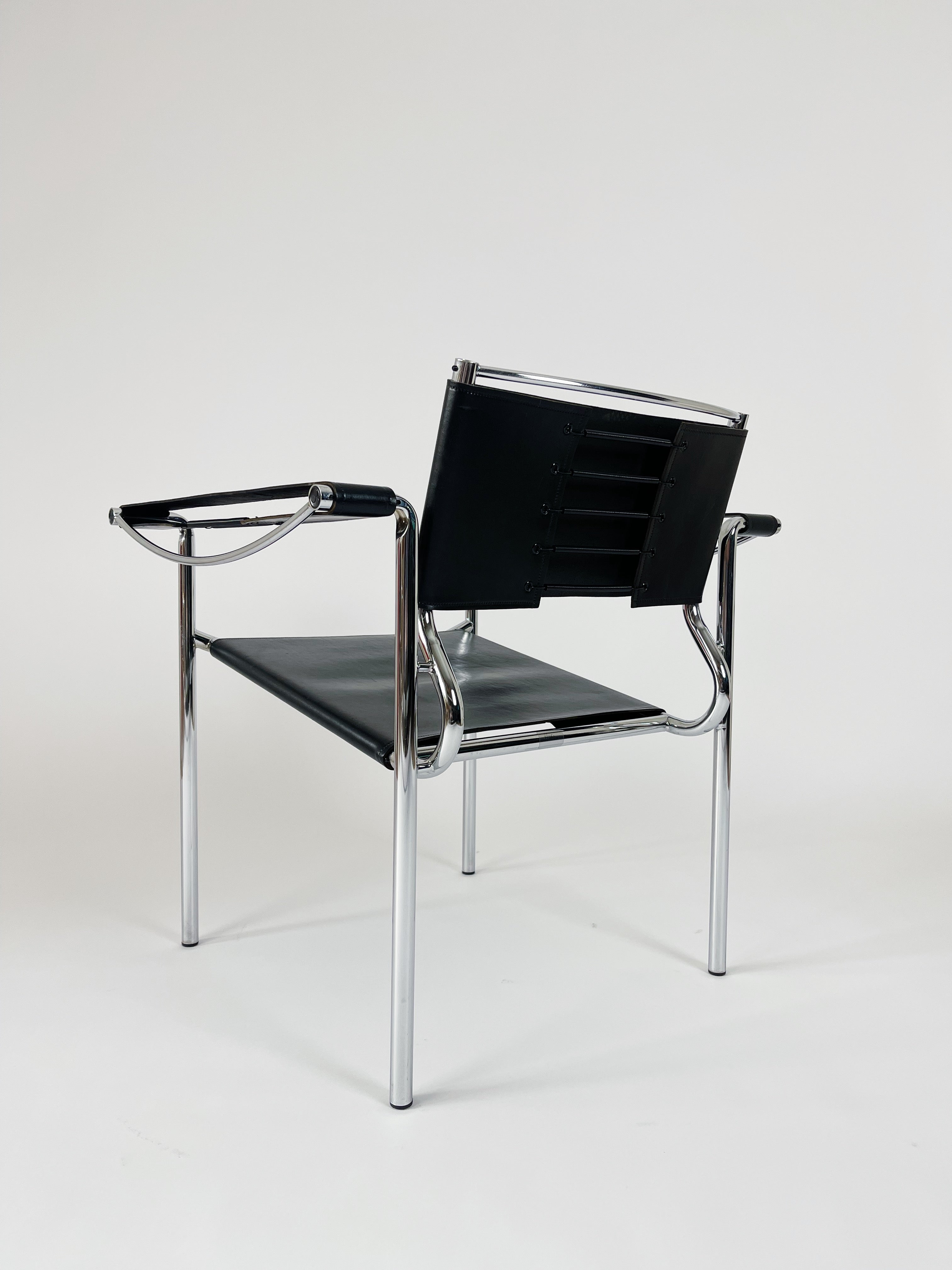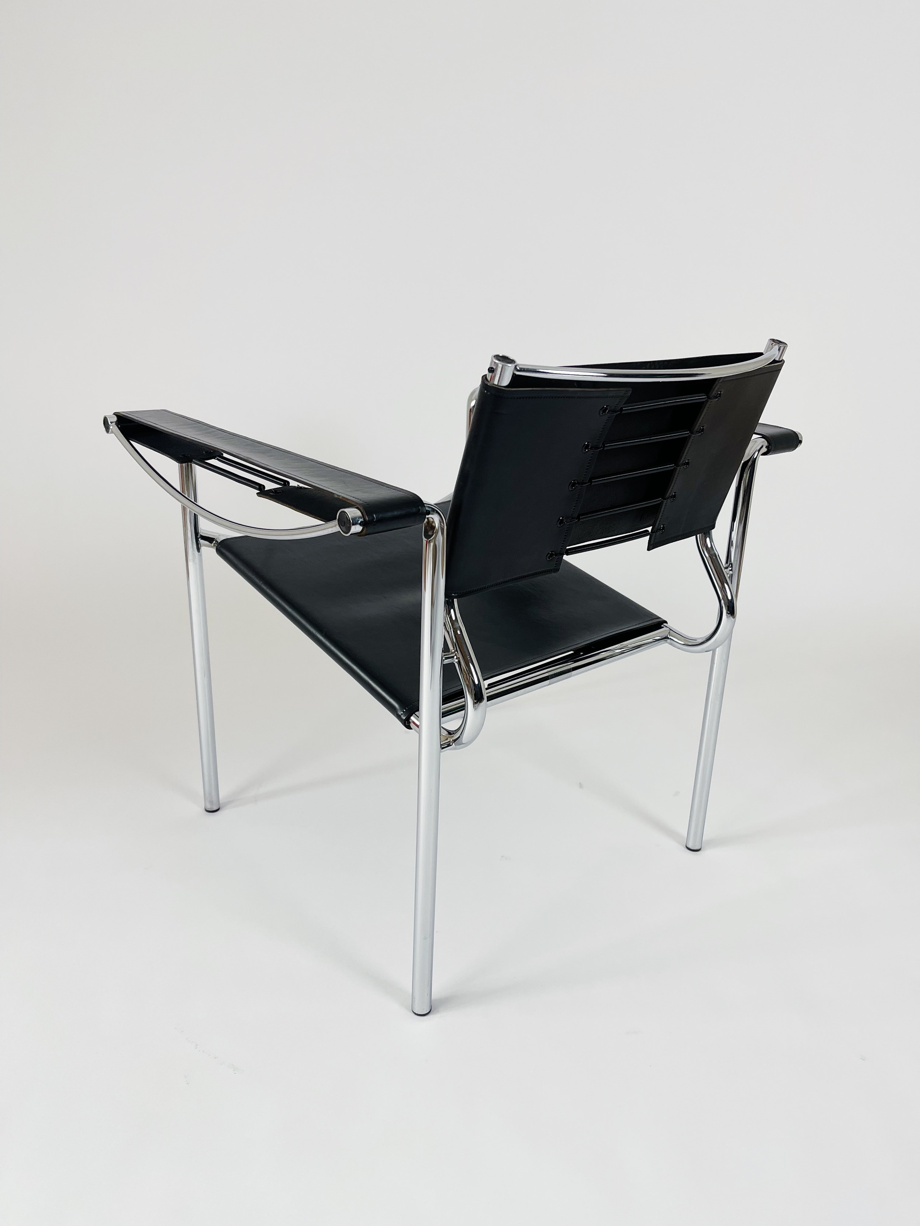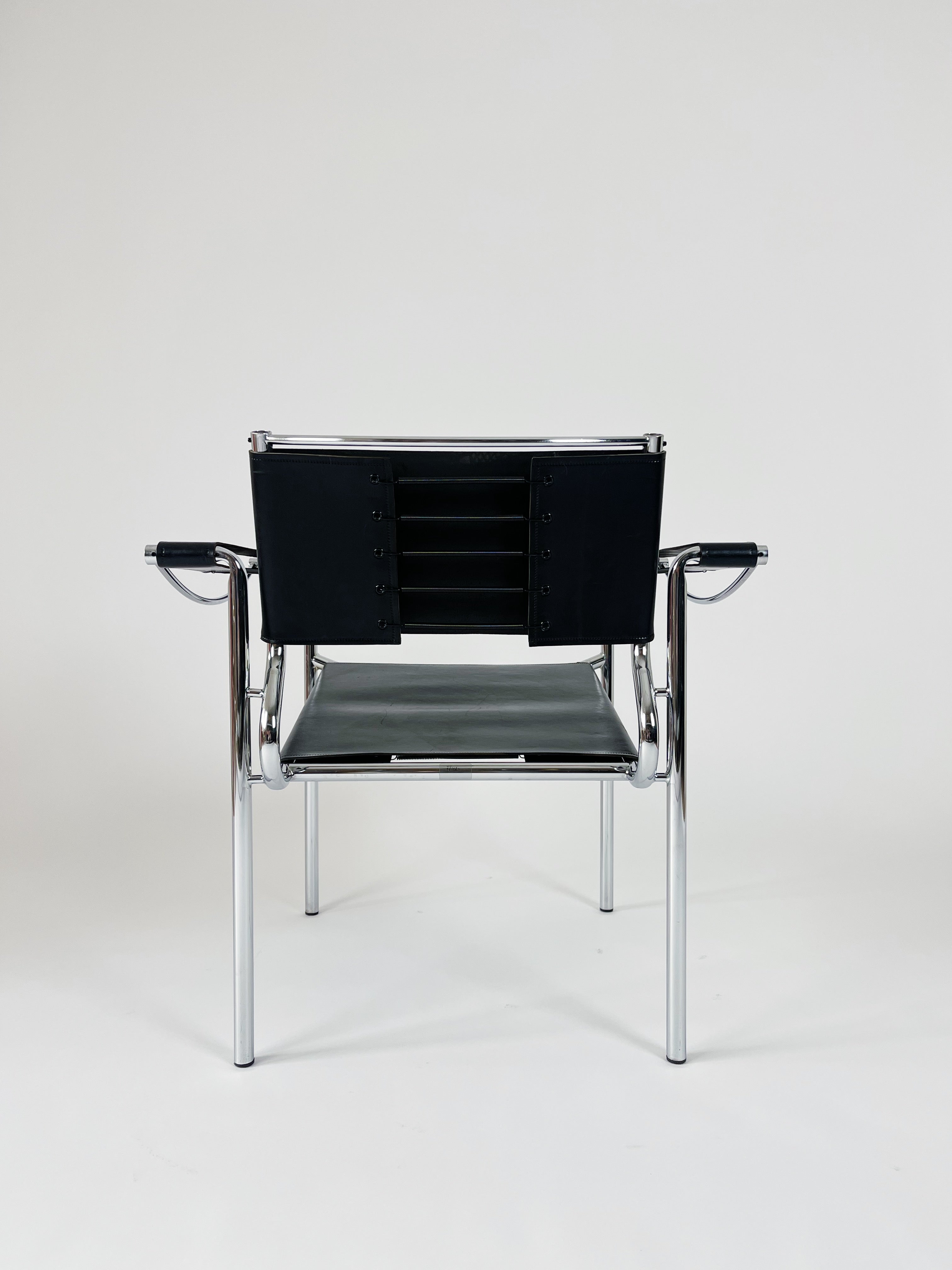 Set of two black saddle leather armchairs and a chrome frame, available per piece or as a set. The leather pieces of the seat, backrest and armrests are cleverly tied together with metal springs. Feels like Giandomenico Belotti decided to design his own version of the 1970s LC1 chair (Le Corbusier) and gave it some more curves for Alias. We thank him for it!