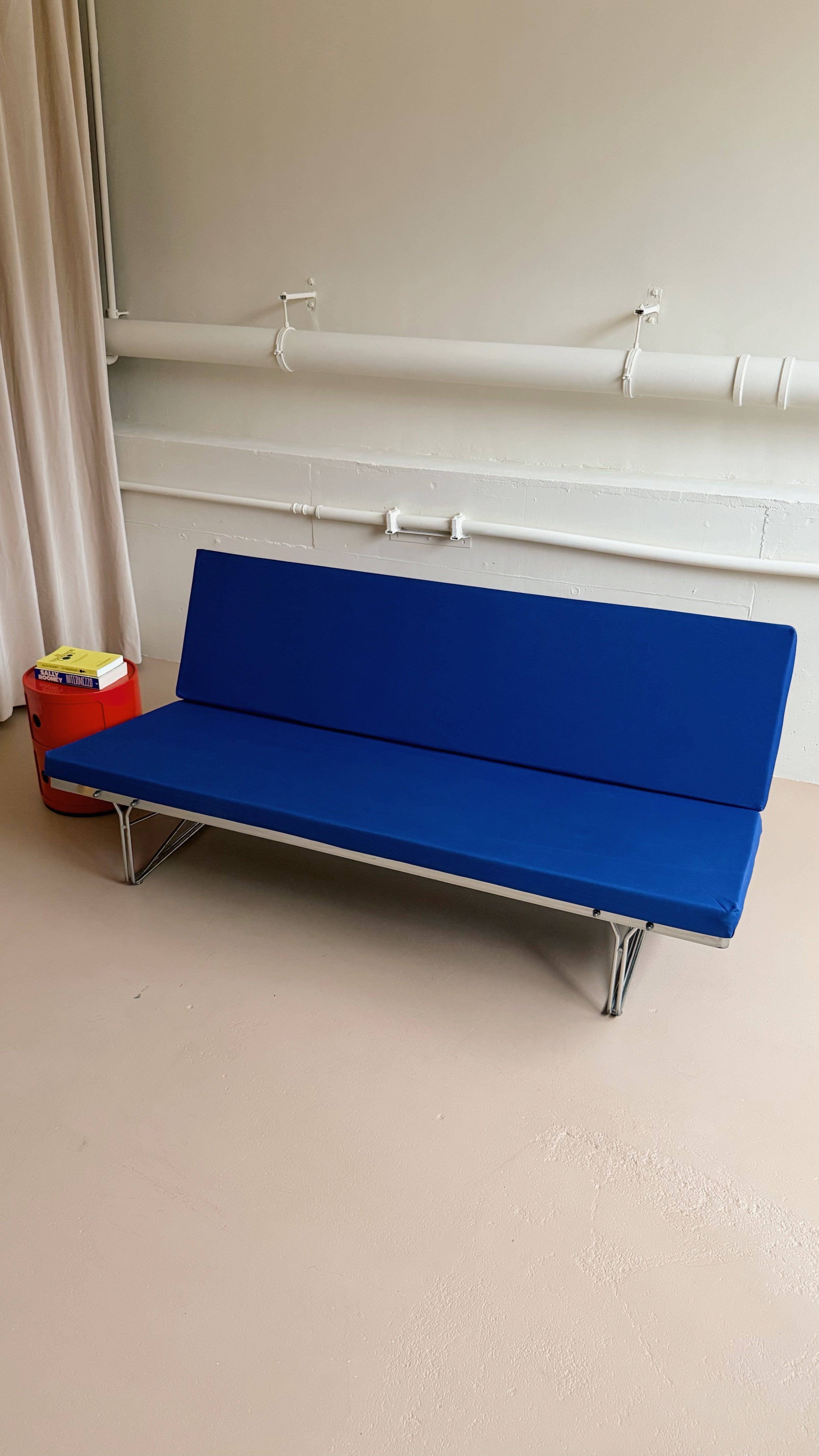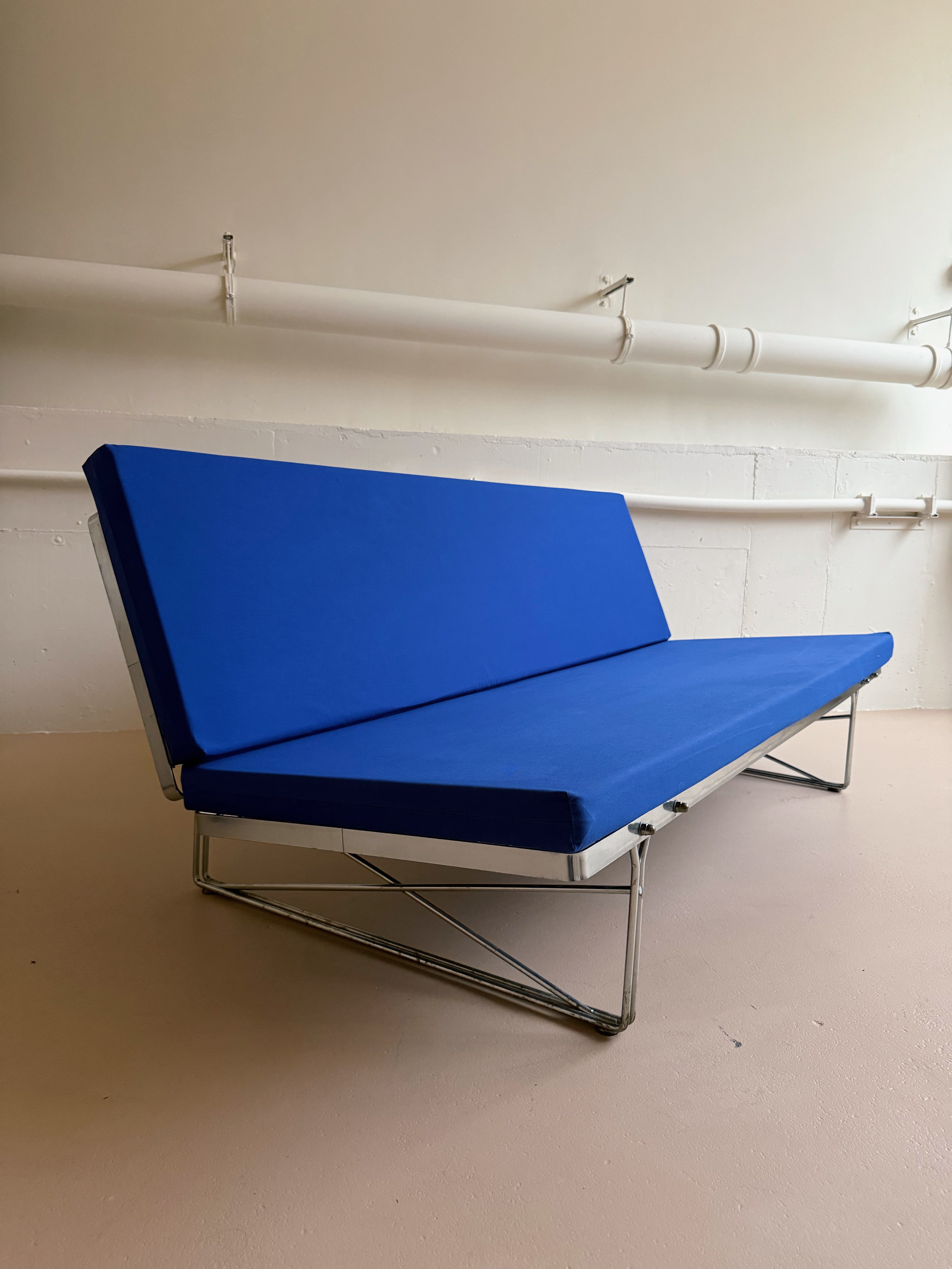 Vintage 'Moment' sofa designed by Niels Gammelgaard for Ikea in the 1980s. The sofa has a silver steel wire frame with cobalt blue cushions. This upholstery of this piece is custom made, with long cushions instead of four. The covers have zippers and can be removed and machine washed.